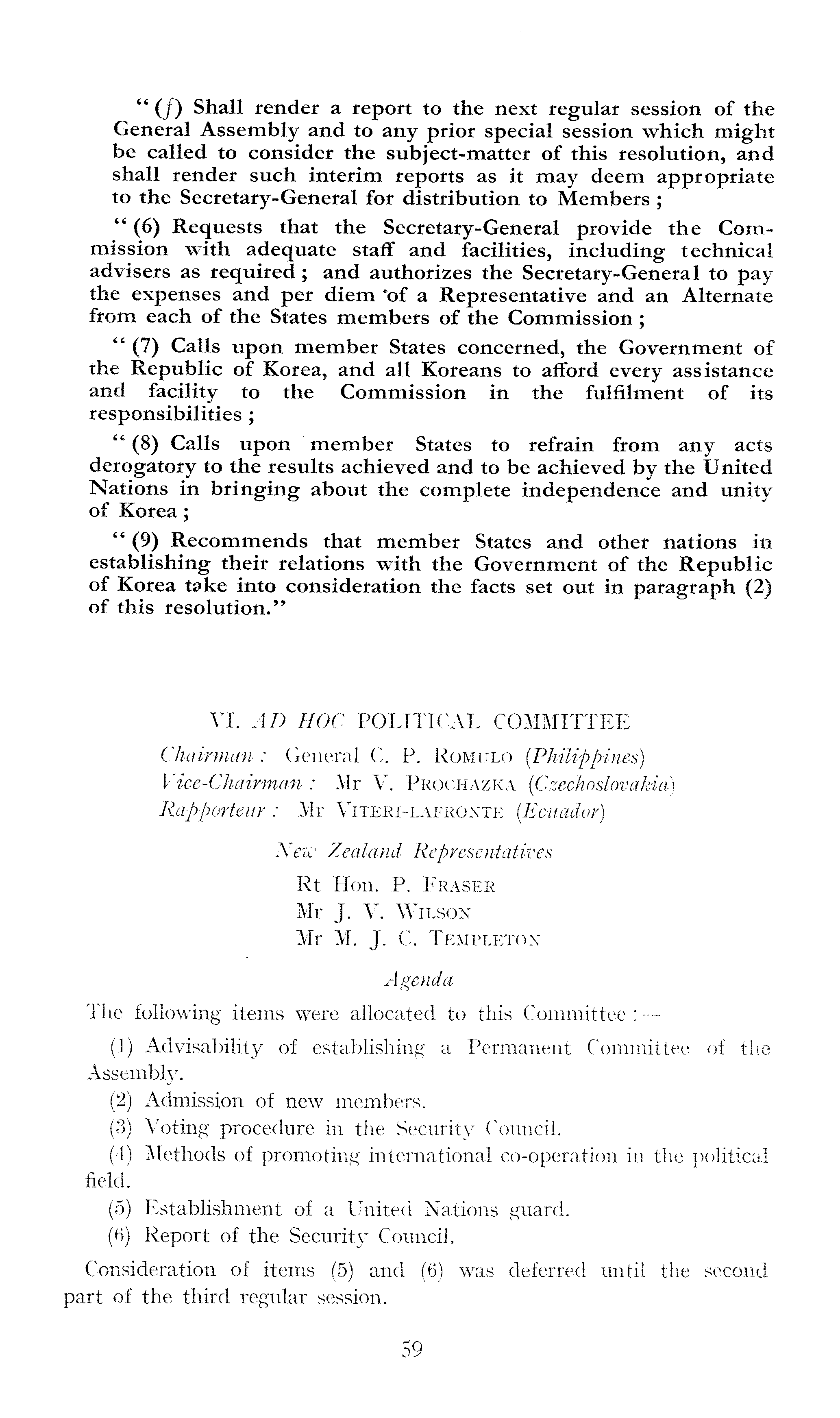 " (/) Shall render a report to the next regular session of the General Assembly and to any prior special session which might be called to consider the subject-matter of this resolution, and shall render such interim reports as it may deem appropriate to the Secretary-General for distribution to Members ; " (6) Requests that the Secretary-General provide the Commission with adequate staff and facilities, including technical advisers as required; and authorizes the Secretary-General to pay the expenses and per diem *of a Representative and an Alternate from each of the States members of the Commission ; ** (7) Calls upon member States concerned, the Government of the Republic of Korea, and all Koreans to afford every assistance and facility to the Commission in the fulfilment of its responsibilities ; " (8) Calls upon member States to refrain from any acts derogatory to the results achieved and to be achieved by the United Nations in bringing about the complete independence and unity of Korea; " (9) Recommends that member States and other nations in establishing their relations with the Government of the Republic of Korea take into consideration the facts set out in paragraph (2) of this resolution." VI. AD HOC POLITICAL COMMITTEE Chairman : General C. P. Romulo (Philippines) Vice-Chairman : Mr V. Prochazka (Czechoslovakia) Rapporteur: Mr Viteri-lafronte (Ecuador) New Zealand Representatives Rt Hon. P. Fraser Mr J. V. Wilson Mr M. J. C. Templeton Agenda The following items were allocated to this Committee : (1) Advisability of establishing a Permanent Committee of the Assembly. (2) Admission of new members. (3) Voting procedure in the Security Council. (4) Methods of promoting international co-operation in the political field. (5) Establishment of a United Nations guard. (6) Report of the Security Council. Consideration of items (5) and (6) was deferred until the second part of the third regular session.