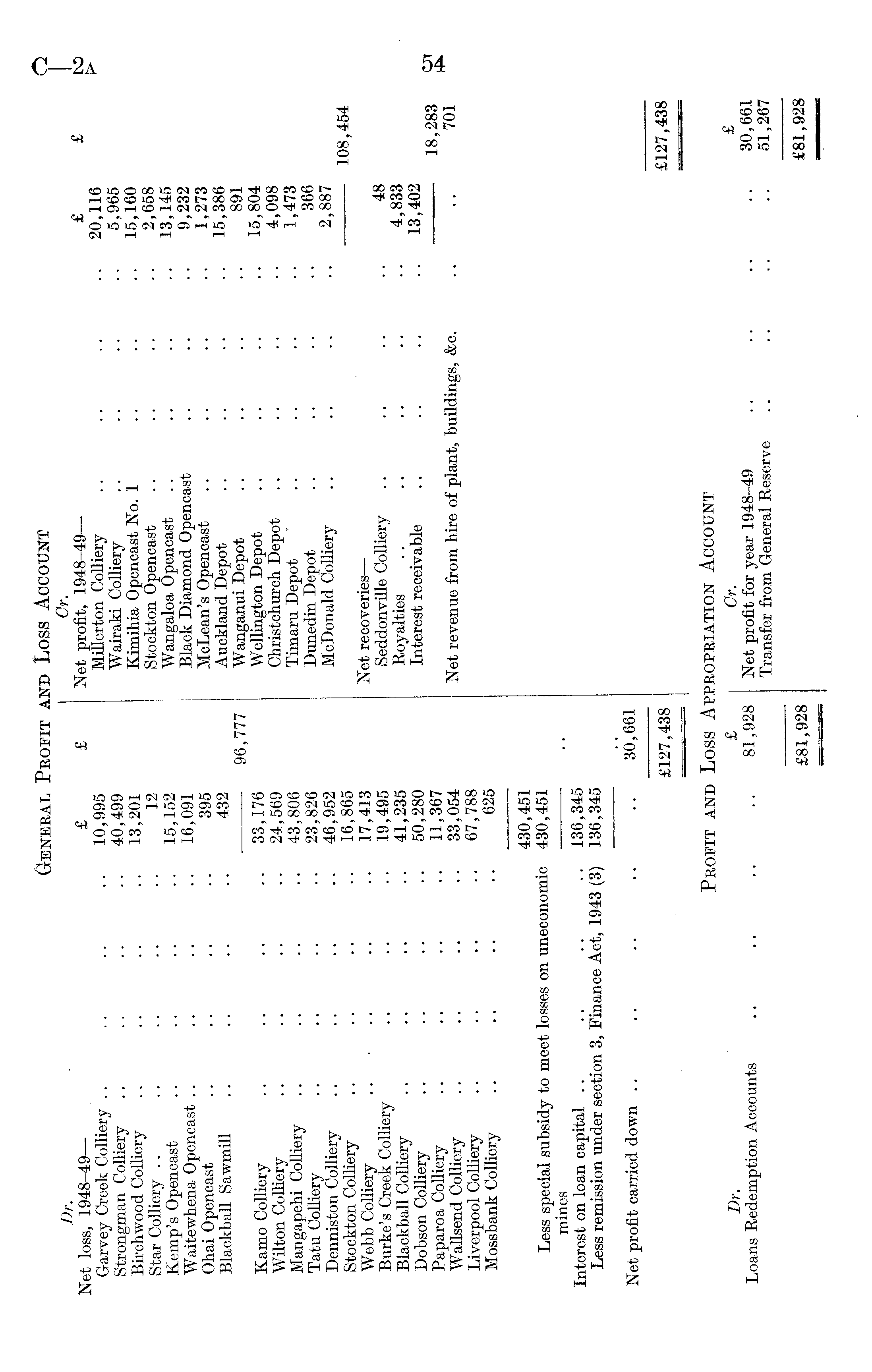 General Profit and Loss Account Dr. Gr - Net loss, 1948-49 , £ £ Net profit, 1948-49 £ £ Garvey Creek Colliery .. .. .. •• 10,995 Millerton Colliery .. .. .. . • 20,116 Strongman Colliery .. .. .. .. 40,499 Wairaki Colliery .. .. .. .. 5,965 Birohwood Colliery .. .. .. .. 13,201 Kimihia Opencast No. 1 .. .. .. 15,1b0 Star Colliery .. .. .. .. •• 12 Stockton Opencast .. .. .. .. 2,658 Kemp's Opencast .. .. .. 15,152 Wangaloa Opencast .. .. .. .. 13,145 Waitewhena Opencast .. .. .. 16,091 Black Diamond Opencast .. .. .. 9,232 Ohai Opencast .. .. 395 McLean's Opencast .. .. .. .. 1,273 Blackball Sawmill .. .. .. .. 432 Auckland Depot .. .. .. .. 15 ,dBb 96,777 Wanganui Depot .. .. .. •• 891 Kamo Colliery .. .. .. .. 33,176 Wellington Depot .. .. .. .. i 5,804 Wilton Colliery .. .. .. .. 24,569 Christchurch Depot .. .. .. .. 4,098 Mangapehi Colliery .. .. 43,806 Timaru Depot ' .. .. .. .. 1,473 Tatu Colliery .. .. .. .. 23,826 Dunedin Depot .. .. .. .. 366 Denniston Colliery .. .. .. ..46,952 McDonald Colliery .. .. .. .. 2,887 Stockton Colliery 16,865 108,454 Webb Colliery .. • .. .. .. 17,413 Net recoveries— Burke's Creek Colliery .. .. .. 19,495 Seddonville Colliery .. .. .. .. 48 Blackball Colliery .. .. .. .. 41,235 Royalties .. .. .. .. • • 4,833 Dobson Colliery .. .. .. .. 50,280 Interest receivable .. .. .. .. 13,402 Paparoa Colliery .. .. .. •• 11,367 »_ Wallsend Colliery .. .. .. .. 33,054 Net revenue from hire of plant, buildings, &c. .. .. 7UI Liverpool Colliery .. .. .. .. 67,788 Mossbank Colliery .. .. .. . • 625 430,451 Less special subsidy to meet losses on uneconomic 430,451 mines Interest on loan capital .. .. .. .. 136,345 Less remission under section 3, Finance Act, 1943 (3) 136,345 Net profit carried down .. .. .. .. .. 30,661 £127,438 £127,438 Profit and Loss Appropriation Account Dr. £ Or.. £ Loans Redemption Accounts .. .. .. .. 81,928 Net profit for year 1948-49 .. .. .. •• 30,661 Transfer from General Reserve .. .. .. .. 51,267 £81,928 £81,928