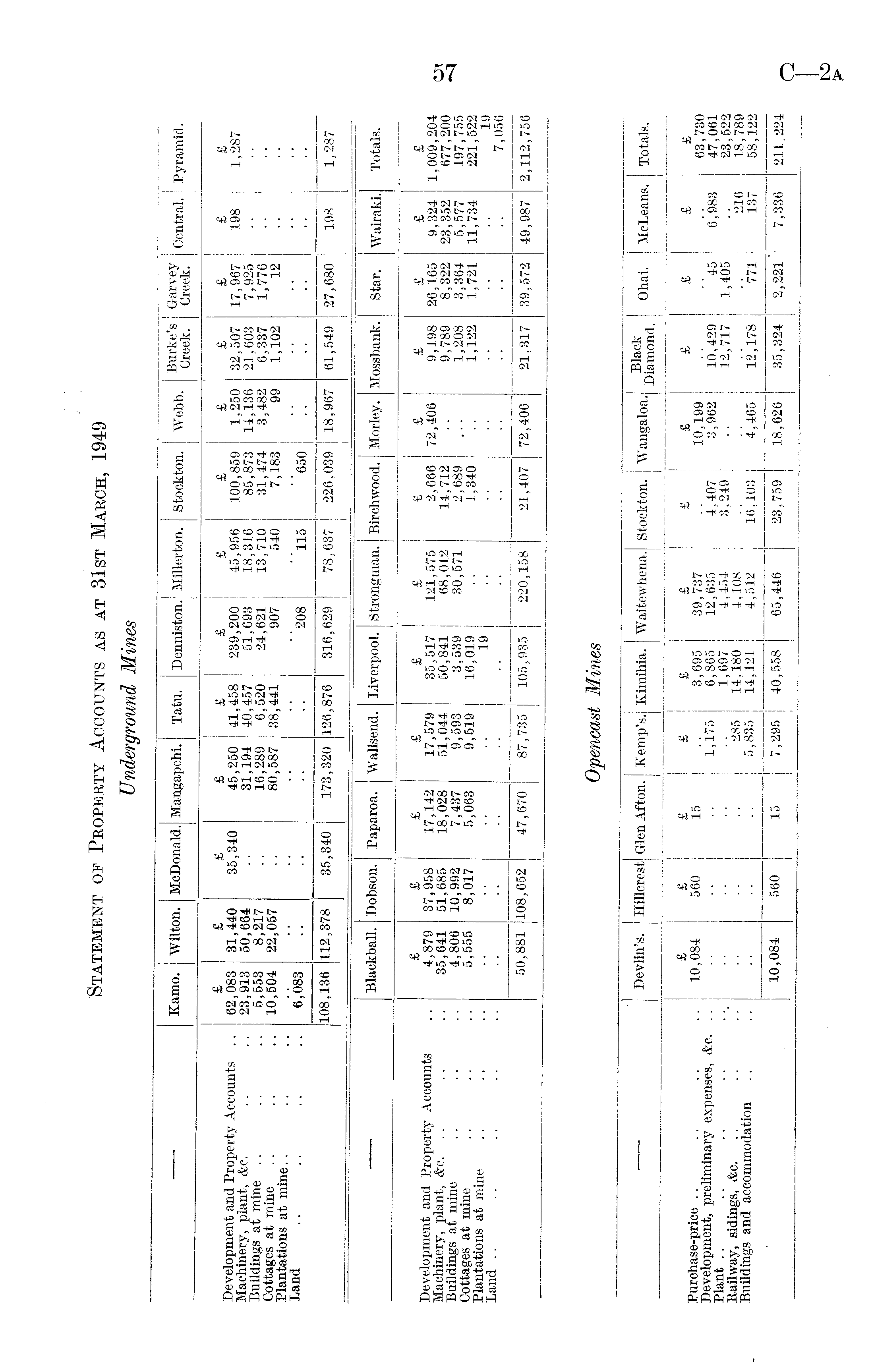 — Kamo. Wilton. McDonald. Mangapehi. Tatu. Denniston. Millerton. Stockton. Webb. Burke's Creek. Garvey Creek. Central. Pyramid. Development and Property Accounts .. Machinery, plant, &c. Buildings at mine Cottages at mine Plantations at mine Land £ 62,083 23,913 5,553 10,504 6^083 £ 31,440 50,664 8,217 22,057 £ 35,340 £ 45,250 31,194 16,289 80,587 £ 41,458 40,457 6,520 38,441 £ 239,200 51,693 24,621 907 ' '208 £ 45,956 18,316 13,710 540 ' 115 £ 100,859 85,873 31,474 7,183 ' 650 £ 1,250 14,136 3,482 99 £ 32,507 21,603 6,337 1,102 £ 17,967 7,925 1,776 12 £ 198 £ 1,287 108,136 112,378 35,340 173,320 126,876 316,629 78,637 226,039 18,967 61,549 27,680 198 1,287 Blackball. Dobson. Paparoa. Wallsend. Liverpool. Strongman. Birchwood. Morley. Mossbank. Star. Wairaki. Totals. Development and Property Accounts Machinery, plant, <ftc. Buildings at mine Cottages at mine Plantations at mine Land .. £ 4,879 35,641 4,806 5,555 £ 37,958 51,685 10,992 8,017 £ 17,142 18,028 7,437 5,063 £ 17,579 51,044 9,593 9,519 £ 35,517 50,841 3,539 16,019 19 £ 121,575 68,012 30,571 £ 2,666 14,712 2,689 1,340 £ 72,406 £ 9,198 9,789 1,208 1,122 £ 26,165 8,322 3,364 1,721 £ 9,324 23,352 5,577 11,734 £ 1,009,204 677,200 197,755 221,522 19 7,056 50,881 108,652 47,670 87,735 105,935 220,158 21,407 72,406 21,317 39,572 49,987 2,112,756 0 Opencast Mines Devlin's. Hillcrest Glen Afton. Kemp's. Kimihia. Waitewhena. Stockton. Wangaloa. Black Diamond. Ohai. McLeans. Totals. Purchase-price Development, preliminary expenses, &c. .. Plant Railway, sidings, <fcc. Buildings and accommodation £ 10,084 £ 560 £ 15 £ ljl75 '285 5,835 £ 3,695 6,865 1,697 14,180 14,121 £ 39,737 12,635 4,454 4,108 4,512 £ 4 j 407 3,249 16 j103 £ 10,199 3,962 4 j 465 £ ■ 12,717 12 j178 £ ' '45 1,405 771 £ 6 j 983 '216 137 £ 63,730 47,061 23,522 18,789 58,122 10,084 560 15 7,295 40,558 65,446 23,759 18,626 35,324 2,221 ' 7,336 211 ; 224