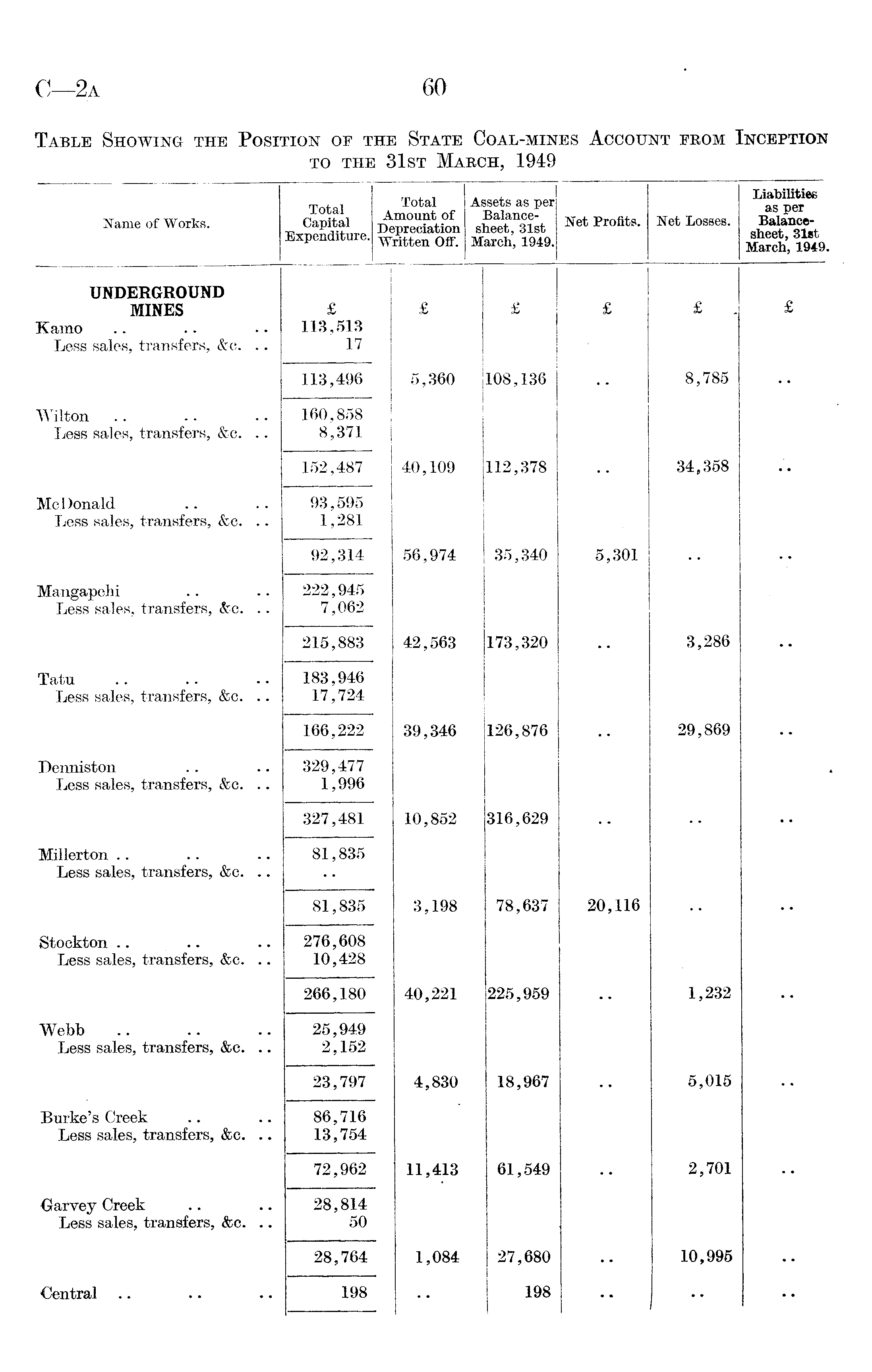 Name of Works. Total Capital Expenditure. Total Amount of Depreciation Written Off. Assets as per Balancesheet, 31st March, 1949. Net Profits. Net Losses. Liabilities as per Balancesheet, 31st March, 1949. UNDERGROUND MINES Kamo Less sales, transfers, &c. .. £ 113,513 17 £ £ £ £ . £ 113,496 5,360 108,136 8,785 Wilton Less sales, transfers, &c. 160,858 8,371 152,487 40,109 112,378 34,358 McDonald Less sales, transfers, &c. .. 93,595 1,281 92,314 56,974 35,340 5,301 Mangapehi Less sales, transfers, &c. .. 222,945 7,062 215,883 42,563 173,320 3,286 Tatu Less sales, transfers, &e. .. 183,946 17,724 166,222 39,346 126,876 29,869 •• Denniston Less sales, transfers, &c. .. 329,477 1,996 327,481 10,852 316,629 •• Millerton Less sales, transfers, &c. .. 81,835 81,835 3,198 78,637 20,116 •• Stockton .. Less sales, transfers, &c. .. 276,608 10,428 266,180 40,221 225,959 •• 1,232 Webb Less sales, transfers, &c. .. 25,949 2,152 23,797 4,830 18,967 5,015 •• Burke's Creek Less sales, transfers, &c. .. 86,716 13,754 72,962 11,413 61,549 •• 2,701 •• Garvey Creek Less sales, transfers, &c. .. 28,814 50 28,764 1,084 27,680 •• 10,995 Central 198 .. 198 . ,