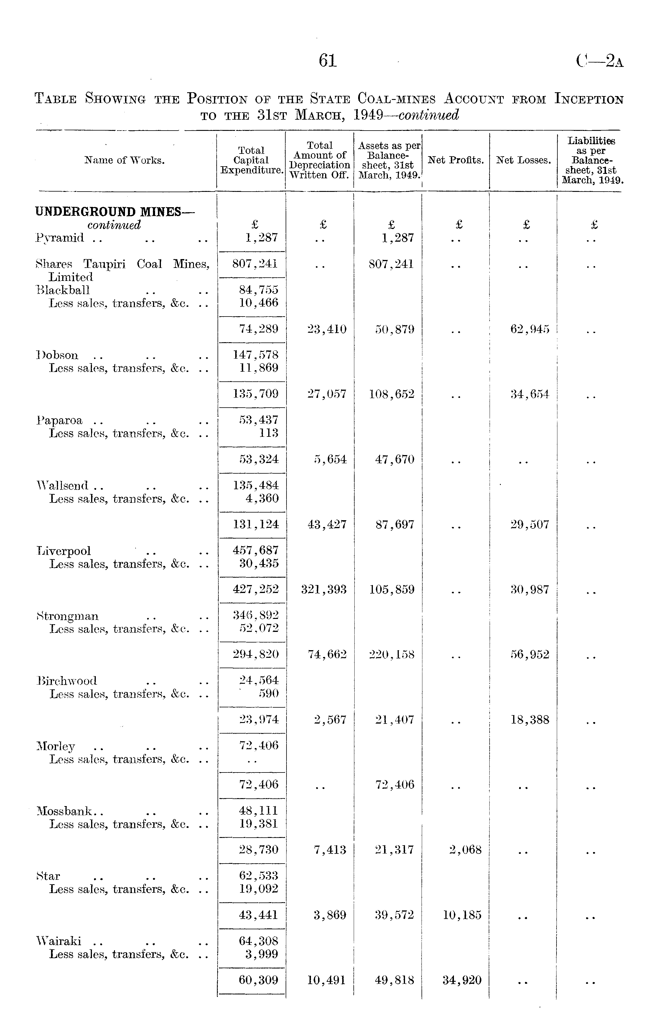 Name of Works. Total Capital Expenditure. Total Amount of Depreciation Written Off. Assets as per Balancesheet, 31st March, 1949. Net Profits. Net Losses. Liabilities as per Balancesheet, 31st March, 1949. UNDERGROUND MINES— continued Pyramid £ 1,287 £ £ 1,287 £ £ £ Shares Taupiri Coal Mines, Limited Blackball Less sales, transfers, &c. .. 807,241 807,241 84,755 10,466 74,289 23,410 50,879 62,945 Dobson Less sales, transfers, &c. .. 147,578 11,869 135,709 27,057 108,652 34,654 Paparoa Less sales, transfers, &c. .. 53,437 113 53,324 5,654 47,670 Wallsend Less sales, transfers, &e. .. 135,484 4,360 131,124 43,427 87,697 29,507 Liverpool * .. Less sales, transfers, &c. .. 457,687 30,435 427,252 321,393 105,859 30,987 Strongman Less sales, transfers, &c. .. 346,892 52,072 294,820 74,662 220,158 56,952 Birchwood Less sales, transfers, &c. .. ' 24,564 ' 590 . 23,974 2,567 21,407 18,388 Morley Less sales, transfers, &c. .. 72,406 72,406 72,406 •• Mossbank.. Less sales, transfers, &c. .. 48,111 19,381 28,730 7,413 21,317 2,068 Star 4 . Less sales, transfers, &c. .. 62,533 19,092 43,441 3,869 39,572 10,185 •• •• Wairaki Less sales, transfers, &c. .. 64,308 3,999 60,309 10,491 49,818 34,920 ••
