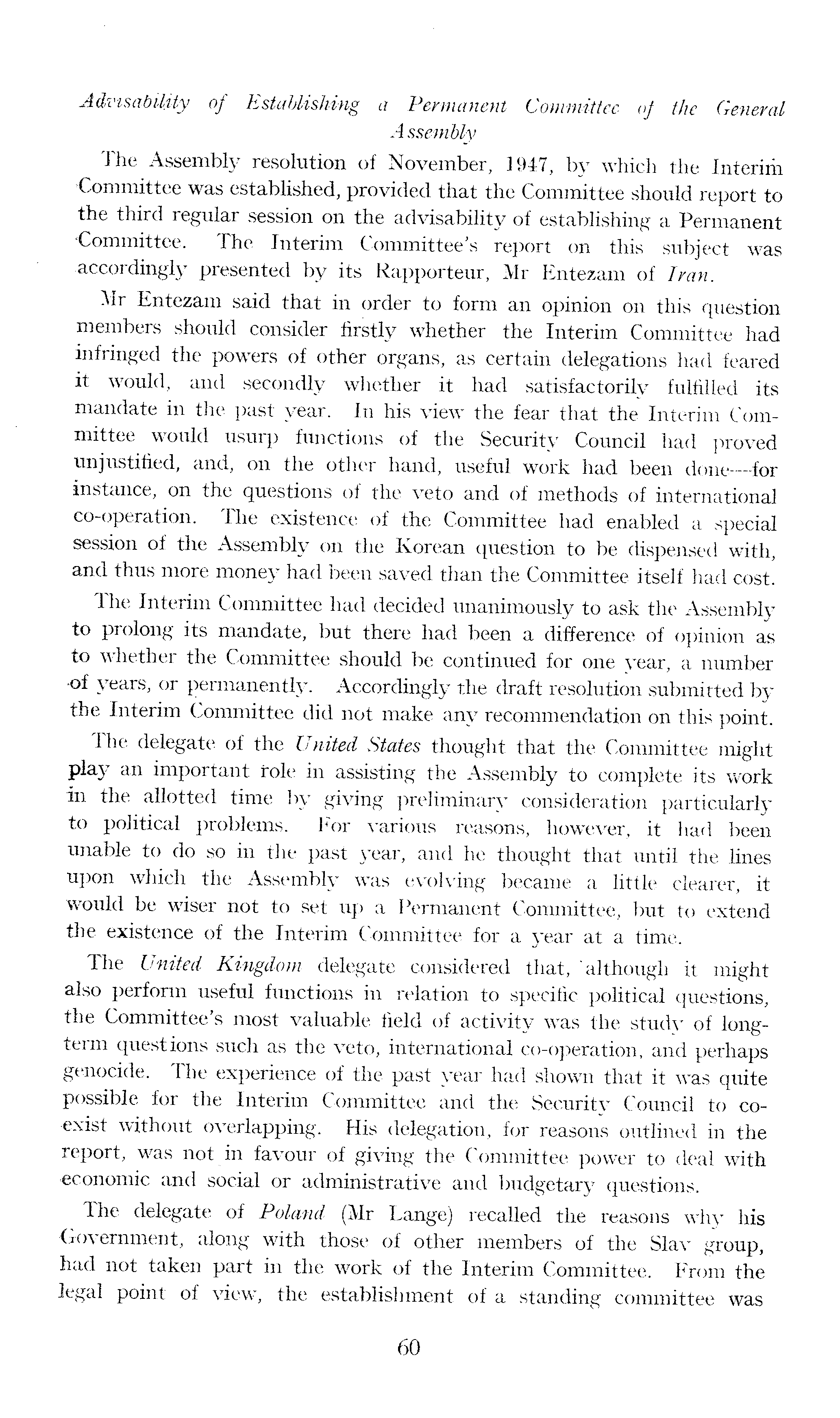 Advisability of Establishing a Permanent Committee of the General Assembly The Assembly resolution of November, 1947, by which the Interim Committee was established, provided that the Committee should report to the third regular session on the advisability of establishing a Permanent Committee. The Interim Committee's report on this subject was accordingly presented by its Rapporteur, Mr Entezam of Iran. Mr Entezam said that in order to form an opinion on this question members should consider firstly whether the Interim Committee had infringed the powers of other organs, as certain delegations had feared it would, and secondly whether it had satisfactorily fulfilled its mandate in the past year. In his view the fear that the Interim Committee would usurp functions of the Security Council had proved unjustified, and, on the other hand, useful work had been done—-for instance, on the questions of the veto and of methods of international co-operation. The existence of the Committee had enabled a special session of the Assembly on the Korean question to be dispensed with, and thus more money had been saved than the Committee itself had cost. The Interim Committee had decided unanimously to ask the Assembly to prolong its mandate, but there had been a difference of opinion as to whether the Committee should be continued for one year, a number ■of years, or permanently. Accordingly the draft resolution submitted by the Interim Committee did not make any recommendation on this point. The delegate of the United States thought that the Committee might play an important role in assisting the Assembly to complete its work in the allotted time by giving preliminary consideration particularly to political problems. For various reasons, however, it had been unable to do so in the past year, and he thought that until the lines upon which the Assembly was evolving became a little clearer, it would be wiser not to set up a Permanent Committee, but to extend the existence of the Interim Committee for a year at a time. The United Kingdom delegate considered that, 'although it might also perform useful functions in relation to specific political questions, the Committee's most valuable field of activity was the study of longterm questions such as the veto, international co-operation, and perhaps genocide. The experience of the past year had shown that it was quite possible for the Interim Committee and the Security Council to coexist without overlapping. His delegation, for reasons outlined in the report, was not in favour of giving the Committee power to deal with economic and social or administrative and budgetary questions. The delegate of Poland (Mr Lange) recalled the reasons why his ■Government, along with those of other members of the Slav group, had not taken part in the work of the Interim Committee. From the legal point of view, the establishment of a standing committee was