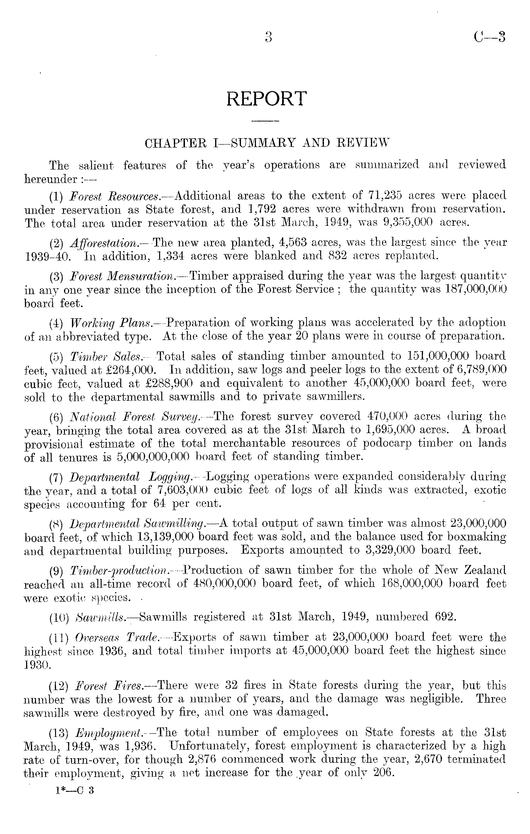 REPORT CHARTER I—SUMMARY AND REVIEW The salient features' of the year's operations are summarized and reviewed hereunder:— (1) Forest Resources. —Additional areas to the extent of 71,235 acres were placed under reservation as State forest, and 1,792 acres were withdrawn from reservation. The total area under reservation at the 31st March, 1949, was 9,355,000 acres. (2) Afforestation. —The new area planted, 4,563 acres, was the largest since the year 1939-40. In addition, 1,334 acres were blanked and 832 acres replanted. (3) Forest Mensuration. —Timber appraised during the year was the largest quantity in any one year since the inception of the Forest Service ; the quantity was 187,000,000 board feet. (4) Working Plans. —Preparation of working plans was accelerated by the adoption of an abbreviated type. At the close of the year 20 plans were in course of preparation. (5) Timber Sales. —Total sales of standing timber anwunted to 151,000,000 board feet, valued at £264,000. In addition, saw logs and peeler logs to the extent of 6,789,000 cubic feet, valued at £288,900 and equivalent to another 45,000,000 board feet, were sold to the departmental sawmills and to private sawmillers. (6) National Forest Survey.—The forest survey covered 470,000 acres during the year, bringing the total area covered as at the 31st March to 1,695,000 acres. A broad provisional estimate of the total merchantable resources of podocarp timber on lands of all tenures is 5,000,000,000 board feet of standing timber. (7) Departmental Logging.—Logging operations were expanded considerably during the year, and a total of 7,603,000 cubic feet of logs of all kinds was extracted, exotic species accounting for 64 per cent. (8) Departmental Sawmilling.—A total output of sawn timber was almost 23,000,000 board feet, of which 13,139,000 board feet was sold, and the balance used for boxmaking and departmental building purposes. Exports amounted to 3,329,000 board feet. (9) Timber-production. —Production of sawn timber for the whole of New Zealand reached an all-time record of 480,000,000 board feet, of which 168,000,000 board feet were exotic species. - (10) Sawmills. —Sawmills registered at 31st March, 1949, numbered 692. (11) Overseas Trade. —Exports of sawn timber at 23,000,000 board feet were the highest since 1936, and total timber imports at 45,000,000 board feet the highest since 1930. (12) Forest Fires. —There were 32 fires in State forests during the year, but this number was the lowest for a number of years, and the damage was negligible. Three sawmills were destroyed by fire, and one was -damaged. (13) Employment. —The total number of employees on State forests at the 31st March, 1949, was 1,936. Unfortunately, forest employment is characterized by a high rate of turn-over, for though 2,876 commenced work during the year, 2,670 terminated their employment, giving a net increase for the .year of only 206.