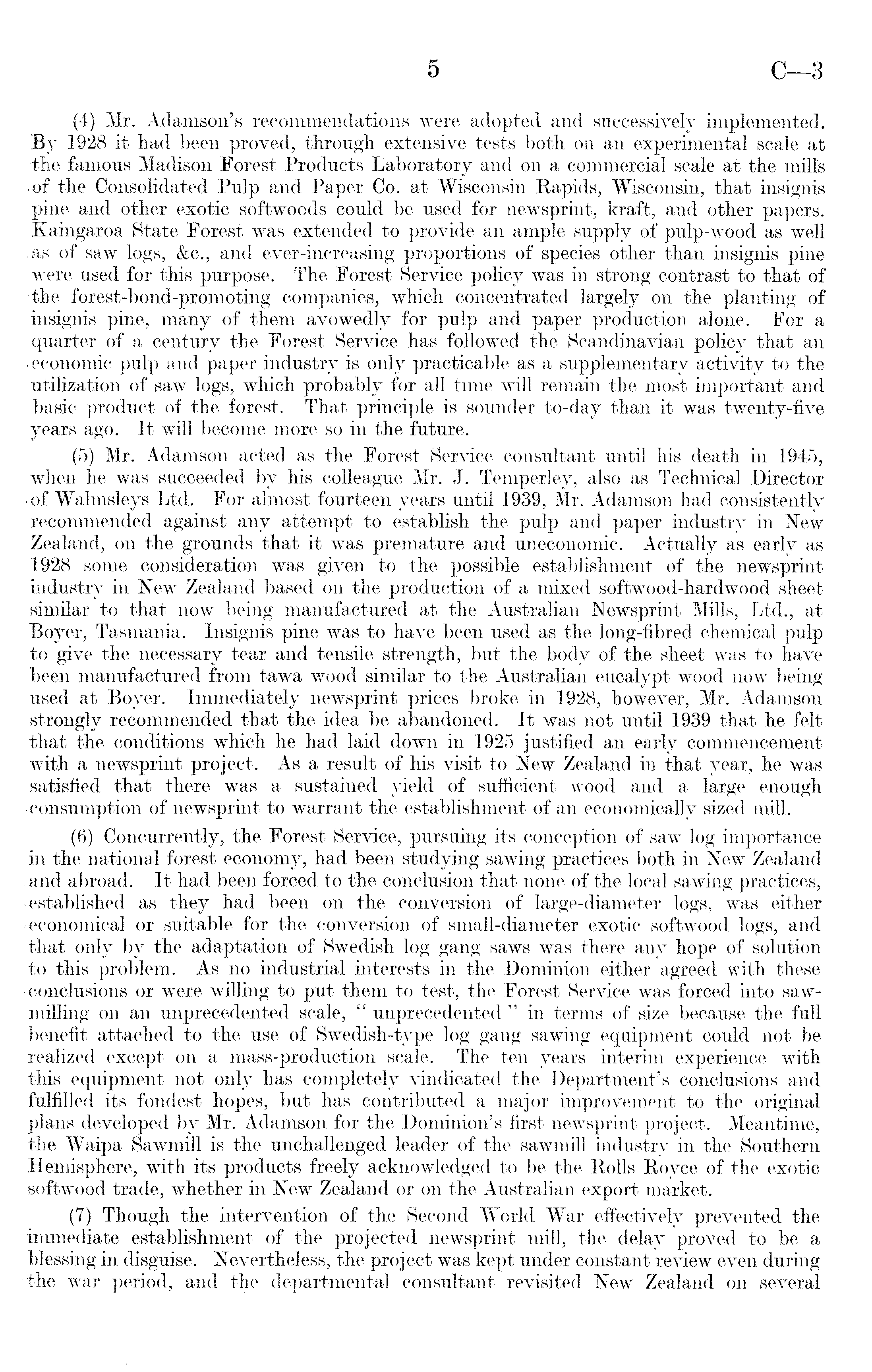 (4) Mr. Adamson's recommendations were adopted and successively implemented. By 1928 it had been proved, through extensive tests both 011 an experimental scale at the famous Madison Forest Products Laboratory and on a commercial scale at the mills •of the Consolidated Pulp and Paper Co. at Wisconsin Rapids, Wisconsin, that insignis pine and other exotic softwoods could be used for newsprint, kraft, and other papers. Kaingaroa State Forest was extended to provide an ample supply of pulp-wood as well .as of saw logs, &c., and ever-increasing proportions of species other than insignis pine were used for this purpose. The Forest Service policy was in strong contrast to that of -the forest-bond-promoting companies, which concentrated largely on the planting of insignis pine, many of them avowedly for pulp and paper production alone. For a •quarter of a century the Forest Service has followed the Scandinavian policy that an -economic pulp and paper industry is only practicable as a supplementary activity to the utilization of saw logs, which probably for all time will remain the most important and basic product of the forest. That principle is sounder to-day than it was twenty-five years ago. It will become more so in the future. (5) Mr. Adamson acted as the Forest Service consultant until his death in 1945, when he was succeeded by his colleague Mr. J. Temperley, also as Technical Director of Walmsleys Ltd. For almost fourteen years until 1939, Mr. Adamson had consistently recommended against any attempt to establish the pulp and paper industry in New Zealand, on the grounds that it was premature and uneconomic. Actually as early as 1928 some consideration was given to the possible establishment of the newsprint industry in New Zealand based on the production of a mixed softwood-hardwood sheet similar to that now being manufactured at the Australian Newsprint Mills, Ltd., at Boyer, Tasmania. Insignis pine was to have been used as the long-fibred. chemical pulp to give the necessary tear and tensile strength, but the body of the sheet was to have been manufactured from tawa wood similar to the Australian eucalypt wood now being used at Boyer. Immediately newsprint prices broke in 1928, however, Mr. Adamson strongly recommended that the idea be abandoned. It was not until 1939 that he felt that the conditions which he had laid down in 1925 justified an early commencement with a newsprint project. As a result of his visit to New Zealand in that year, he was satisfied that there was a sustained yield of sufficient wood and a large enough -consumption of newsprint to warrant the establishment of an economically sized mill. (6) Concurrently, the Forest Service, pursuing its conception of saw log importance in the national forest economy, had been studying sawing practices both in New Zealand and abroad. It had been forced to the conclusion that none of the local sawing practices, •established as they had been on the conversion of large-diameter logs, was either •economical or suitable for the conversion of small-diameter exotic softwood logs, and that only by the adaptation of Swedish log gang saws was there any hope of solution to this problem. As no industrial interests in the Dominion either agreed with these -conclusions or were willing to put them to test, the Forest Service was forced into sawmilling on an unprecedented scale, " unprecedented " in terms of size because the full benefit attached to the use of Swedish-type log gang sawing equipment could not be realized except on a mass-production scale. The ten years interim experience with this equipment not only has completely vindicated the Department's conclusions and fulfilled its' fondest hopes, but has contributed a major improvement to the original plans developed by Mr. Adamson for the Dominion's first newsprint project. Meantime, the Waipa Sawmill is the unchallenged leader of the sawmill industry in the Southern Hemisphere, with its products freely acknowledged to be the Rolls Royce of the exotic softwood trade, whether in New Zealand or on the Australian export market. (7) Though the intervention of the Second World War effectively prevented the immediate establishment of the projected newsprint mill, the delay proved to be a blessing in disguise. Nevertheless, the project was kept under constant review even during the war period, and the departmental consultant revisited New Zealand on several