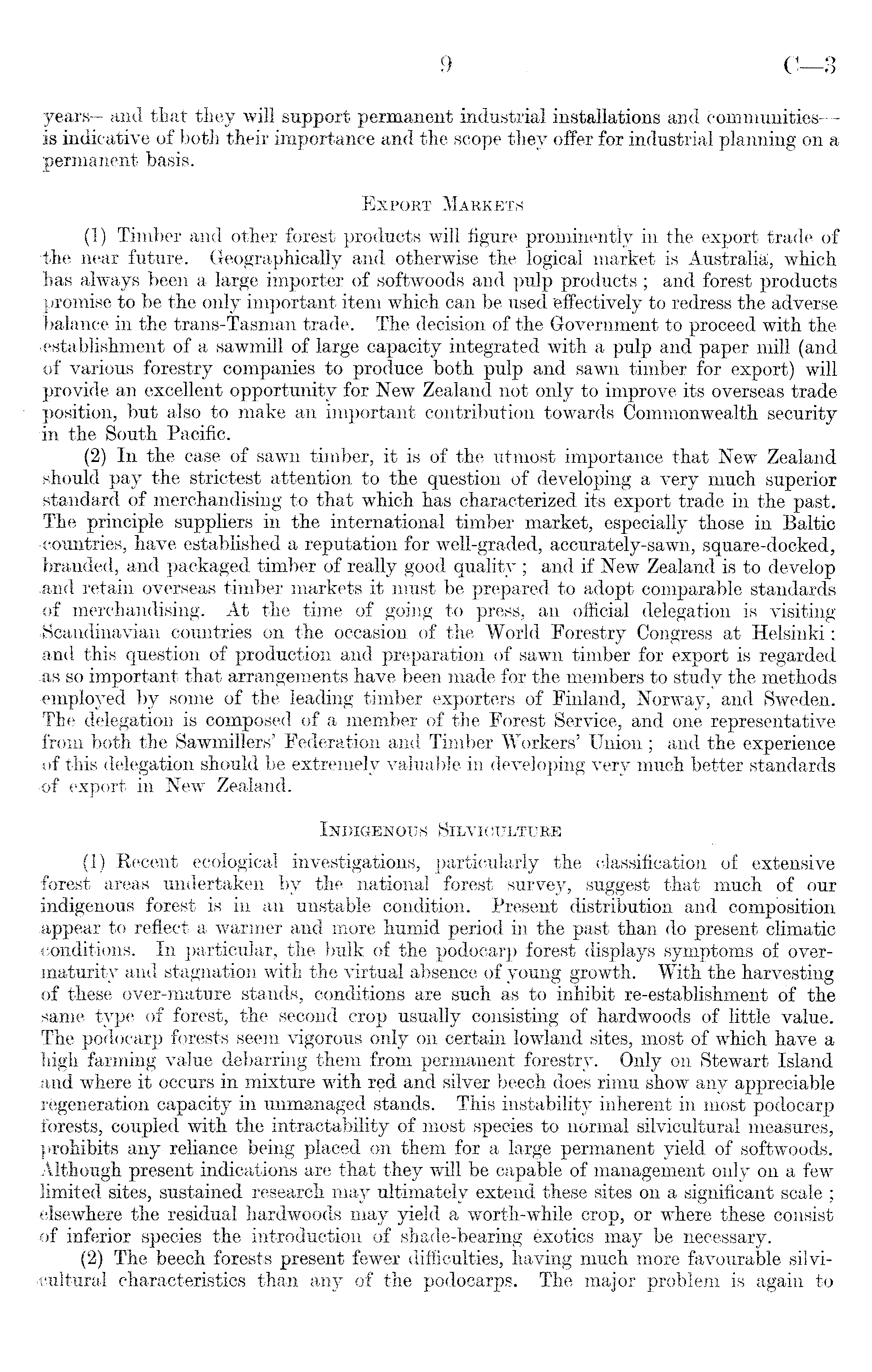 years —and that they will support permanent industrial installations and communities — is indicative of both their importance and the scope they offer for industrial planning on a permanent basis. Export Markets (1) Timber and other forest products will figure prominently in the export trade of the near future. Geographically and otherwise the logical market is Australia, which has always been a large importer of softwoods and pulp products ; and forest products promise to be the only important item which can be used effectively to redress the adverse balance in the trans-Tasman trade. The decision of the Government to proceed with the •establishment of a sawmill of large capacity integrated with a pulp and paper mill (and of various forestry companies to produce both pulp and sawn timber for export) will provide an excellent opportunity for New Zealand not only to improve its overseas trade position, but also to make an important contribution towards Commonwealth security in the South Pacific. (2) In the case of sawn timber, it is of the utmost importance that New Zealand should pay the strictest attention to the question of developing a very much superior standard of merchandising to that which has characterized its export trade in the past. The principle suppliers in the international timber market, especially those in Baltic -countries, have established a reputation for well-graded, accurately-sawn, square-docked, branded, and packaged timber of really good quality ; and if New Zealand is to develop and retain overseas timber markets it must be prepared to adopt comparable standards •of merchandising. At the time of going to press, an official delegation is visiting ►Scandinavian countries on the occasion of the World Forestry Congress at Helsinki; .and this question of production and preparation of sawn timber for export is regarded .as so important that arrangements have been made for the members to study the methods •employed by some of the leading timber exporters of Finland, Norway, and Sweden. The delegation is composed of a member of the Forest Service, and one representative from both the Sawmillers' Federation and Timber Workers' Union ; and the experience •of this delegation should be extremely valuable in developing very much better standards ■of export in New Zealand. Indigenous Silviculture ft (1) Recent ecological investigations, particularly the classification of extensive forest areas undertaken by the national forest survey, suggest that much of our indigenous forest is in an unstable condition. Present distribution and composition appear to reflect a warmer and more humid period in the past than do present climatic conditions. In particular, the bulk of the podocarp forest displays symptoms of overmaturity and stagnation with the virtual absence of young growth. With the harvesting of these over-mature stands, conditions are such as to inhibit re-establishment of the same type of forest, the second crop usually consisting of hardwoods of little value. The podocarp forests seem vigorous only on certain lowland sites, most of which have a high farming value debarring them from permanent forestry. Only on Stewart Island and where it occurs in mixture with red and silver beech does rimu show any appreciable regeneration capacity in unmanaged stands. This instability inherent in most podocarp forests, coupled with the intractability of most species to normal silvicultural measures, prohibits any reliance being placed on them for a large permanent yield of softwoods. Although present indications are that they will be capable of management only on a few limited sites, sustained research may ultimately extend these sites on a significant scale ; •elsewhere the residual hardwoods may yield a worth-while crop, or where these consist of inferior species the introduction of shade-bearing exotics may be necessary. (2) The beech forests present fewer difficulties, having much more favourable silvicultural characteristics than any of the podocarps. The major problem is again to