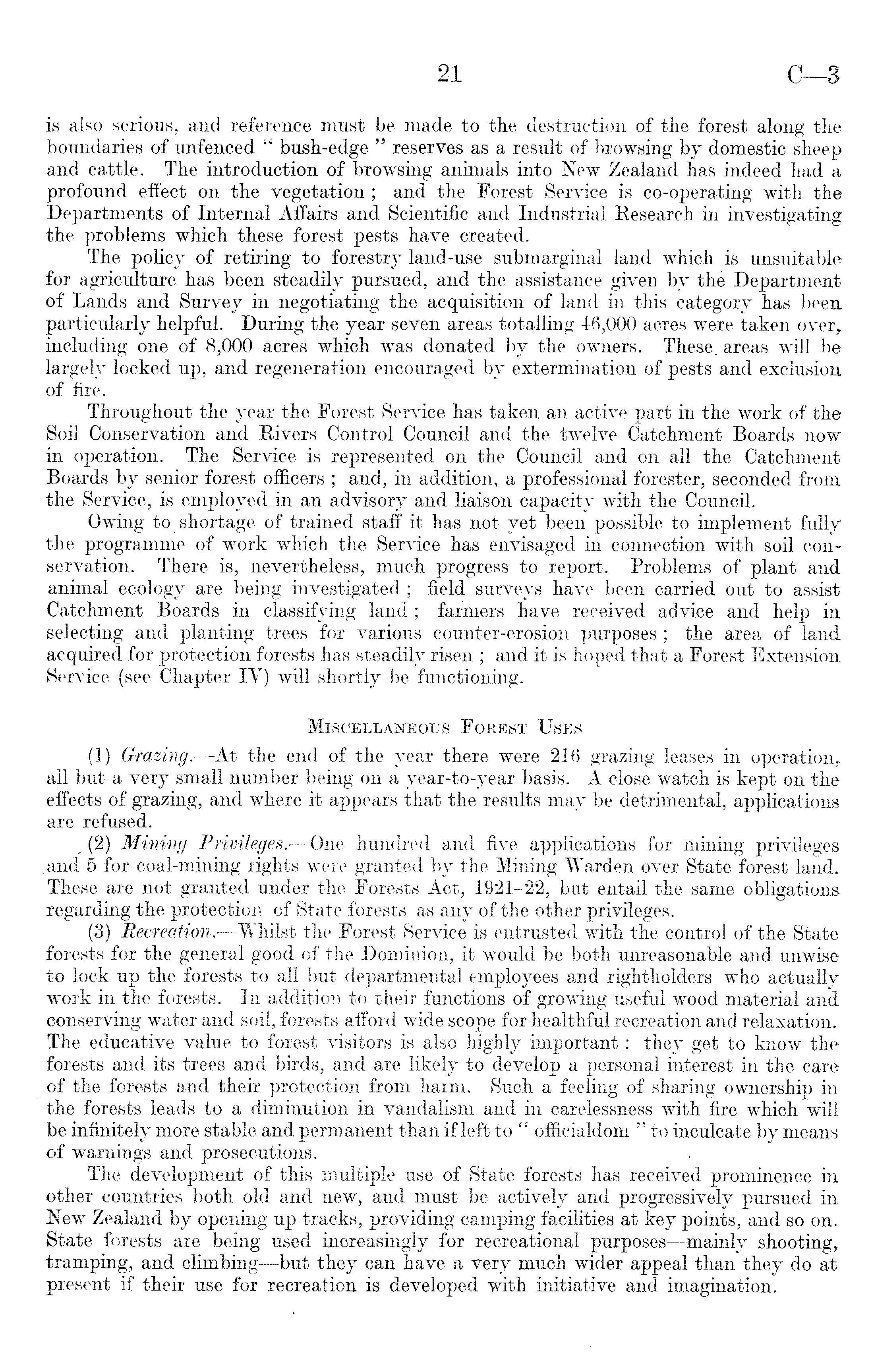 is also serious, and reference must be made to the destruction of the forest along the boundaries of unfenced " bush-edge " reserves as a result of browsing by domestic sheep and cattle. The introduction of browsing animals into New Zealand has indeed had a profound effect on the vegetation ; and the Forest Service is co-operating with the Departments of Internal Affairs and Scientific and Industrial Research in investigating the problems which these forest pests have created. The policy of retiring to forestry land-use submarginal land which is unsuitable for agriculture has been steadily pursued, and the assistance given by the Department of Lands and Survey in negotiating the acquisition of land in this category has been particularly helpful. During the year seven areas totalling 46,000 acres were taken over, including one of 8,000 acres which was donated by the owners. These, areas will be largely locked up, and regeneration encouraged by extermination of pests and exclusion of fire. Throughout the year the Forest Service has taken an active part in the work of the Soil Conservation and Rivers Control Council and the twelve Catchment Boards now in operation. The Service is represented on the Council and on all the Catchment Boards by senior forest officers ; and, in addition, a professional forester, seconded from the Service, is employed in an advisory and liaison capacity with the Council. Owing to shortage of trained staff it has not yet been possible to implement fully the programme of work which the Service has envisaged in connection with soil conservation. There is, nevertheless, much progress to report. Problems of plant and animal ecology are being investigated ; field surveys have been carried out to assist Catchment Boards in classifying land ; farmers have received advice and help in selecting and planting trees for various counter-erosion purposes ; the area of land acquired for protection forests has steadily risen ; and it is hoped that a Forest Extension Service (see Chapter IV) will shortly be functioning. Miscellaneous Forest Uses (1) Grazing.—At the end of the year there were 216 grazing leases in operation, all but a very small number being on a year-to-year basis. A close watch is kept on the effects of grazing, and where it appears that the results may be detrimental, applications are refused. , (2) Mining Privileges.—One hundred and five applications for mining privileges and 5 for coal-mining rights were granted by the Mining Warden over State forest land. These are not granted under the Forests Act, 1921-22, but entail the same obligations regarding the protection of State forests as any of the other privileges. (3) Recreation.—Whilst the Forest Service is entrusted with the control of the State forests for the general good of the Dominion, it would be both unreasonable and unwise to lock up the forests to all but departmental employees and rightholders who actually work in the forests. In addition to their functions of growing useful wood material and conserving water and soil, forests afford wide scope for healthful recreation and relaxation. The educative value to forest visitors is also highly important: they get to know the forests and its trees and birds, and are likely to develop a personal interest in the care of the forests and their protection from harm. Such a feeling of sharing ownership in the forests leads to a diminution in vandalism and in carelessness with fire which will be infinitely more stable and permanent than if left to " officialdom " to inculcate by means of warnings and prosecutions. The development of this multiple use of State forests has received prominence in other countries both old and new, and must be actively and progressively pursued in New Zealand by opening up tracks, providing camping facilities at key points, and so on. State forests are being used increasingly for recreational purposes—mainly shooting, tramping, and climbing—but they can have a very much wider appeal than they do at present if their use for recreation is developed with initiative and imagination.