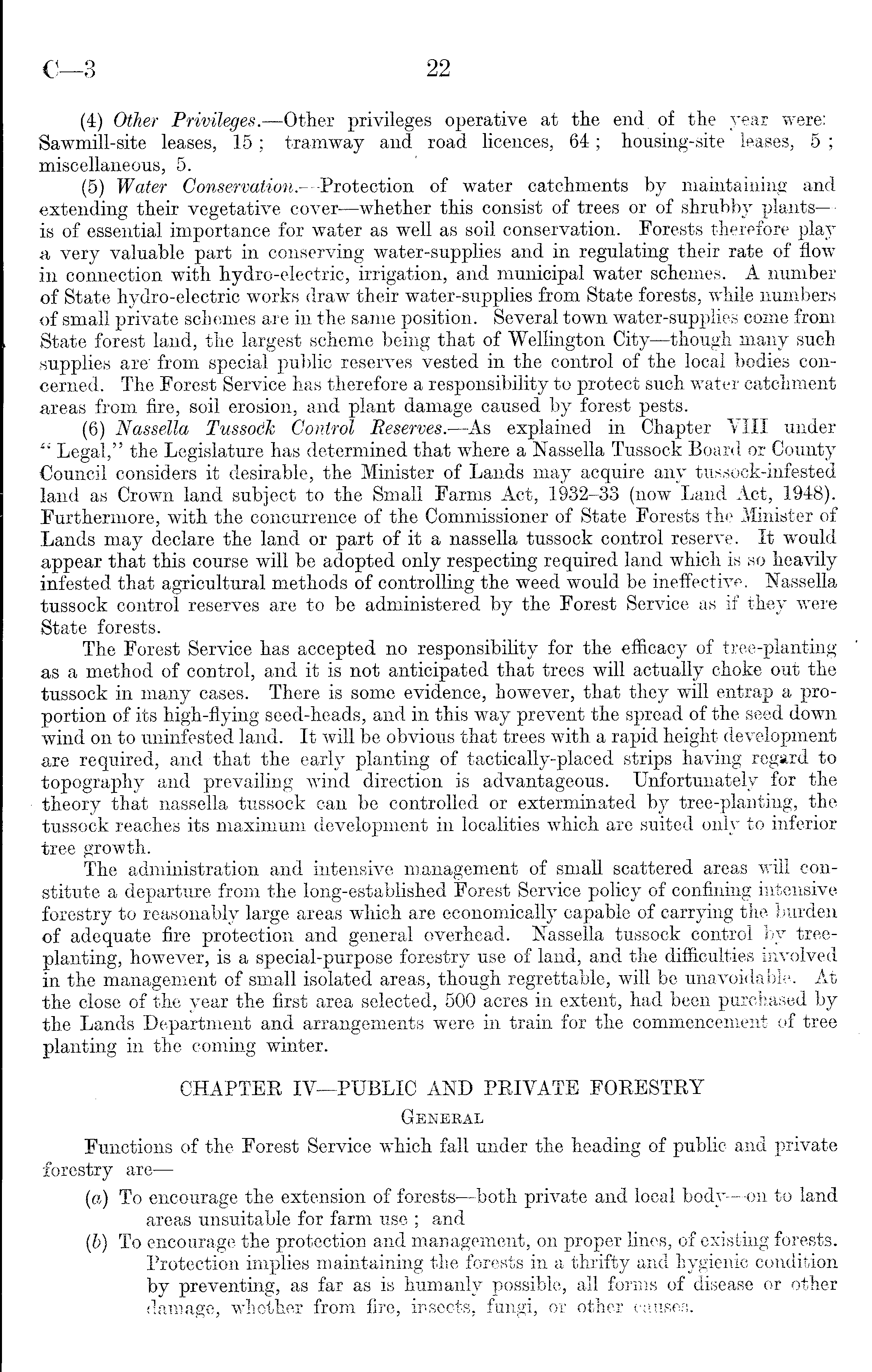 (4) Other Privileges. —Other privileges operative at tlie end of the year were: Sawmill-site leases, 15; tramway and road licences, 64; housing-site leases, 5 ; miscellaneous, 5. (5) Water Conservation.—Protection of water catchments by maintaining and extending their vegetative cover —whether this consist of trees or of shrubby plantsis of essential importance for water as well as soil conservation. Forests therefore play a very valuable part in conserving water-supplies and in regulating their rate of flow in connection with hydro-electric, irrigation, and municipal water schemes. A number of State hydro-electric works draw their water-supplies from State forests, while numbers of small private schemes are in the same position. Several town water-supplies come from State forest land, the largest scheme being that of Wellington City—though many such supplies are' from special public reserves vested in the control of the local bodies concerned. The Forest Service has therefore a responsibility to protect such water catchment areas from fire, soil erosion, and plant damage caused by forest pests. (6) Nassella Tussock Control Reserves. —As explained in Chapter VIII under " Legal," the Legislature has determined that where a Nassella Tussock Board or County Council considers it desirable, the Minister of Lands may acquire any tussock-infested land as Crown land subject to the Small Farms Act, 1932-33 (now Land Act, 1948). Furthermore, with the concurrence of the Commissioner of State Forests the Minister of Lands may declare the land or part of it a nassella tussock control reserve. It would appear that this course will be adopted only respecting required land which is so heavily infested that agricultural methods of controlling the weed would be ineffective. Nassella tussock control reserves are to be administered by the Forest Service as if they wereState forests. The Forest Service has accepted no responsibility for the efficacy of tree-planting as a method of control, and it is not anticipated that trees will actually choke out the tussock in many cases. There is some evidence, however, that they will entrap a proportion of its high-flying seed-heads, and in this way prevent the spread of the seed down wind on to uninfested land. It will be obvious that trees with a rapid height development are required, and-that the early planting of tactically-placed strips having regard to topography and prevailing wind direction is advantageous. Unfortunately for the theory that nassella tussock can be controlled or exterminated by tree-planting, the tussock reaches its maximum development in localities which are suited only to inferior tree growth. The administration and intensive management of small scattered areas will constitute a departure from the long-established Forest Service policy of confining intensive forestry to reasonably large areas which are economically capable of carrying the burden of adequate fire protection and general overhead. Nassella tussock control by treeplanting, however, is a special-purpose forestry use of land, and the difficulties involved in the management of small isolated areas, though regrettable, will be unavoidable. At the close of the year the first area selected, 500 acres in extent, had been purchased by the Lands Department and arrangements were in train for the commencement of tree planting in the coming winter. CHAPTER IV—PUBLIC AND PRIVATE FORESTRY General Functions of the Forest Service which fall under the heading of public and private forestry are — (a) To encourage the extension of forests —both private and local body—on to land areas unsuitable for farm use ; and (b) To encourage the protection and management, on proper lines, of existing forests. Protection implies maintaining the forests in a thrifty and hygienic condition by preventing, as far as is humanly possible, all forms of disease or other damage, whether from fire, ir-sects, fungi, or other causes.