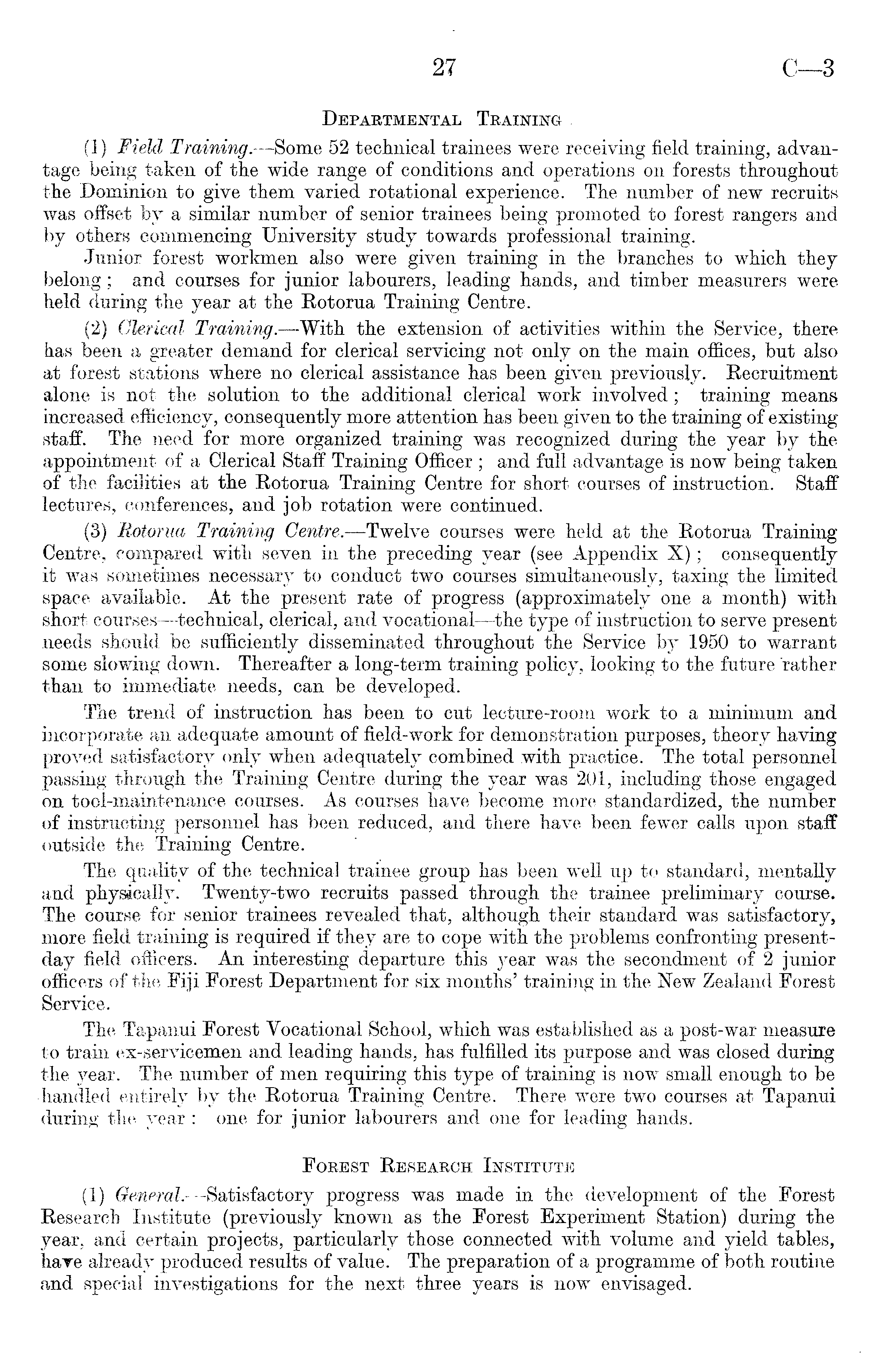 Departmental Training (1) Field Training.—Some 52 technical trainees were receiving field training, advantage being taken of the wide range of conditions and operations on forests throughout the Dominion to give them varied rotational experience. The number of new recruits was offset by a similar number of senior trainees being promoted to forest rangers and by others commencing University study towards professional training. Junior forest workmen also were given training in the branches to which they belong; and courses for junior labourers, leading hands, and timber measurers were held during the year at the Rotorua Training Centre." (2) Clerical Training.—With the extension of activities within the Service, there has been a greater demand for clerical servicing not only on the main offices, but also at forest stations where no clerical assistance has been given previously. Recruitment alone is not the solution to the additional clerical work involved ; training means increased efficiency, consequently more attention has been given to the training of existing staff. The need for more organized training was recognized during the year by the appointment of a Clerical Staff Training Officer ; and full advantage is now being taken of the facilities at the Rotorua Training Centre for short courses of instruction. Staff lectures, conferences, and job rotation were continued. ' (3) Rotorua Training Centre.—Twelve courses were held at the Rotorua Training Centre, compared with seven in the preceding year (see Appendix X); consequently it was sometimes necessary to conduct two courses simultaneously, taxing the limited space available. At the present rate of progress (approximately one a month) with short courses —technical, clerical, and vocational —the type of instruction to serve present needs should be sufficiently disseminated throughout the Service by 1950 to warrant some slowing down. Thereafter a long-term training policy, looking to the future rather than to immediate needs, can be developed. The trend of instruction has been to cut lecture-room work to a minimum and incorporate an adequate amount of field-work for demonstration purposes, theory having proved satisfactory only when adequately combined with practice. The total personnel passing through the Training Centre during the year was 201, including those engaged on tool-maintenance courses. As courses have become more standardized, the number of instructing personnel has been reduced, and there have been fewer calls upon staff outside the Training Centre. The quality of the technical trainee group has been well up to standard, mentally and physically. Twenty-two recruits passed through the trainee preliminary course. The course for senior trainees revealed that, although their standard was satisfactory, more field training is required if they are to cope with the problems confronting presentday field officers. An interesting departure this year was the secondment of 2 junior officers of the Fiji Forest Department for six months' training in the New Zealand Forest Service. The Tapanui Forest Vocational School, which was established as a post-war measure to train ex-servicemen and leading hands, has fulfilled its purpose and was closed during the year. The number of men requiring this type of training is now small enough to be -.handled entirely by the Rotorua Training Centre. There were two courses at Tapanui during the year : one for junior labourers and one for leading hands. Forest Research Institute (1) General. —Satisfactory progress was made in the development of the Forest Research Institute (previously known as the Forest Experiment Station) during the year, and certain projects, particularly those connected with volume and yield tables, have already produced results of value. The preparation of a programme of both routine and special investigations for the next three years is now envisaged.