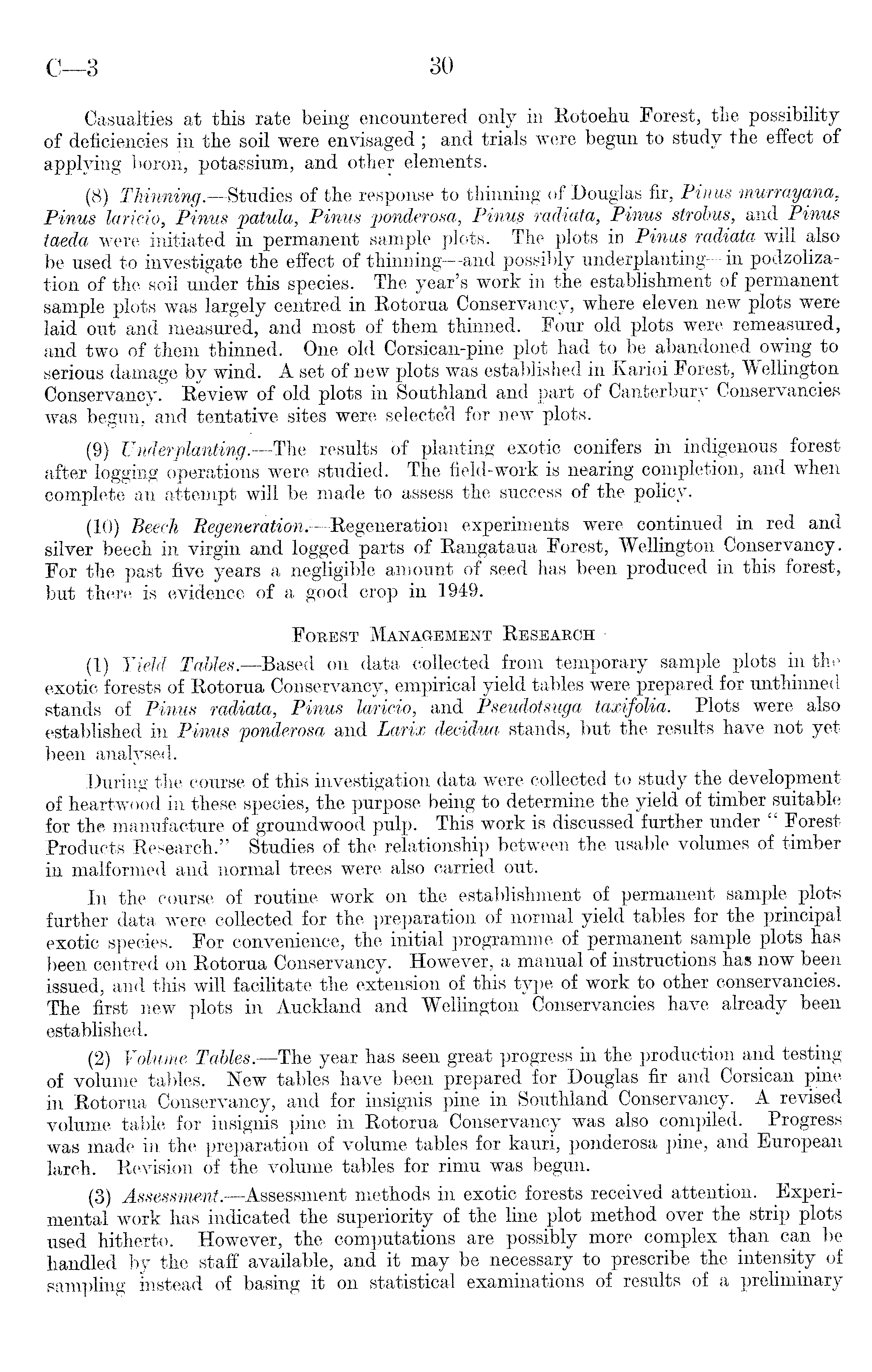 Casualties at this rate being encountered only in Rotoeliu Forest, the possibility" of deficiencies in the soil were envisaged ; and trials were begun to study the effect of applying boron, potassium, and other elements. (8) Thinning.—Studies of the response to thinning of Douglas fir, Pinus murrayana, Pinus laricio, Pinus spatula, Pinus ponderosa, Pinus radiata, Pinus strobus, and Pinus taeda were initiated in permanent sample plots. The plots in Pinus radiata will also be used to investigate the effect of thinning —and possibly underplantin g in podzolization of the soil under this species. The year's work in the establishment of permanent sample plots was largely centred in Rotorua Conservancy, where eleven new plots were laid out and measured, and most of them thinned. Four old plots were remeasured, and two of them thinned. One old Corsican-pine plot had to be abandoned owing to serious damage by wind. A set of new plots was established in Karioi Forest, Wellington Conservancy. Review of old plots in Southland and part of Canterbury Conservancies was begun, and tentative sites were selecte'd for new plots. (9) Under planting. —The results of planting exotic conifers in indigenous forest after logging operations were studied. The field-work is nearing completion, and when complete an attempt will be made to assess the success of the policy. (10) Beech Regeneration.—Regeneration experiments were continued in red and silver beech in virgin and logged parts of Rangataua Forest, Wellington Conservancy. For the past five years a negligible amount of seed has been produced in this forest, but there is evidence of a good crop in 1949. Forest Management Research (1) Yield Tables. —Based on data collected from temporary sample plots in the exotic forests of Rotorua Conservancy, empirical yield tables were prepared for unthinned stands of Pinus radiata, Pinus laricio, and Pseudotsuga taxifolia. Plots were also established in Pinus ponderosa and Larix decidua stands, but the results have not yet been analysed. During the course of this investigation data were collected to study the development of heartwood in these species, the purpose being to determine the yield of timber suitable for the manufacture of groundwood pulp. This work is discussed further under " Forest Products Research." Studies of the relationship between the usable volumes of timber in malformed and normal trees were also carried out. In the course of routine work on the establishment of permanent sample plots further data were collected for the preparation of normal yield tables for the principal exotic species. For convenience, the initial programme of permanent sample plots has been centred on Rotorua Conservancy. However, a manual of instructions has now been issued, and this will facilitate the extension of this type of work to other conservancies. The first new plots in Auckland and Wellington Conservancies have already been established. (2) Volume Tables. —The year has seen great progress in the production and testing of volume tables. New tables have been prepared for Douglas fir and Corsican pine in Rotorua Conservancy, and for insignis pine in Southland Conservancy. A revised volume table for insignis pine in Rotorua Conservancy was also compiled. Progress was made in the preparation of volume tables for kauri, ponderosa pine, and European larch. Revision of the volume tables for rimu was begun. (3) Assessment. —Assessment methods in exotic forests received attention. Experimental work has indicated the superiority of the line plot method over the strip plots used hitherto. However, the computations are possibly more complex than can be handled by the staff available, and it may be necessary to prescribe the intensity of sampling instead of basing it on statistical examinations of results of a preliminary