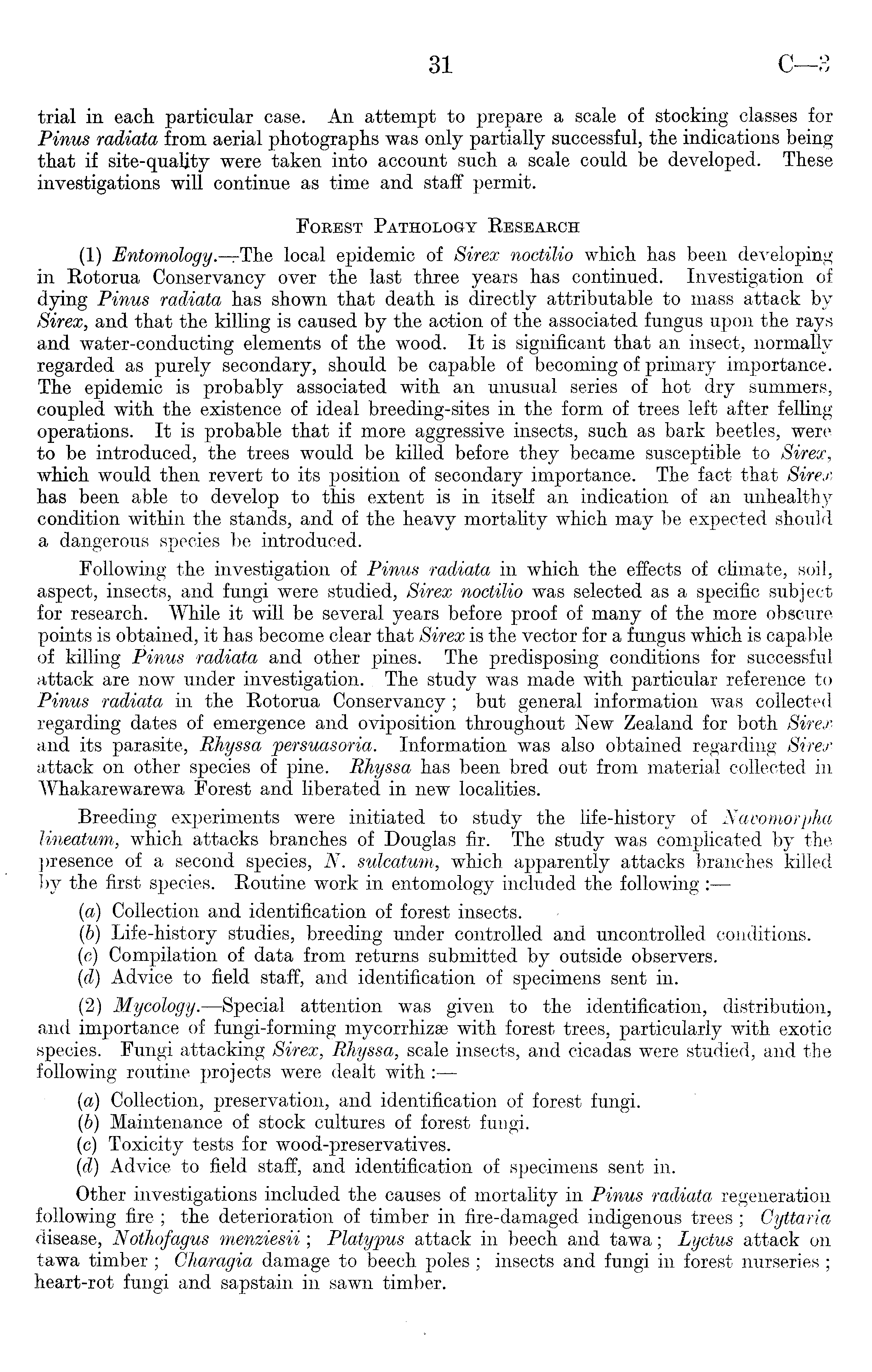 trial in each particular case. An attempt to prepare a scale of stocking classes for Pinus radiata from aerial photographs was only partially successful, the indications being that if site-quality were taken into account such a scale could be developed. These investigations will continue as time and staff permit. Forest Pathology Research (1) Entomology.—rThe local epidemic of Sirex noctilio which has been developing in Rotorua Conservancy over the last three years has continued. Investigation of dying Pinus radiata has shown that death is directly attributable to mass attack by Sirex, and that the killing is caused by the action of the associated fungus upon the rays and water-conducting elements of the wood. It is significant that an insect, normally regarded as purely secondary, should be capable of becoming of primary importance. The epidemic' is probably associated with an unusual series of hot dry summers, coupled with the existence of ideal breeding-sites in the form of trees left after felling operations. It is probable that if more aggressive insects, such as bark beetles, were to be introduced, the trees would be killed before they became susceptible to Sirex, which would then revert to its position of secondary importance. The fact that Sirex has been able to develop to this extent is in itself an indication of an unhealthy condition within the stands, and of the heavy mortality which may be expected should a dangerous species be introduced. Following the investigation of Pinus radiata in which the effects of climate, soil, aspect, insects, and fungi were studied, Sirex noctilio was selected as a specific subject, for research. While it will be several years before proof of many of the more obscure points is obtained, it has become clear that Sirex is the vector for a fungus which is capable of killing Pinus radiata and other pines. The predisposing conditions for successful attack are now under investigation. . The study was made with particular reference to Pinus radiata in the Rotorua Conservancy; but general information was collected regarding dates of emergence and oviposition throughout New Zealand for both Sirex and its parasite, Rhyssa persuasoria. Information was also obtained regarding Sirex attack on other species of pine. Rhyssa has been bred out from material collected in Whakarewarewa Forest and liberated in new localities. Breeding experiments were initiated to study the life-history of Navomorpha lineatum, which attacks branches of Douglas fir. The study was complicated by the presence of a second species,. N. sulcatum, which apparently attacks branches killed by the first species. Routine work in entomology included the following : (a) Collection and identification of forest insects. (b) Life-history studies, breeding under controlled and uncontrolled conditions. {c) Compilation of data from returns submitted by outside observers. (d) Advice to field staff, and identification of specimens sent in. (2) Mycology.-—Special attention was given to the identification, distribution, and importance of fungi-forming mycorrhizee with forest trees, particularly with exotic species. Fungi attacking Sirex, Rhyssa, scale insects, and cicadas were studied, and the following routine projects were dealt with : (a) Collection, preservation, and identification of forest fungi. (b) Maintenance of stock cultures of forest fungi. (c) Toxicity tests for wood-preservatives. (d) Advice to field staff, and identification of specimens sent in. Other investigations included the causes of mortality in Pinus radiata regeneration following fire ; the deterioration of timber in fire-damaged indigenous trees ; Cyttaria disease, Nothofagus menziesii; Platypus attack in beech and tawa; Lyctus attack on tawa timber ; Charagia damage to beech poles ; insects and fungi in forest nurseries ; heart-rot fungi and sapstain in sawn timber.