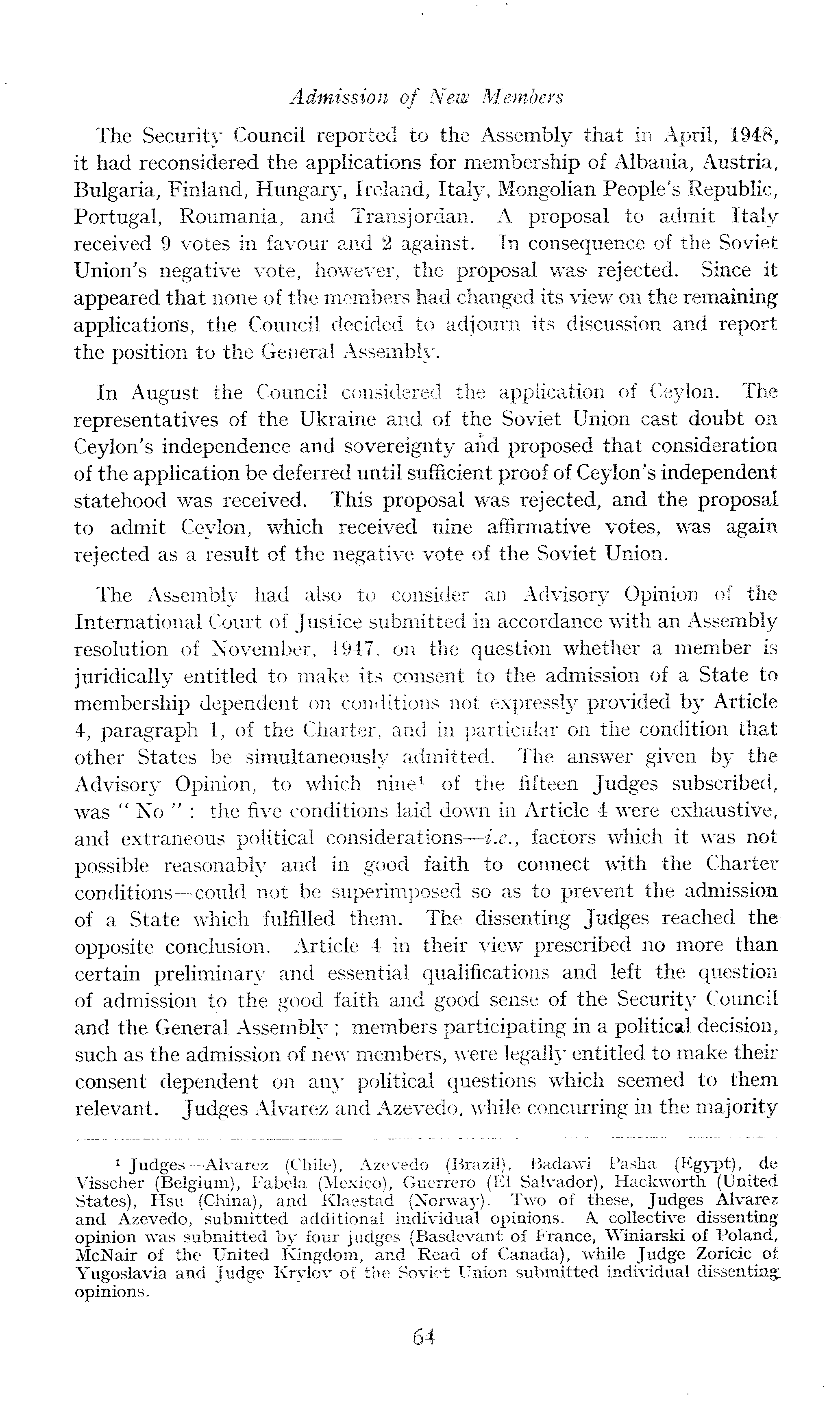 Admission of New Members The Security Council reported to the Assembly that in April, 1948, it had reconsidered the applications for membership of Albania, Austria, Bulgaria, Finland, Hungary, Ireland, Italy, Mongolian People's Republic, Portugal, Roumania, and Transjordan. A proposal to admit Italy received 9 votes in favour and 2 against. In consequence of the Soviet Union's negative vote, however, the proposal was- rejected. Since it appeared that none of the members had changed its view on the remaining applications, the Council decided to adjourn its discussion and report the position to the General Assembly. In August the Council considered the application of Ceylon. The representatives of the Ukraine and of the Soviet Union cast doubt on Ceylon's independence and sovereignty and proposed that consideration of the application be deferred until sufficient proof of Ceylon's independent statehood was received. This proposal was rejected, and the proposal to admit Ceylon, which received nine affirmative votes, was again rejected as a result of the negative vote of the Soviet Union. The Assembly had also to consider an Advisory Opinion of the International Court of Justice submitted in accordance with an Assembly resolution of November, 1947, on the question whether a member is juridically entitled to make its consent to the admission of a State to membership dependent on conditions not expressly provided by Article 4, paragraph 1, of the Charter, and in particular on the condition that other States be simultaneously admitted. The answer given by the Advisory Opinion, to which nine l of the fifteen Judges subscribed, was " No " : the five conditions laid down in Article 4 were exhaustive, and extraneous political considerations — i.e., factors which it was not possible reasonably and in good faith to connect with the Charter conditions —could not be superimposed so as to prevent the admission of a State which fulfilled them. The dissenting Judges reached the opposite conclusion. Article 4 in their view prescribed no more than certain preliminary and essential qualifications and left the question of admission to the good faith and good sense of the Security Council and the General Assembly; members participating in a political decision, such as the admission of new members, were legally entitled to make their consent dependent on any political questions which seemed to them relevant. Judges Alvarez and Azevedo, while concurring in the majority