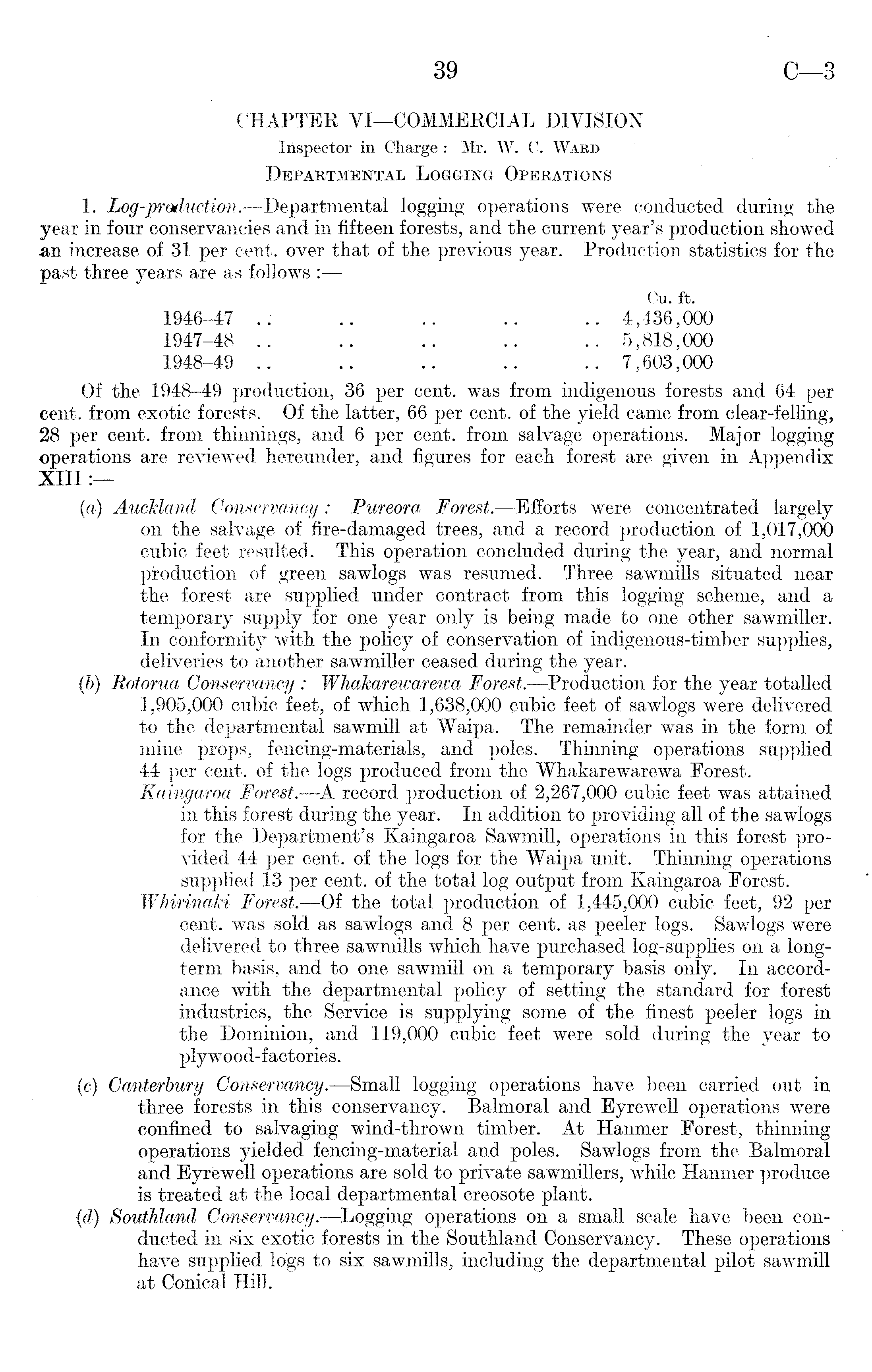 CHAPTER YI—COMMERCIAL DIVISION Inspector in Charge : Mr. W. C. Ward Departmental Logging Operations 1. Log-production.—Departmental logging operations were conducted during the year in four conservancies and in fifteen forests, and the current year's production showed an increase of 31 per cent, over that of the previous year. Production statistics for the past three years are as follows | — Cn. ft. 1946-47 .. .. .. .. .. 4,436,000 1947-48 .. .. .. .. .. 5,818,000 1948-49 .. .. .. .. .. 7,603,000 Of the 1948-49 production, 36 per cent, was from indigenous forests and 64 per cent, from exotic forests. Of the latter, 66 per cent, of the yield came from clear-felling, 28 per cent, from thinnings, and 6 per cent, from salvage operations. Major logging operations are reviewed hereunder, and figures for each forest are given in Appendix XIII (a) Auckland Conservancy : Pureora Forest.—Efforts were concentrated largely on the salvage of fire-damaged trees, and a record production of 1,017,000 cubic feet resulted. This operation concluded during the year, and normal production of green sawlogs was resumed. Three sawmills situated near the forest are supplied under contract from this logging scheme, and a temporary supply for one year only is being made to one other sawmiller. In conformity with the policy of conservation of indigenous-timber supplies, deliveries to another sawmiller ceased during the year. {b) Rotorua Conservancy : Whakareivarewa Forest. —Production for the year totalled 1,905,000 cubic feet, of which 1,638,000 cubic feet of sawlogs were delivered to the departmental sawmill at Waipa. The remainder was in the form of mine props, fencing-materials, and poles. Thinning operations supplied 44 per cent, of the logs produced from the Whakarewarewa Forest. Kaingaroa Forest.—A record production of 2,267,000 cubic feet was attained in this forest during the year. In addition to providing all of the sawlogs for the Department's Kaingaroa Sawmill, operations in this forest provided 44 per cent, of the logs for the Waipa unit. Thinning operations supplied 13 per cent, of the total log output from Kaingaroa Forest. WJiirinaki Forest. —Of the total production of 1,445,000 cubic feet, 92 per cent, was sold as sawlogs and 8 per cent, as peeler logs. Sawlogs were delivered to three sawmills which have purchased log-supplies on a longterm basis, and to one sawmill on a temporary basis only. In accordance with the departmental "policy of setting the standard for forest industries, the Service is supplying some of the finest peeler logs in the Dominion, and 119,000 cubic feet were sold during the year to plywood-factories. (c) Canterbury Conservancy.—Small logging operations have been carried out in three forests in this conservancy. Balmoral and Eyrewell operations were confined to salvaging wind-thrown timber. At Hanmer Forest, thinning operations yielded fencing-material and poles. Sawlogs from the Balmoral and Eyrewell operations are sold to private sawmillers, while Hanmer produce is treated at the local departmental creosote plant. (d) Southland Conservancy. —Logging operations on a small scale have been conducted in six exotic forests in the Southland Conservancy. These operations have supplied logs to six sawmills, including the departmental pilot sawmill at Conical Hill.