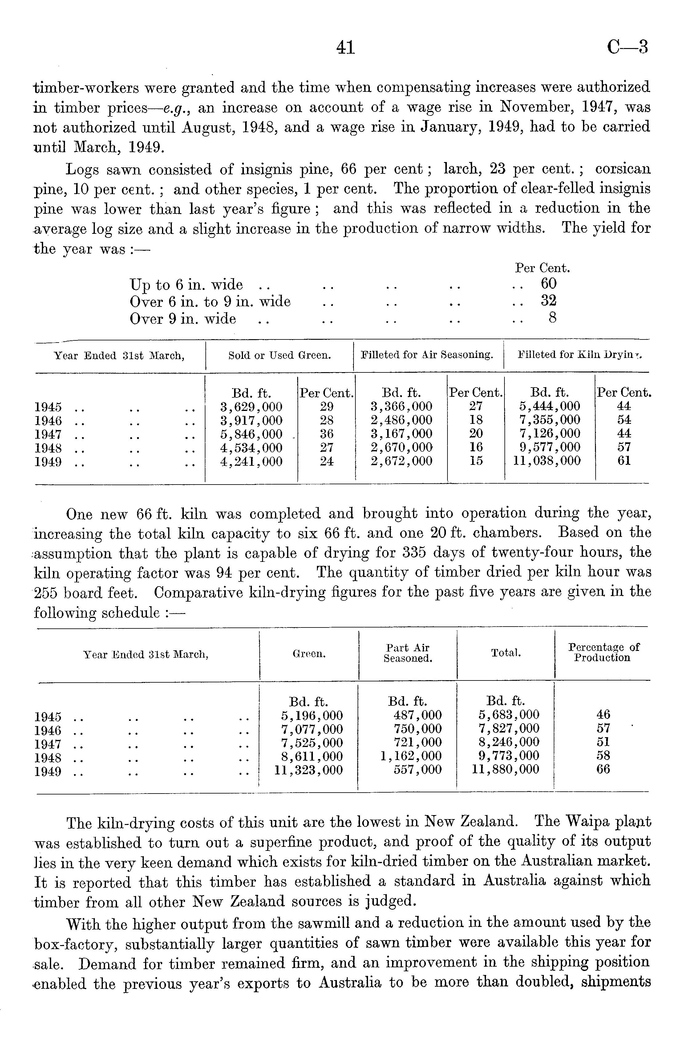 Year Ended 31st March, Green. Part Air Seasoned. Total. Percentage of Production Bd. ft. Bd. ft. Bd. ft. 1945 .. 5,196,000 487,000 5,683,000 46 1946 .. 7,077,000 750,000 7,827,000 57 • 1947 .. 7,525,000 721,000 8,246,000 51 1948 .. 8,611,000 1,162,000 9,773,000 58 1949 .. 11,323,000 557,000 11,880,000 66