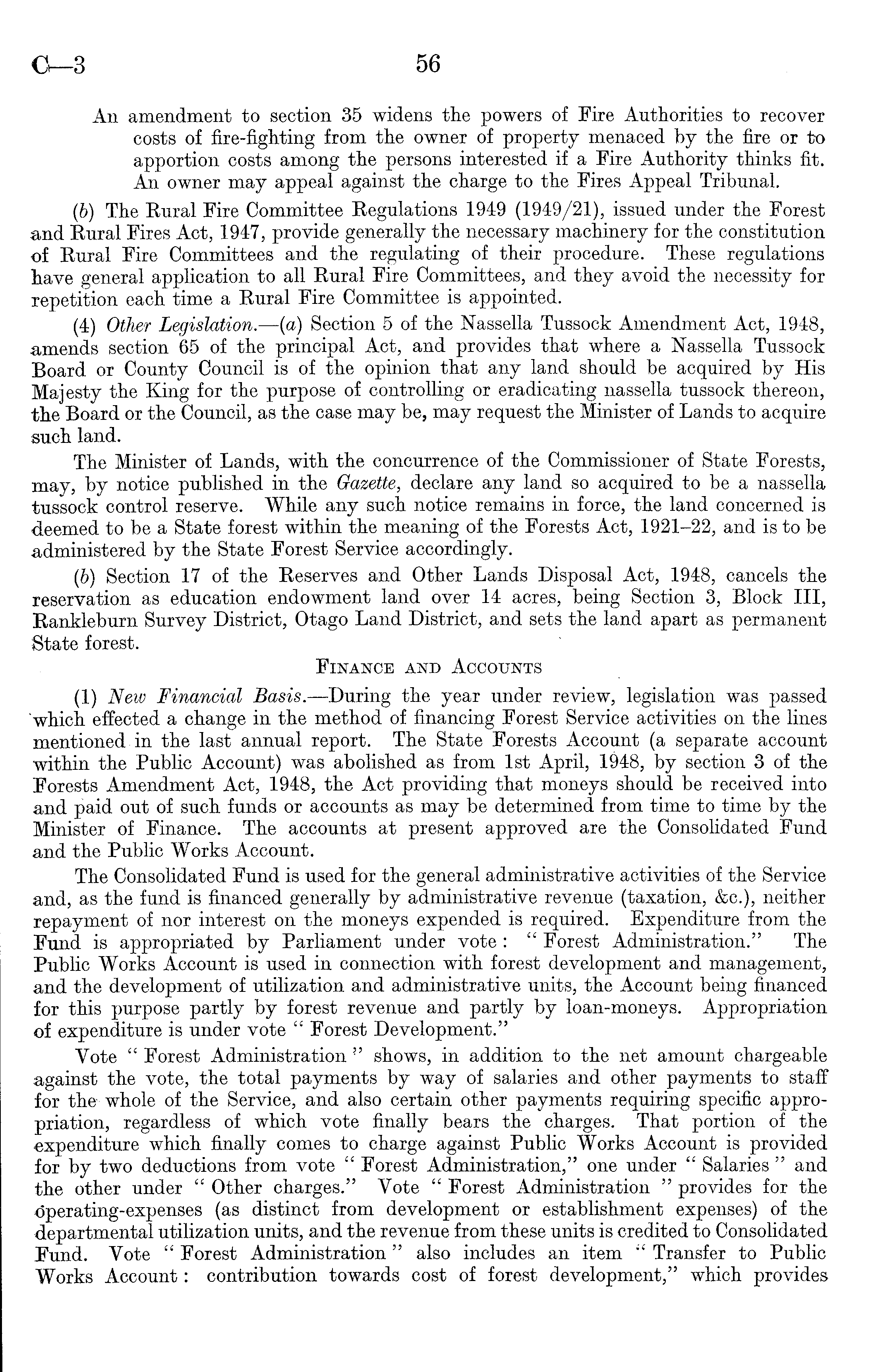 An amendment to section 35 widens the powers of Fire Authorities to recover costs of fire-fighting from the owner of property menaced by the fire or to apportion costs among the persons interested if a Fire Authority thinks fit. An owner may appeal against the charge to the Fires Appeal Tribunal. (b) The Rural Fire Committee Regulations 1949 (1949/21), issued under the Forest and Rural Fires Act, 1947, provide generally the necessary machinery for the constitution ■of Rural Fire Committees and the regulating of their procedure. These regulations have general application to all Rural Fire Committees, and they avoid the necessity for repetition each time a Rural Fire Committee is appointed. (4) Other Legislation.—(a) Section 5 of the Nassella Tussock Amendment Act, 1948, amends section 65 of the principal Act, and provides that where a Nassella Tussock Board or County Council is of the opinion that any land should be acquired by His Majesty the King for the purpose of controlling or eradicating nassella tussock thereon, the Board or the Council, as the case may be, may request the Minister of Lands to acquire such land. The Minister of Lands, with the concurrence of the Commissioner of State Forests, may, by notice published in the Gazette, declare any land so acquired to be a nassella tussock control reserve. While any such notice remains in force, the land concerned is deemed to be a State forest within the meaning of the Forests Act, 1921-22, and is to be administered by the State Forest Service accordingly. (b) Section 17 of the Reserves and Other Lands Disposal Act, 1948, cancels the reservation as education endowment land over 14 acres, being Section 3, Block 111, Rankleburn Survey District, Otago Land District, and sets the land apart as permanent State forest. Finance and Accounts (1) New Financial Basis.—During the year under review, legislation was passed which effected a change in the method of financing Forest Service activities on the lines mentioned in the last annual report. The State Forests Account (a separate account within the Public Account) was abolished as from Ist April, 1948, by section 3 of the Forests Amendment Act, 1948, the Act providing that moneys should be received into and paid out of such funds or accounts as may be determined from time to time by the Minister of Finance. The accounts at present approved are the Consolidated Fund and the Public Works Account. The Consolidated Fund is used for the general administrative activities of the Service and, as the fund is financed generally by administrative revenue (taxation, &c.), neither repayment of nor interest on the moneys expended is required. Expenditure from the Fund is appropriated by Parliament under vote : " Forest Administration." The Public Works Account is used in connection with forest development and management, and the development of utilization and administrative units, the Account being financed for this purpose partly by forest revenue and partly by loan-moneys. Appropriation of expenditure is under vote " Forest Development." Vote " Forest Administration shows, in addition to the net amount chargeable against the vote, the total payments by way of salaries and other payments to staff for the whole of the Service, and also certain other payments requiring specific appropriation, regardless of which vote finally bears the charges. That portion of the expenditure which finally comes to charge against Public Works Account is provided for by two deductions from vote " Forest Administration," one under " Salaries " and the other under "Other charges." Vote "Forest Administration " provides. for the operating-expenses (as distinct from development or establishment expenses) of the departmental utilization units, and the revenue from these units is credited to Consolidated Fund. Vote " Forest Administration" also includes an item " Transfer to Public Works Account: contribution towards cost of forest development," which provides