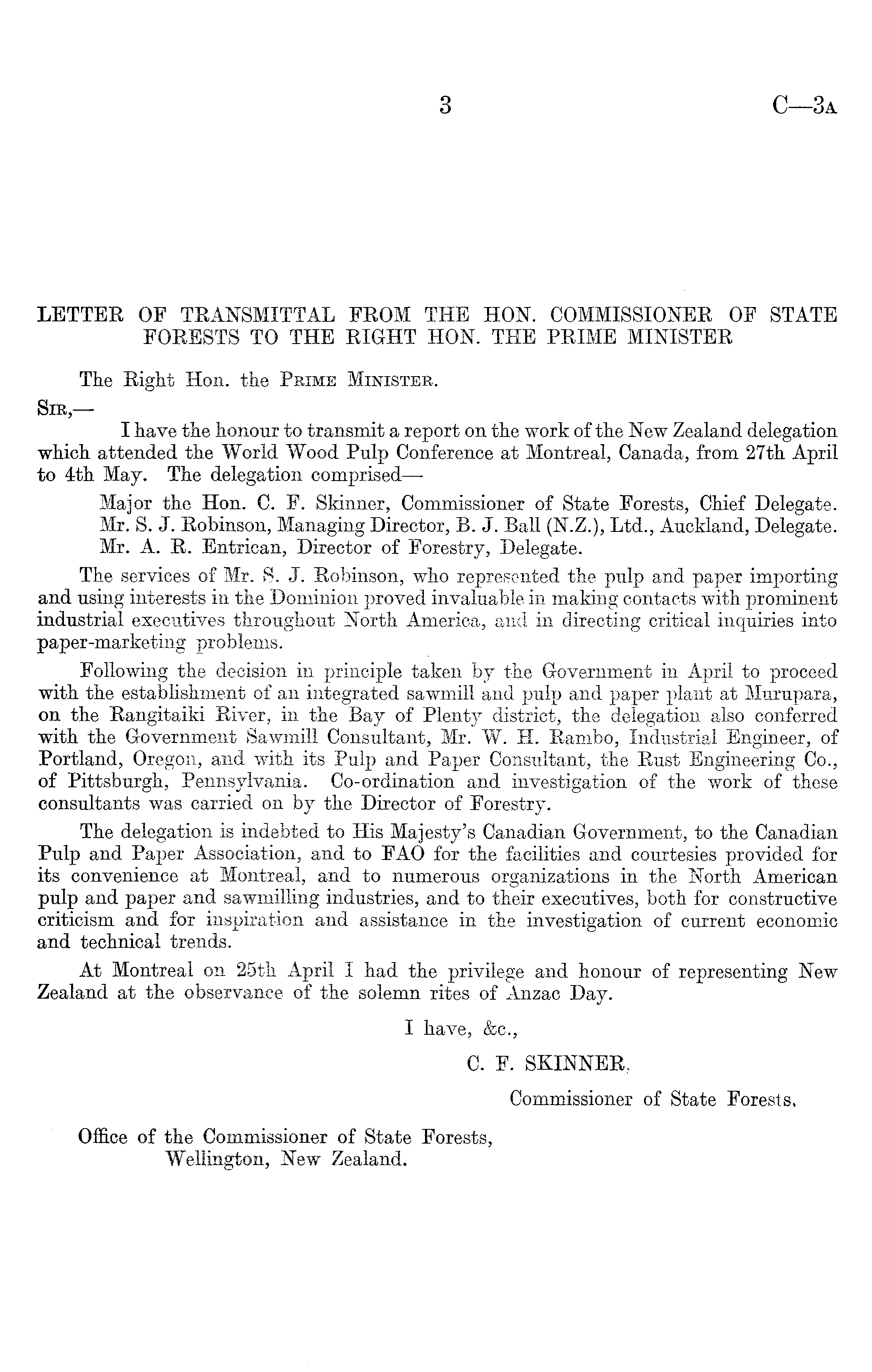 LETTER OF TRANSMITTAL FROM THE HON. COMMISSIONER OF STATE FORESTS TO THE RIGHT HON. THE PRIME MINISTER The Right Hon. the Prime Minister. Sir,— I have the honour to transmit a report on the work of the New Zealand delegation which attended the World Wood Pulp Conference at Montreal, Canada, from 27th April to 4th May. The delegation comprised— Major the Hon. C. F. Skinner, Commissioner of State Forests, Chief Delegate. Mr. S. J. Robinson, Managing Director, B. J. Ball (N.Z.), Ltd., Auckland, Delegate. Mr. A. R. Entrican, Director of Forestry, Delegate. The services of Mr. S. J. Robinson, who represented the pulp and paper importing and using interests in the Dominion proved invaluable in making contacts with prominent industrial executives throughout North America, and in directing critical inquiries into paper-marketing problems. Following the decision in principle taken by the Government in April to proceed with the establishment of an integrated sawmill and pulp and paper plant at Murupara, on the Rangitaiki River, in the Bay of Plenty district, the delegation also conferred with the Government Sawmill Consultant, Mr. W. H. Rambo, Industrial Engineer, of Portland, Oregon, and with its Pulp and Paper Consultant, the Rust Engineering Co., of Pittsburgh, Pennsylvania. Co-ordination and investigation of the work of these consultants was carried on by the Director of Forestry. The delegation is indebted to His Majesty's Canadian Government, to the Canadian Pulp and Paper Association, and to FAO for the facilities and courtesies provided for its convenience at Montreal, and to numerous organizations in the North American pulp and paper and sawmilling industries, and to their executives, both for constructive criticism and for inspiration and assistance in the investigation of current economic and technical trends. At Montreal on 25th April I had the privilege and honour of representing New Zealand at the observance of the solemn rites of Anzac Day. I have, &c., C. F. SKINNER, Commissioner of State Forests, Office of the Commissioner of State Forests, Wellington, New Zealand.