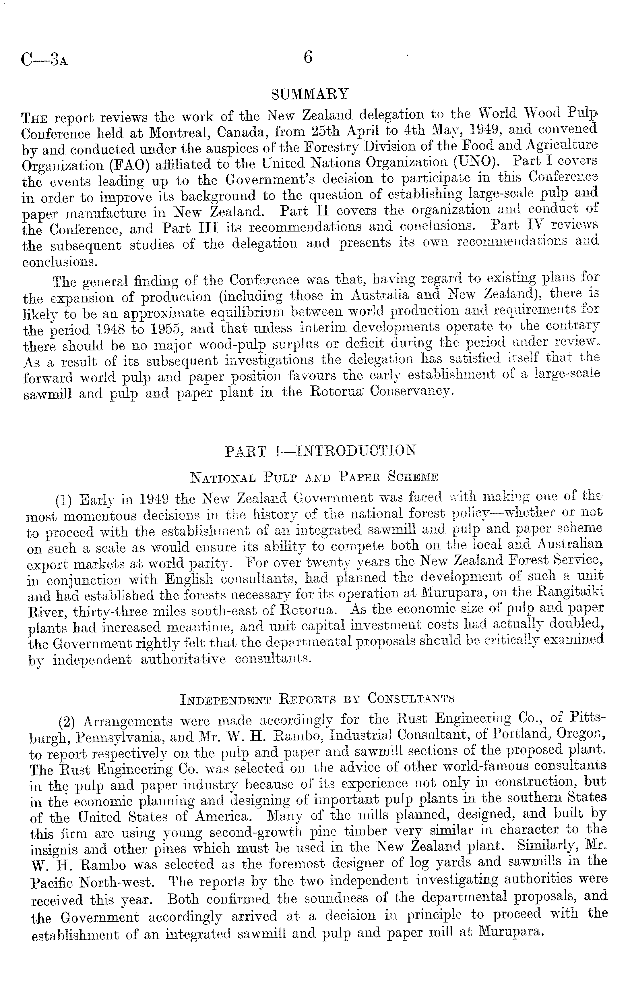 SUMMARY The report reviews tlie work of "the New Zealand delegation, to the World Wood Pulp Conference held at Montreal, Canada, from 25th. April to 4th May, 1949, and convened by and conducted under the auspices of the Forestry Division of the Food and Agriculture Organization (FAO) affiliated to the United Nations Organization (UNO). Part I covers the events leading up to the Government's decision to participate in this Conference in order to improve its background to the question of establishing large-scale pulp and paper manufacture in New Zealand. Part II covers the organization and conduct of the Conference, and Part 111 its recommendations and conclusions. Part IV reviews the subsequent studies of the delegation and presents its own recommendations and conclusions. The general finding of the Conference was that, having regard to existing plans for the expansion of production (including those in Australia and New Zealand), there is likely to be an approximate equilibrium between world production and requirements for the period 1948 to 1955, and that unless interim developments operate to the contrary there should be no major wood-pulp surplus or deficit during the period under review. As a result of its subsequent investigations the delegation has satisfied itself that the forward world pulp and paper position favours the early establishment of a large-scale sawmill and pulp and paper plant in the Rotorua' Conservancy. PART I—INTRODUCTION National Pulp and Paper Scheme (1) Early in 1949 the New Zealand Government was faced with making one of the most momentous decisions in the history of the national forest policy —whether or not to proceed with the establishment of an integrated sawmill and pulp and paper scheme on such a scale as would ensure its ability to compete both on the local and Australian export markets at world parity. For over twenty years the New Zealand Forest Service, in conjunction with English consultants, had planned the development of such a unit and had established the forests necessary for its operation at Murupara, on the Rangitaiki River, thirty-three miles south-east of Rotorua. As the economic size of pulp and paper plants had increased meantime, and unit capital investment costs had actually doubled, the Government rightly felt that the departmental proposals should be critically examined by independent authoritative consultants. Independent Reports by Consultants (2) Arrangements were made accordingly for the Rust Engineering Co., of Pittsburgh, Pennsylvania, and Mr. W. H. Rambo, Industrial Consultant, of Portland, Oregon, to report respectively on the pulp and paper and sawmill sections of the proposed plant. The Rust Engineering Co. was selected on the advice of othe'r world-famous consultants in the pulp and paper industry because of its experience not only in construction, but in the economic planning and designing of important pulp plants in the southern States of the United States of America. Many of the mills planned, _ designed, and built by this firm are using young second-growth pine timber very similar in character to the insignis and other pines which must be used in the New Zealand plant. Similarly, Mr. W. H. Rambo was selected as the foremost designer of log yards and sawmills in the Pacific North-west. The reports by the two independent investigating authorities were received this year. Both confirmed the soundness of the departmental proposals, and the Government accordingly arrived at a decision in principle to proceed with the establishment of an integrated sawmill and pulp and paper mill at Murupara.