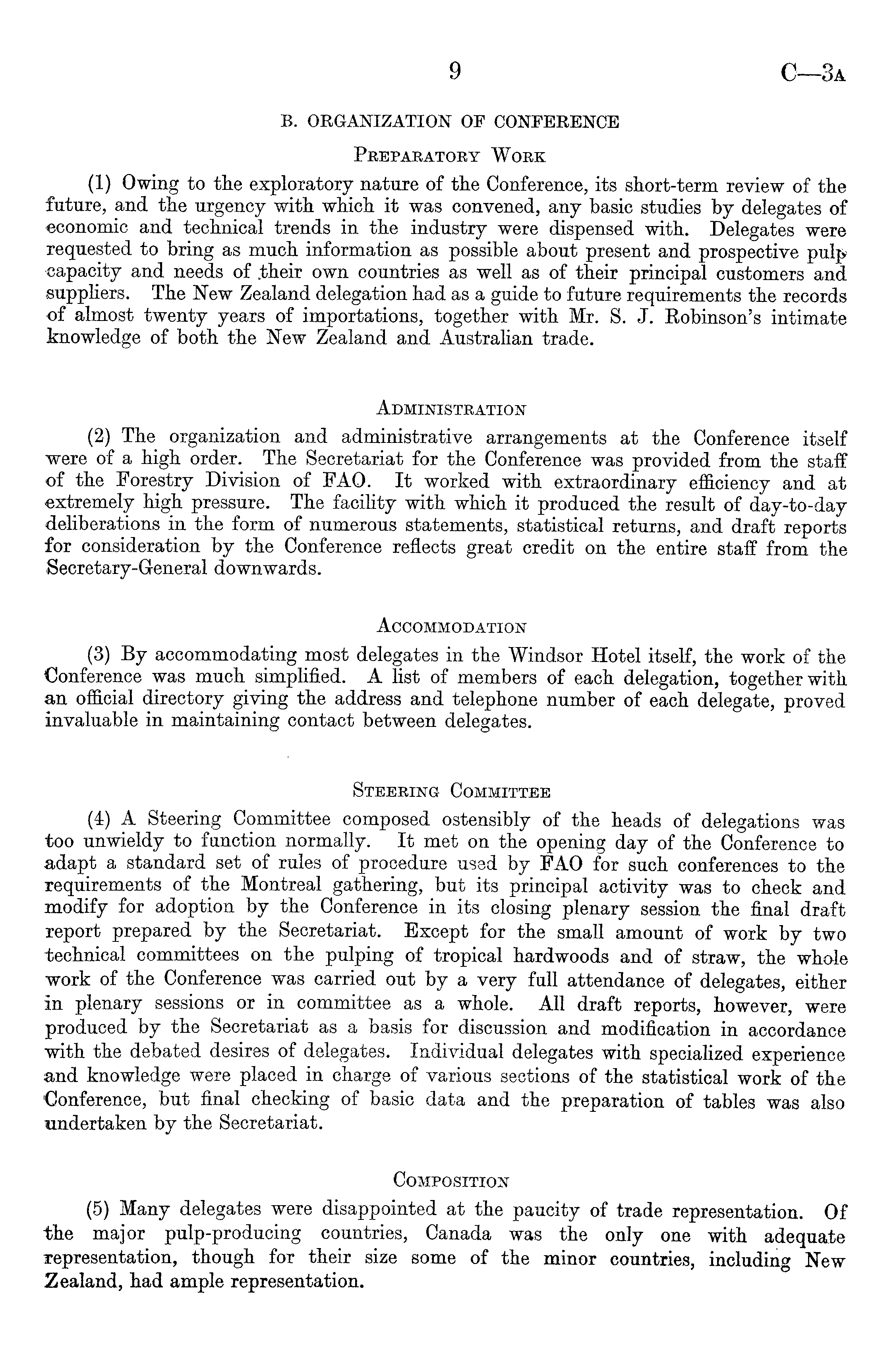 B. ORGANIZATION OF CONFERENCE Preparatory Work (1) Owing to the exploratory nature of the Conference, its short-term review of the future, and the urgency with which it was convened, any basic studies by delegates of economic and technical trends in the industry were dispensed with. Delegates were requested to bring as much information as possible about present and prospective pulp capacity and needs of .their own countries as well as of their principal customers and suppliers. The New Zealand delegation had as a guide to future requirements the records of almost twenty years of importations, together with Mr. S. J. Robinson's intimate knowledge of both the New Zealand and Australian trade. Administration (2) The organization and administrative arrangements at the Conference itself were of a high order. The Secretariat for the Conference was provided from the staff of the Forestry Division of FAQ. It worked with extraordinary efficiency and at extremely high pressure. The facility with which it produced the result of day-to-day deliberations in the form of numerous statements, statistical returns, and draft reports for consideration by the Conference reflects great credit on the entire staff from the Secretary-General downwards. Accommodation (3) By accommodating most delegates in the Windsor Hotel itself, the work of the Conference was much simplified. A list of members of each delegation, together with a,n official directory giving the address and telephone number of each delegate, proved invaluable in maintaining contact between delegates. Steering Committee (4) A Steering Committee composed ostensibly of the heads of delegations was too unwieldy to function normally. It met on the opening day of the Conference to adapt a standard set of rules of procedure used by FAO for such conferences to the requirements of the Montreal gathering, but its principal activity was to check and modify for adoption by the Conference in its closing plenary session the final draft report prepared by the Secretariat. Except for the small amount of work by two technical committees on the pulping of tropical hardwoods and of straw, the whole work of the Conference was carried out by a very full attendance of delegates, either in plenary sessions or in committee as a whole. All draft reports, however, were produced by the Secretariat as a basis for discussion and modification in accordance with the debated desires of delegates. Individual delegates with specialized experience and knowledge were placed in charge of various sections of the statistical work of the Conference, but final checking of basic data and the preparation of tables was also undertaken by the Secretariat. Composition (5) Many delegates were disappointed at the paucity of trade representation. Of the major pulp-producing countries, Canada was the only one with adequate representation, though for their size some of the minor countries, including New Zealand, had ample representation.