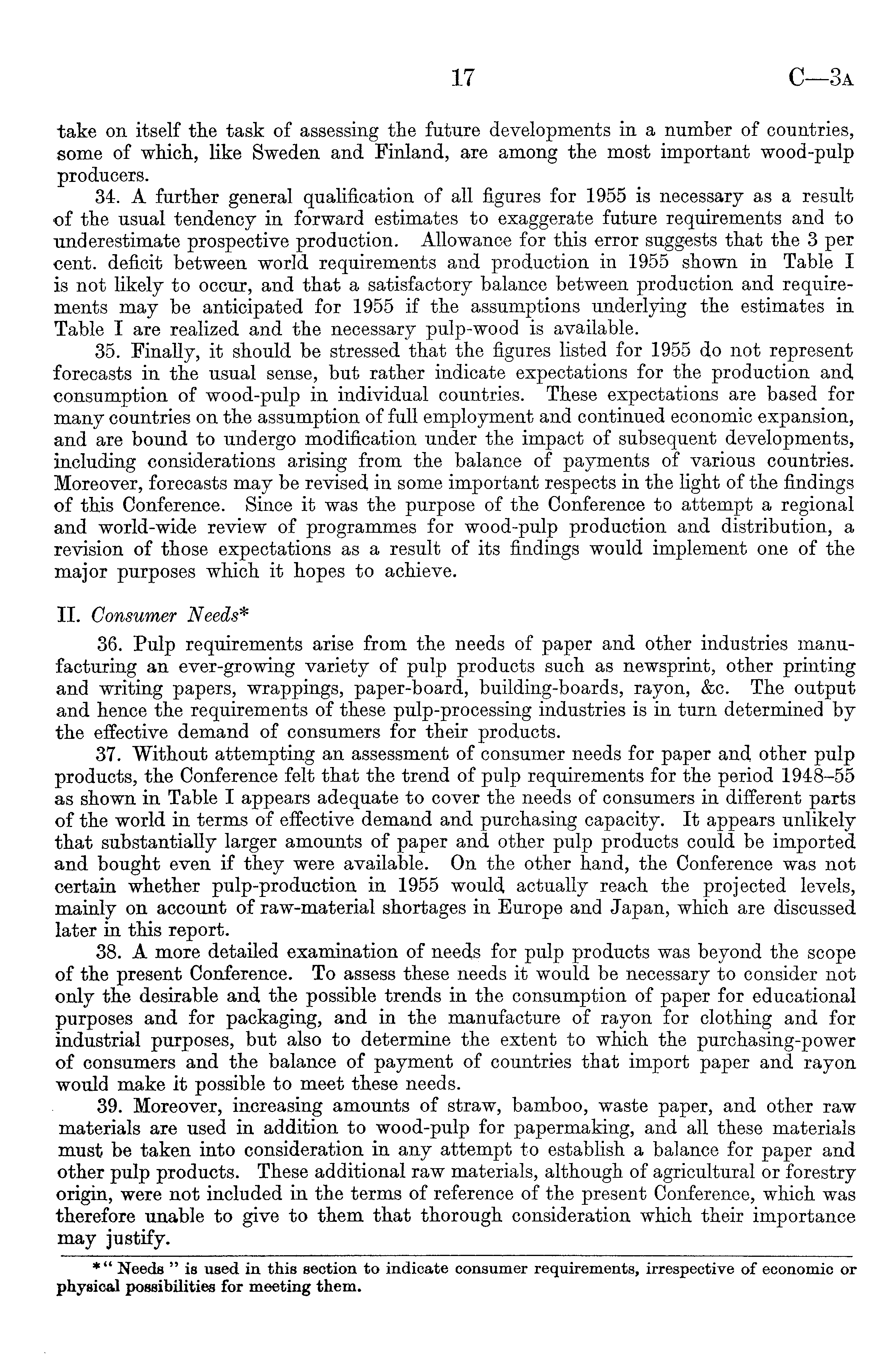 take on itself the task of assessing the future developments in a number of countries, some of which, like Sweden and Finland, are among the most important wood-pulp producers. 34. A further general qualification of all figures for 1955 is necessary as a result of the usual tendency in forward estimates to exaggerate future requirements and to underestimate prospective production. Allowance for this error suggests that the 3 per cent, deficit between world requirements and production in 1955 shown in Table I is not likely to occur, and that a satisfactory balance between production and requirements may be anticipated for 1955 if the assumptions underlying the estimates in Table I are realized and the necessary pulp-wood is available. 35. Finally, it should be stressed that the figures listed for 1955 do not represent forecasts in the usual sense, but rather indicate expectations for the production and consumption of wood-pulp in individual countries. These expectations are based for many countries on the assumption of full employment and continued economic expansion, and are bound to undergo modification under the impact of subsequent developments, including considerations arising from the balance of payments of various countries. Moreover, forecasts may be revised in some important respects in the light of the findings of this Conference. Since it was the purpose of the Conference to attempt a regional and world-wide review of programmes for wood-pulp production and distribution, a revision of those expectations as a result of its findings would implement one of the major purposes which it hopes to achieve. 11. Consumer Needs * 36. Pulp requirements arise from the needs of paper and other industries manufacturing an ever-growing variety of pulp products such as newsprint, other printing and writing papers, wrappings, paper-board, building-boards, rayon, &c. The output and hence the requirements of these pulp-processing industries is in turn determined by the effective demand of consumers for their products. 37. Without attempting an assessment of consumer needs for paper and other pulp products, the Conference felt that the trend of pulp requirements for the period 1948-55 as shown in Table I appears adequate to cover the needs of consumers in different parts of the world in terms of effective demand and purchasing capacity. It appears unlikely that substantially larger amounts of paper and other pulp products could be imported and bought even if they were available. On the other hand, the Conference was not certain whether pulp-production in 1955 would actually reach the projected levels, mainly on account of raw-material shortages in Europe and Japan, which are discussed later in this report. 38. A more detailed examination of needs for pulp products was beyond the scope of the present Conference. To assess these needs it would be necessary to consider not only the desirable and the possible trends in the consumption of paper for educational purposes and for packaging, and in the manufacture of rayon for clothing and for industrial purposes, but also to determine the extent to which the purchasing-power of consumers and the balance of payment of countries that import paper and rayon would make it possible to meet these needs. 39. Moreover, increasing amounts of straw, bamboo, waste paper, and other raw materials are used in addition to wood-pulp for papermaking, and all these materials must be taken into consideration in any attempt to establish a balance for paper and other pulp products. These additional raw materials, although of agricultural or forestry origin, were not included in the terms of reference of the present Conference, which was therefore unable to give to them that thorough consideration which their importance may justify.