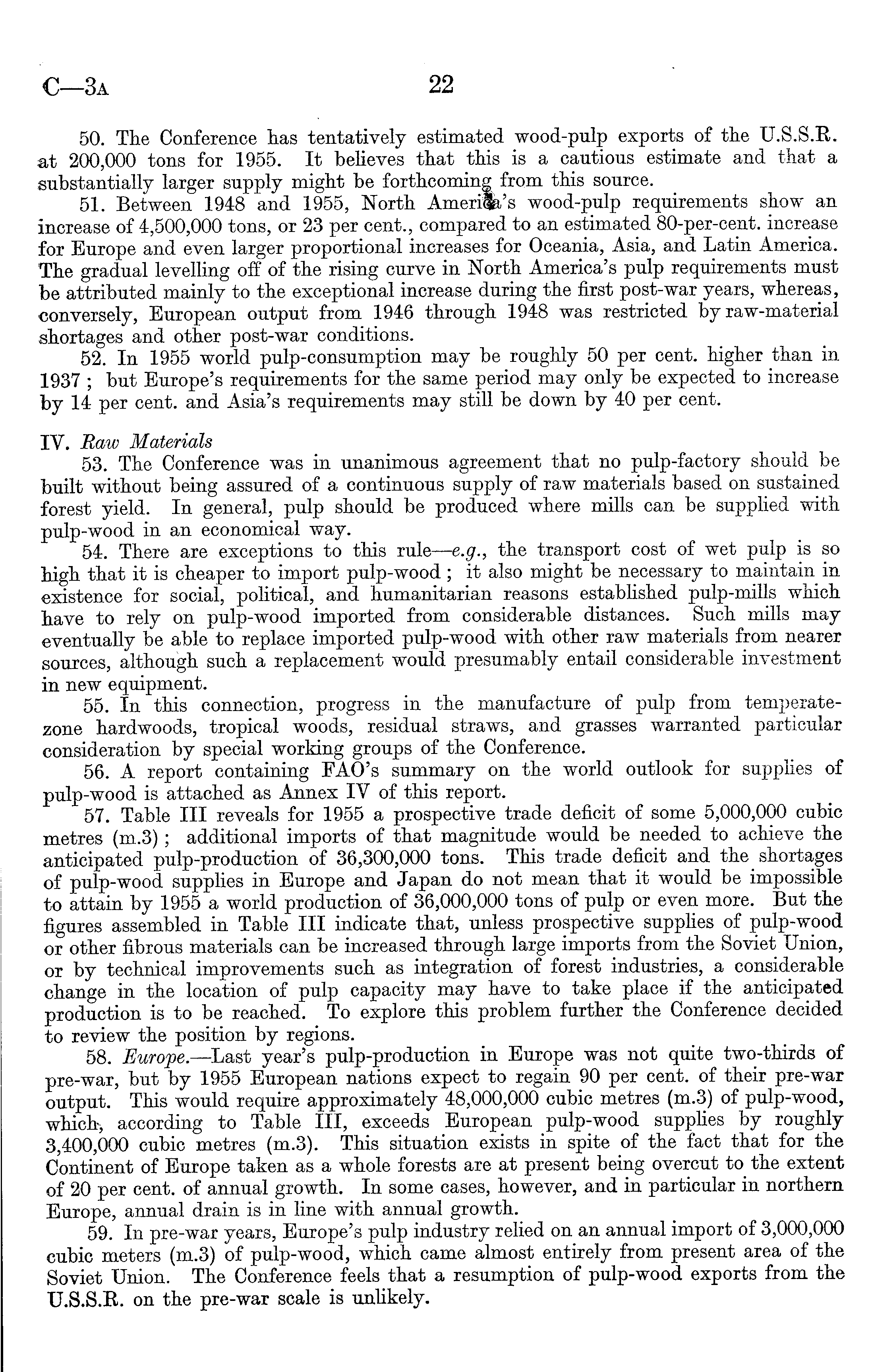 50. The Conference has tentatively estimated wood-pulp exports of the U.S.S.R. at 200,000 tons for 1955. It believes that this is a cautious estimate and that a substantially larger supply might be forthcoming from this source. 51. Between 1948 and 1955, North AmeriWs wood-pulp requirements show an increase of 4,500,000 tons, or 23 per cent., compared to an estimated 80-per-cent. increase for Europe and even larger proportional increases for Oceania, Asia, and Latin America. The gradual levelling off of the rising curve in North America's pulp requirements must be attributed mainly to the exceptional increase during the first post-war years, whereas, conversely, European output from 1946 through 1948 was restricted by raw-material shortages and other post-war conditions. 52. In 1955 world pulp-consumption may be roughly 50 per cent, higher than in 1937 ; but Europe's requirements for the same period may only be expected to increase by 14 per cent, and Asia's requirements may still be down by 40 per cent. IV. Raw Materials 53. The Conference was in unanimous agreement that no pulp-factory should be built without being assured of a continuous supply of raw materials based on sustained forest yield. In general, pulp should be produced where mills can be supplied with pulp-wood in an economical way. 54. There are exceptions to this rule —e.g., the transport cost of wet pulp is so high that it is cheaper to import pulp-wood ; it also might be necessary to maintain in existence for social, political, and humanitarian reasons established pulp-mills which have to rely on pulp-wood imported from considerable distances. Such mills may eventually be able to replace imported pulp-wood with other raw materials from nearer sources, although such a replacement would presumably entail considerable investment in new equipment. 55. In this connection, progress in the manufacture of pulp from temperatezone hardwoods, tropical woods, residual straws, and grasses warranted particular consideration by special working groups of the Conference. 56. A report containing FAO's summary on the world outlook for supplies of pulp-wood is attached as Annex IY of this report. 57. Table 111 reveals for 1955 a prospective trade deficit of some 5,000,000 cubic metres (m.3) ; additional imports of that magnitude would be needed to achieve the anticipated pulp-production of 36,300,000 tons. This trade deficit and the shortages of pulp-wood supplies in Europe and Japan do not mean that it would be impossible to attain by 1955 a world production of 36,000,000 tons of pulp or even more. But the figures assembled in Table 111 indicate that, unless prospective supplies of pulp-wood or other fibrous materials can be increased through large imports from the Soviet Union, or by technical improvements such as integration of forest industries, a considerable change in the location of pulp capacity may have to take place if the anticipated production is to be reached. To explore this problem further the Conference decided to review the position by regions. 58. Europe.—Last year's pulp-production in Europe was not quite two-thirds of pre-war, but by 1955 European nations expect to regain 90 per cent, of their pre-war output. This would require approximately 48,000,000 cubic metres (m.3) of pulp-wood, which, according to Table 111, exceeds European pulp-wood supplies by roughly 3,400,000 cubic metres (m.3). This situation exists in spite of the fact that for the Continent of Europe taken as a whole forests are at present being overcut to the extent of 20 per cent, of annual growth. In some cases, however, and in particular in northern Europe, annual drain is in line with annual growth. 59. In pre-war years, Europe's pulp industry relied on an annual import of 3,000,000 cubic meters (m.3) of pulp-wood, which came almost entirely from present area of the Soviet Union. The Conference feels that a resumption of pulp-wood exports from the U.S.S.R. on the pre-war scale is unlikely.