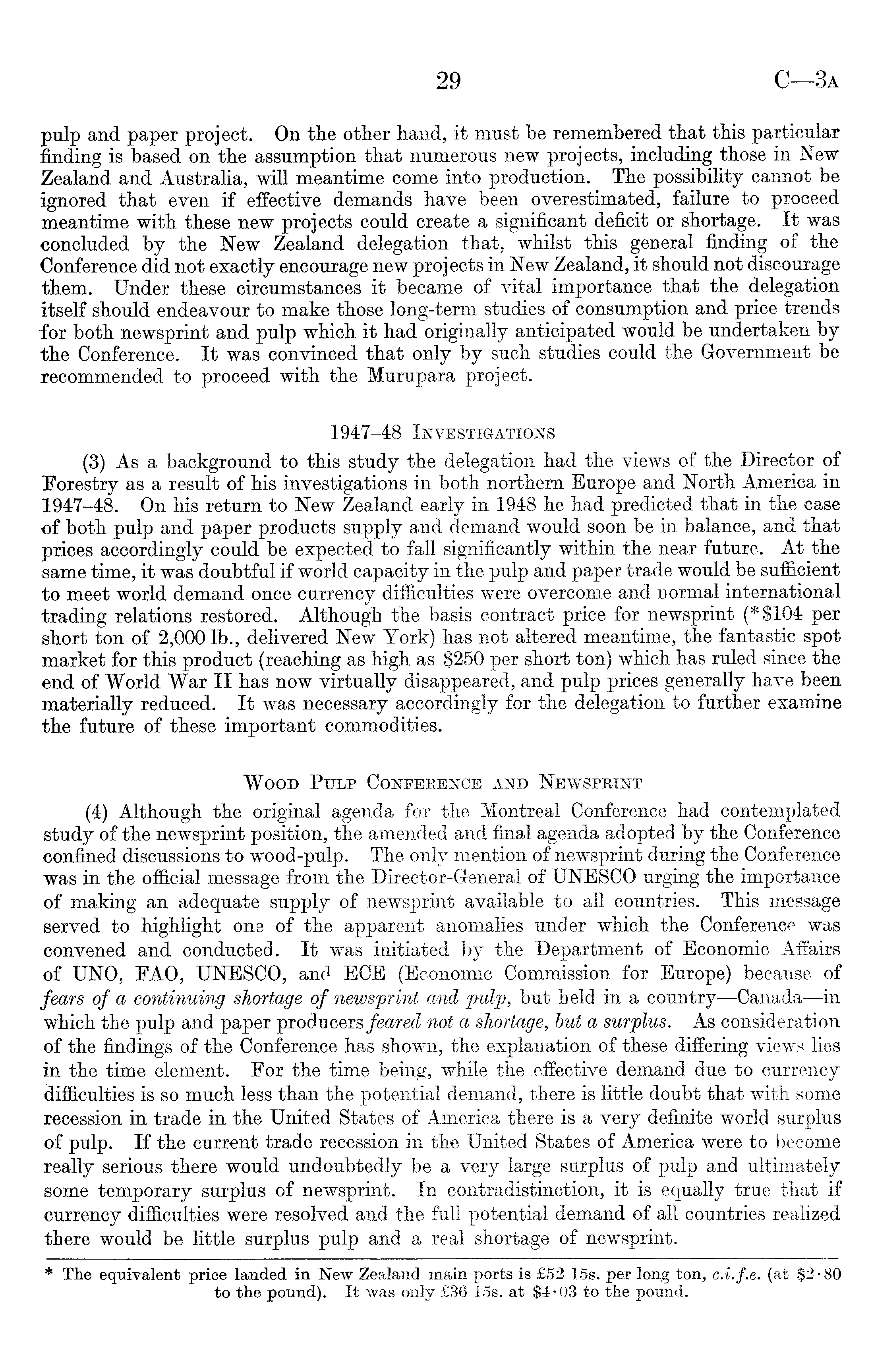 pulp and paper project. On the other hand, it must be remembered that this particular finding is based on the assumption that numerous new projects, including those in New Zealand and Australia, will meantime come into production. The possibility cannot be ignored that even if effective demands have been overestimated, failure to proceed meantime with these new projects could create a significant deficit or shortage. It was concluded by the New Zealand delegation that, whilst this general finding of the Conference did not exactly encourage new projects in New Zealand, it should not discourage them. Under these circumstances it became of vital importance that the delegation itself should endeavour to make those long-term studies of consumption and price trends for both newsprint and pulp which it had originally anticipated would be undertaken by the Conference. It was convinced that only by such studies could the Government be xecommended to proceed with the Murupara project. 1947-48 Investigations (3) As a background to this study the delegation had the views of the Director of forestry as a result of his investigations in both northern Europe and North America in 1947-48. On his return to New Zealand early in 1948 he had predicted that in the case of both pulp and paper products supply and demand would soon be in balance, and that prices accordingly could be expected to fall significantly within the near future. At the same time, it was doubtful if world capacity in the pulp and paper trade would be sufficient to meet world demand once currency difficulties were overcome and normal international trading relations restored. Although the basis contract price for newsprint (*slo4 per short ton of 2,000 lb., delivered New York) has not altered meantime, the fantastic spot market for this product (reaching as high as $250 per short ton) which has ruled since the end of World War II has now virtually disappeared, and pulp prices generally have been materially reduced. It was necessary accordingly for the delegation to further examine the future of these important commodities. Wood Pulp Conference and Newsprint (4) Although the original agenda for the Montreal Conference had contemplated study of the newsprint position, the amended and final agenda adopted by the Conference confined discussions to wood-pulp. The only mention of newsprint during the Conference was in the official message from the Director-General of UNESCO urging the importance of making an adequate supply of newsprint available to all countries. This message served to highlight one of the apparent anomalies under which the Conference was convened and conducted. It was initiated by the Department of Economic Affairs of UNO, EAO, UNESCO, and ECE (Economic Commission for Europe) because of fears of a continuing shortage of newsprint and pulp, but held in a country—Canada—in which the pulp and paper producers feared not a shortage, but a surplus. As consideration of the findings of the Conference has shown, the explanation of these differing views lies in the time element. For the time being, while the effective demand due to currency difficulties is so much less than the potential demand, there is little doubt that with some recession in trade in the United States of America there is a very definite world surplus of pulp. If the current trade recession in the United States of America were to become really serious there would undoubtedly be a very large surplus of pulp and ultimately some temporary surplus of newsprint. In contradistinction, it is equally true that if currency difficulties were resolved and the full potential demand of all countries realized there would be little surplus pulp and a real shortage of newsprint.