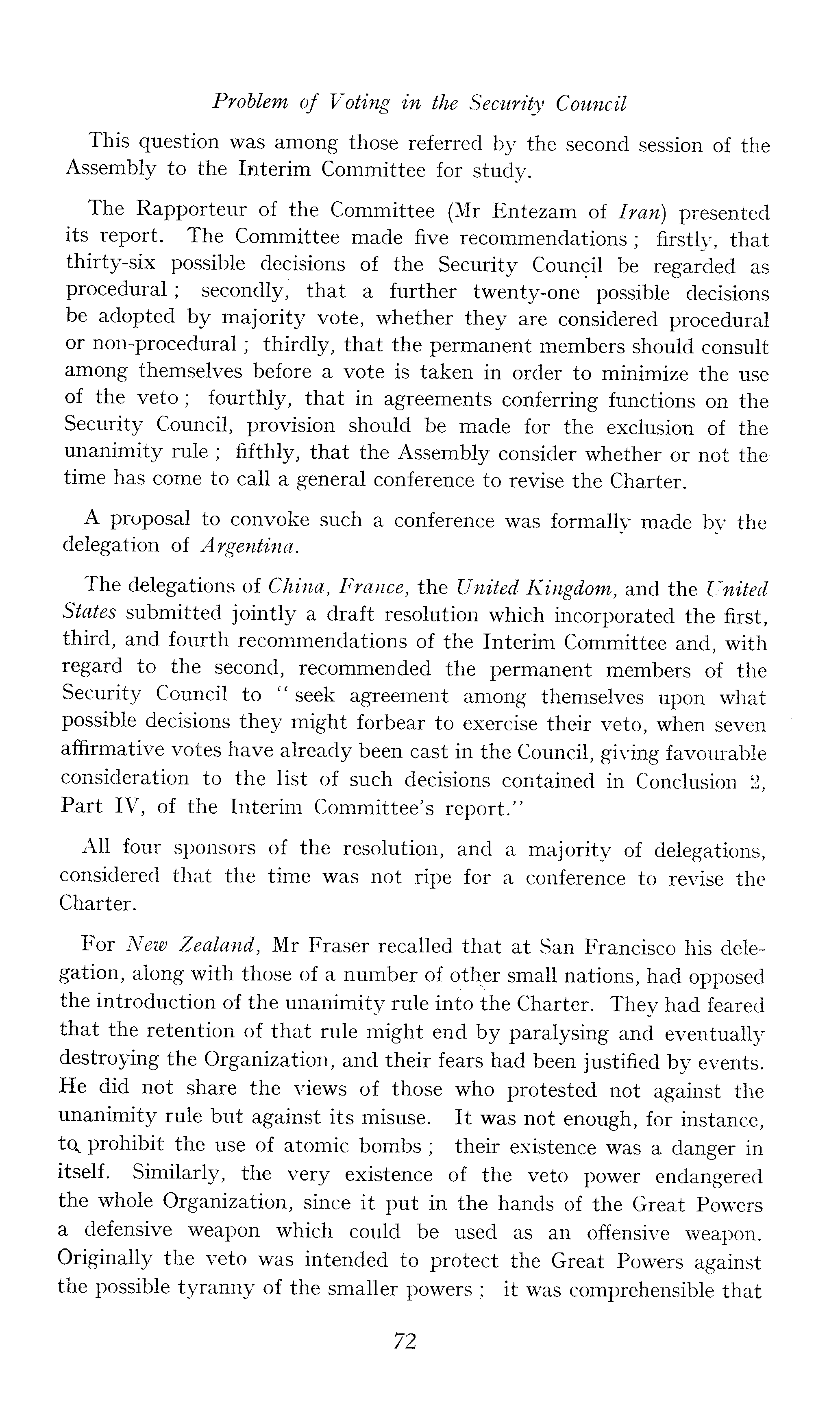 Problem of Voting in the Security Council This question was among those referred by the second session of the Assembly to the Interim Committee for study. The Rapporteur of the Committee (Mr Entezam of Iran) presented its report. The Committee made five recommendations ; firstly, that thirty-six possible decisions of the Security Council be regarded as procedural; secondly, that a further twenty-one possible decisions be adopted by majority vote, whether they are considered procedural or non-procedural ; thirdly, that the permanent members should consult among themselves before a vote is taken in order to minimize the use of the veto ; fourthly, that in agreements conferring functions on the Security Council, provision should be made for the exclusion of the unanimity rule ; fifthly, that the Assembly consider whether or not the time has come to call a general conference to revise the Charter. A proposal to convoke such a conference was formally made by the delegation of Argentina. The delegations of China, France, the United Kingdom, and the United States submitted jointly a draft resolution which incorporated the first, third, and fourth recommendations of the Interim Committee and, with regard to the second, recommended the permanent members of the Security Council to " seek agreement among themselves upon what possible decisions they might forbear to exercise their veto, when seven affirmative votes have already been cast in the Council, giving favourable consideration to the list of such decisions contained in Conclusion 2, Part IV, of the Interim Committee's report." All four sponsors of the resolution, and a majority of delegations, considered that the time was not ripe for a conference to revise the Charter. For New Zealand, Mr Fraser recalled that at San Francisco his delegation, along with those of a number of other small nations, had opposed the introduction of the unanimity rule into the Charter. They had feared that the retention of that rule might end by paralysing and eventually destroying the Organization, and their fears had been justified by events. He did not share the views of those who protested not against the unanimity rule but against its misuse. It was not enough, for instance, ta prohibit the use of atomic bombs ; their existence was a danger in itself. Similarly, the very existence of the veto power endangered the whole Organization, since it put in the hands of the Great Powers a defensive weapon which could be used as an offensive weapon. Originally the veto was intended to protect the Great Powers against the possible tyranny of the smaller powers ; it was comprehensible that
