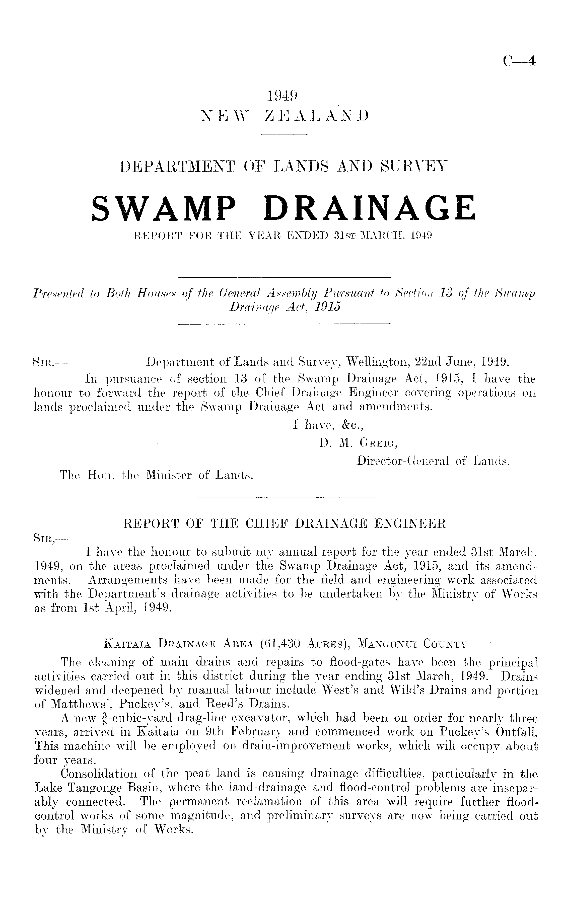 Sir, — Department of Lands and Survey, Wellington, 22nd June, 1949. In pursuance of section 13 of the Swamp Drainage Act, 1915, I have the honour to forward the report of the Chief Drainage Engineer covering operations on lands proclaimed under the Swamp Drainage Act and amendments. I have, &c., D. M. G-reig, Director-General of Lands. The Hon. the Minister of Lands.