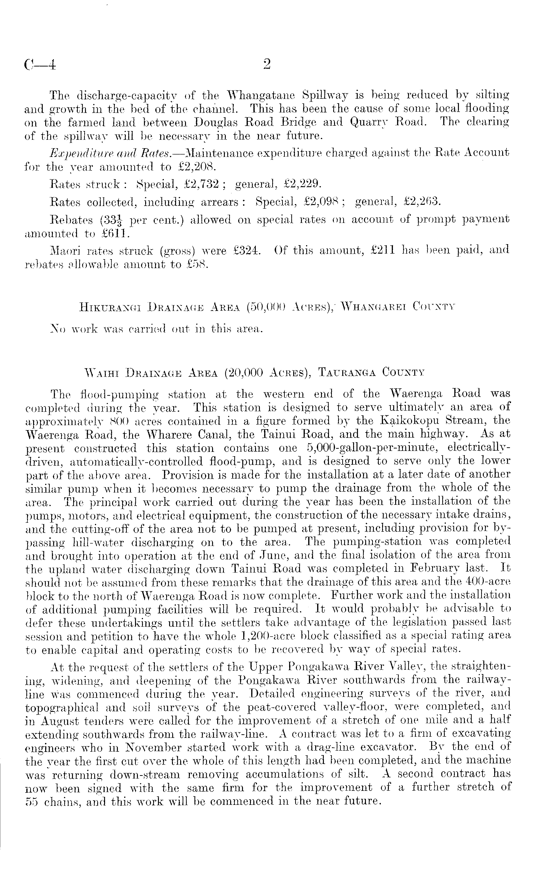 The discharge-capacity of the Whangatane Spillway is being reduced by silting and growth in the bed of the channel. This has been the cause of some local flooding on the farmed land between Douglas Road Bridge and Quarry Road. The clearing of the spillway will be necessary in the near future. Expenditure and Rates.—Maintenance expenditure charged against the Rate Account for the year amounted to £2,208. Rates struck : Special, £2,732 ; general, £2,229. Rates collected, including arrears : Special, £2,098 ; general, £2,263. Rebates (33J per cent.) allowed on special rates on account of prompt payment amounted to £6ll. Maori rates struck (gross) were £324. Of this amount, £2ll has been paid, and rebates allowable amount to £5B. Hikurangi Drainage Area (50,000 Acres),' Whangarei County No work was carried out in this area. Waihi Drainage Area (20,000 Acres), Tauranga County The flood-pumping station at the western end of the Waerenga Road was completed during the year. This station is designed to serve ultimately an area of approximately 800 acres contained in a figure formed by the Kaikokopu Stream, the Waerenga Road, the Wharere Canal, the Tainui Road, and the main highway. As at present constructed this station contains one 5,000-gallon-per-minute, electricallydriven, automatically-controlled flood-pump, and is designed to serve only the lower part of the above area. Provision is made for the installation at a later date of another similar pump when it becomes necessary to pump the drainage from the whole of the area. The principal work carried out during the year has been the installation of the pumps, motors, and electrical equipment, the construction of the necessary intake drains, and the cutting-off of the area not to be pumped at present, including provision for bypassing hill-water discharging on to the area. The pumping-station was completed and brought into operation at the end of June, and the final isolation of the area from the upland water discharging down Tainui Road was completed in February last. It should not be assumed from these remarks that the drainage of this area and the 400-acre block to the north of Waerenga Road is now complete. Further work and the installation of additional pumping facilities will be required. It would probably be advisable to defer these undertakings until the settlers take advantage of the legislation passed last session and petition to have the whole 1,200-acre block classified as a special rating area to enable capital and operating costs to be recovered by way of special rates. At the request of the settlers of the Upper Pongakawa River Valley, the straightening, widening, and deepening of the Pongakawa River southwards from the railwayline was commenced during the year. Detailed engineering surveys of the river, and topographical and soil surveys of the peat-covered valley-floor, were completed, and in August tenders were called for the improvement of a stretch of one mile and a half extending southwards from the railway-line. A contract was let to a firm of excavating engineers who in November started work with a drag-line excavator. By the end of the year the first cut over the whole of this length had been completed, and the machine was returning down-stream removing accumulations of silt. A second contract has now been signed with the same firm for the improvement of a further stretch of 55 chains, and this work will be commenced in the near future.