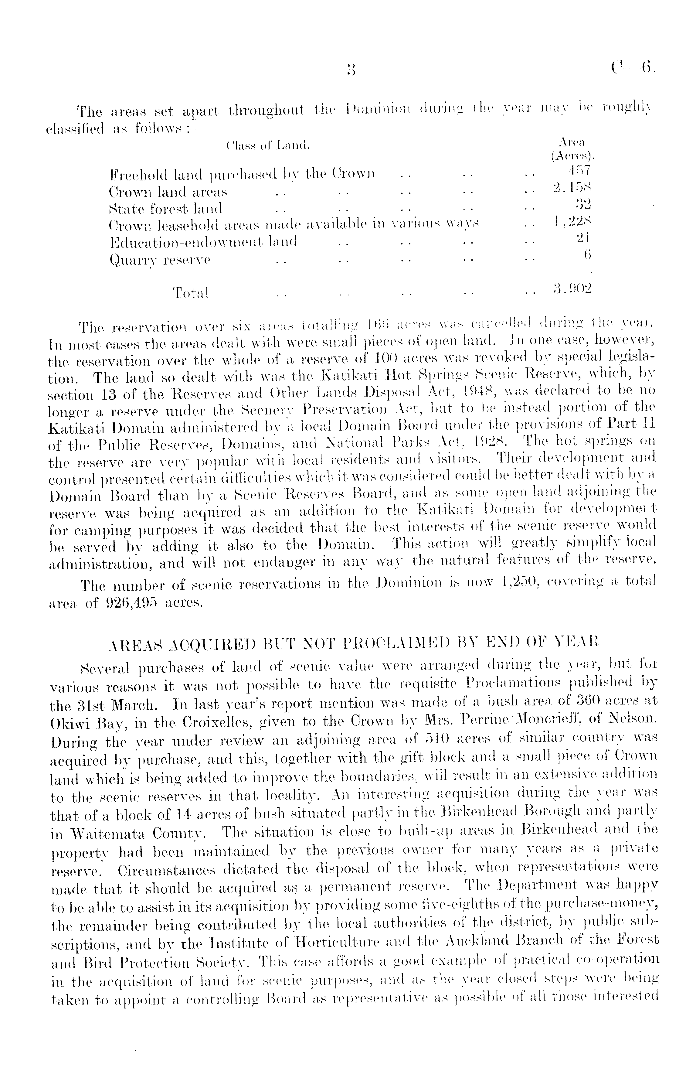 The areas set apart throughout the Dominion during the year may be roughly classified as follows : Class of Land. Area (Acres). Freehold land purchased by the Crown .. .. • • 457 Crown land areas .. •• •• •• «• 2 >l5B State forest land . . • ■ • • ■ • • • Crown leasehold areas made available in various ways .. 1,228 Education-endowment land .. .. • ■ • • 21 Quarry reserve .. •• •• • • •• " Total .. 3 > 902 The reservation over six areas totalling 166 acres was cancelled during the year. In most cases the areas dealt with were small pieces of open land. In one case, however, the reservation over the whole of a reserve of 100 acres was revoked by special legislation. The land so dealt with was the Katikati Hot Springs Scenic Reserve, which, by section 13 of the Reserves and Other Lands Disposal Act, 1948, was declared to be no longer a reserve under the Scenery Preservation Act, but to be instead portion of the Katikati Domain administered by a local Domain Board under the provisions of Part II of the Public Reserves, Domains, and National Parks Act, 1928. The hot springs on the reserve are very popular with local residents and visitors. Their development and control presented certain difficulties which it was considered could be better dealt with by a Domain Board than by a Scenic Reserves Board, and as some open land adjoining the reserve was being acquired as an addition to the Katikati Domain for development for camping purposes it was decided that the best interests of the scenic reserve would be served by adding it also to the Domain. This action will greatly simplify local administration, and will not endanger in any way the natural features of the reserve. The number of scenic reservations in the Dominion is now 1,250, covering a total area of 926,495 acres. AREAS ACQUIRED BUT NOT PROCLAIMED BY END OF YEAR Several purchases of land of scenic value were arranged during the year, but for various reasons it was not possible to have the requisite Proclamations published by the 31st March. In last year's report mention was made of a bush area of 360 acres at Okiwi Bay, in the Croixelles, given to the Crown by Mrs. Perrine Moncrieff, of Nelson. During the year under review an adjoining area of 510 acres of similar country was acquired by purchase, and this, together with the gift block and a small piece of Crown land which is being added to improve the boundaries, will result in an extensive addition to the scenic reserves in that locality. An interesting acquisition during the year was that of a block of 14 acres of bush.situated partly in the Birkenhead Borough and partly in Waitemata County. The situation is close to built-up areas in Birkenhead and the had been maintained by the previous owner for many years as a private reserve. Circumstances dictated the disposal of the block, when representations were made that it should be acquired as a permanent reserve. The Department was happy to be able to assist in its acquisition by providing some five-eighths of the purchase-money, the remainder being contributed by the local authorities of the district, by public subscriptions, and by the Institute of Horticulture and the Auckland Branch of the Forest and Bird Protection Society. This case affords a good example of practical co-operation in the acquisition of land for scenic purposes, and as the year closed steps were being taken to appoint a controlling Board as representative as possible of all those interested
