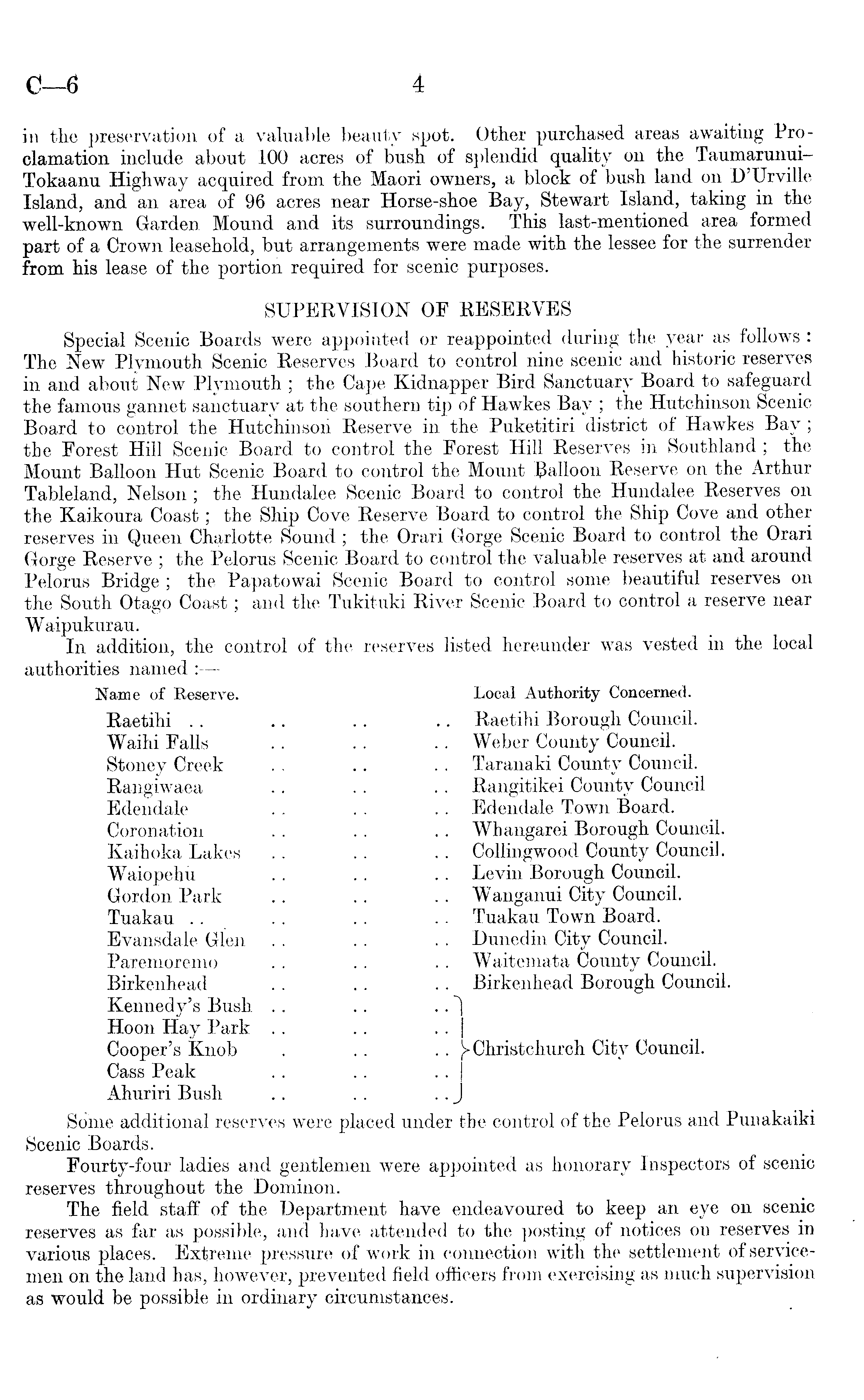 in the preservation of a valuable beauty spot. Other purchased areas awaiting Proclamation include about 100 acres of bush of splendid quality on the TaumarunuiTokaanu Highway acquired from the Maori owners, a block of bush land on D'Urville Island, and an area of 96 acres near Horse-shoe Bay, Stewart Island, taking in the well-known Garden Mound and its surroundings. This last-mentioned area formed part of a Crown leasehold, but arrangements were made with the lessee for the surrender from his lease of the portion required for scenic purposes. SUPERVISION OF RESERVES Special Scenic Boards were appointed or reappointed during the year as follows : The New Plymouth Scenic Reserves Board to control nine scenic and historic reserves in and about New Plymouth ; the Cape Kidnapper Bird Sanctuary Board to safeguard the famous gannet sanctuary at the southern tip of Hawkes Bay ; the Hutchinson Scenic Board to control the Hutchinsoii Reserve in the Puketitiri district of Hawkes Bay ; the Forest Hill Scenic Board to control the Forest Hill Reserves in Southland ; the Mount Balloon Hut Scenic Board to control the Mount galloon Reserve on the Arthur Tableland, Nelson ; the Hundalee Scenic Board to control the Hundalee Reserves on the Kaikoura Coast; the Ship Cove Reserve Board to control the Ship Cove and.other reserves in Queen Charlotte Sound ; the Orari Gorge Scenic Board to control the Orari Gorge Reserve ; the Pelorus Scenic Board to control the valuable reserves at and around Pelorus Bridge ; the Papatowai Scenic Board to control some beautiful reserves on the South Otago Coast; and the Tukituki River Scenic Board to control a reserve near Waipukurau. In addition, the control of the reserves listed hereunder was vested in the local authorities named : Name of Reserve. Local Authority Concerned. Raetihi .. .. .. .. Raetihi Borough Council. Waihi Falls .. .. .. Weber County Council. Stoney Creek .. .. .. Taranaki County Council. Rangiwaea .. .. .. Rangitikei County Council Edendale . . . . .. Edendale Town Board. Coronation .. .. .. Whangarei Borough Council. Kaihoka Lakes .. .. .. Collingwood County Council. Waiopehu .. .. . . Levin Borough Council. Gordon Park .. .. .. Wanganui City Council. Tuakau .. . .. .. Tuakau Town Board. Evansdale Glen .. .. .. Dunedin City Council. Paremoremo .. .. .. Waitemata County Council. Birkenhead .. .. .. Birkenhead Borough Council. Kennedy's Bush Hoon Hay Parkv .. .. .. | Cooper's Knob \ .. .. J>Christchurch City Council. Cass Peak .. .. .. j Ahuriri Bush .. .. .. J Some additional reserves were placed under the control of the Pelorus and Punakaiki Scenic Boards. Fourty-four ladies and gentlemen were appointed as honorary Inspectors of scenic reserves throughout the Dominon. The field staff of the Department have endeavoured to keep an eye on scenic reserves as far as possible, and have attended to the posting of notices on reserves in various places. Extreme pressure of work in connection with the settlement of servicemen on the land has, however, prevented field officers from exercising as much supervision as would be possible in ordinary circumstances.