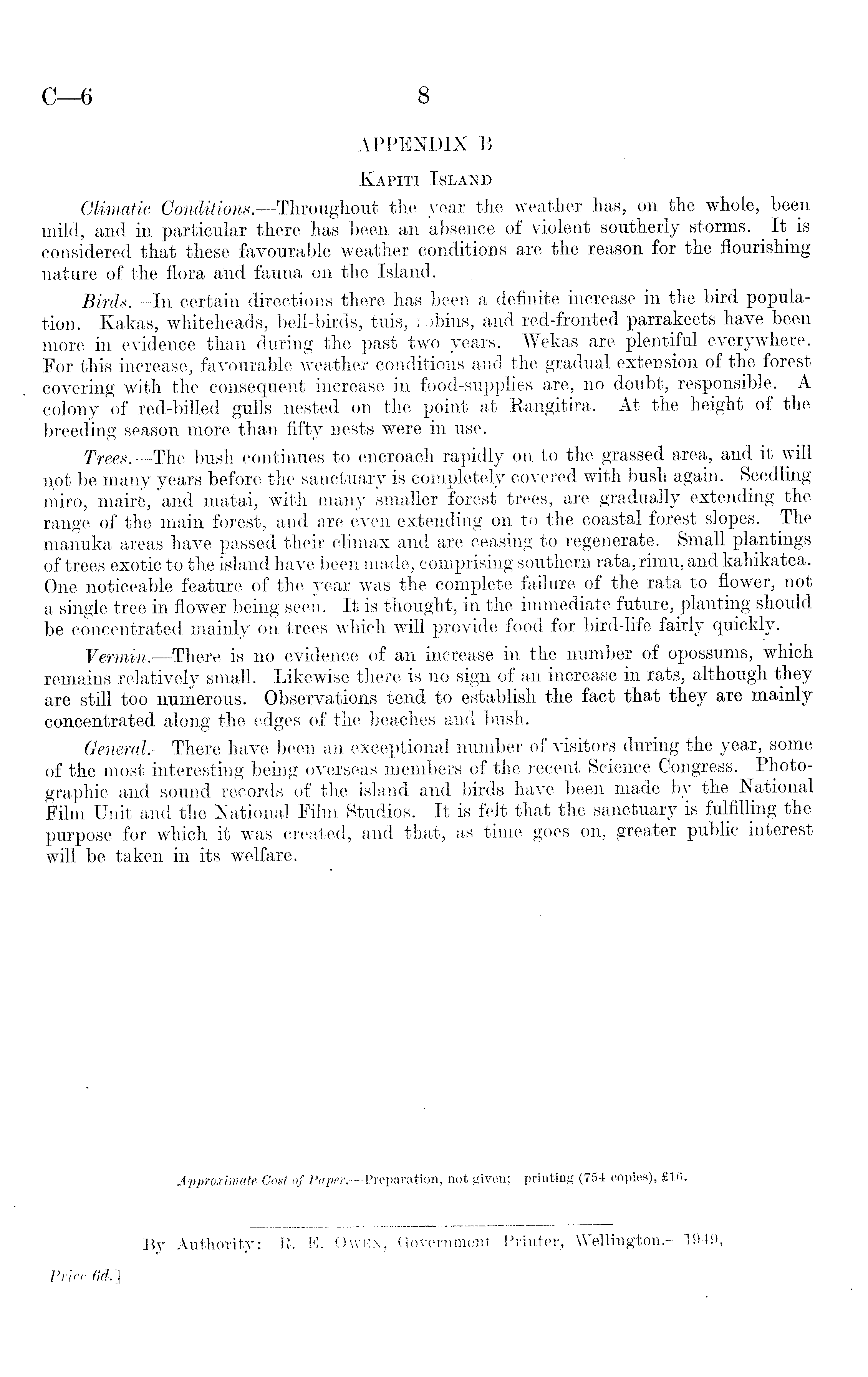 APPENDIX B Kapiti Island Climatic Conditions —Throughout the year the weather has, on the whole, been mild, and in particular there has been an absence of violent southerly storms. It is considered that these favourable weather conditions are the reason for the flourishing nature of the flora and fauna on the Island. Birds. —In certain directions there has been a definite increase in the bird population. Kakas, whiteheads, bell-birds, tuis, j obins, and red-fronted parrakeets have been more in evidence than during the past two years. Wekas are plentiful everywhere. For this increase, favourable weather conditions and the gradual extension of the forest covering with the consequent increase in food-supplies are, no doubt, responsible. A colony of red-billed gulls nested on the point at Rangitira. At the height of the breeding season more than fifty nests were in use. Trees. —The bush continues to encroach rapidly on to the grassed area, and it will not be many years before the sanctuary is completely covered with bush again. Seedling miro, mairc, and matai, with many smaller forest trees, are gradually extending the range of the main forest, and are even extending on to the coastal forest slopes. The manuka areas have passed their climax and are ceasing to regenerate. Small plantings of trees exotic to the island have been made, comprising southern rata, rimu, and kahikatea. One noticeable feature of the year was the complete failure of the rata to flower, not a single tree in flower being seen. It is thought, in the immediate future, planting should be concentrated mainly on trees which will provide food for bird-life fairly quickly. Vermin. —There is no evidence of an increase in the number of opossums, which remains relatively small. Likewise there is no sign of an increase in rats, although they are still too numerous. Observations tend to establish the fact that they are mainly concentrated along the edges of the beaches and bush. General. —There have been an exceptional number of visitors during the year, some of the most interesting being overseas members of the recent Science Congress. Photographic and sound records of the island and birds have been made by the National Film Unit and the National Film Studios. It is felt that the sanctuary is fulfilling the purpose for which it was created, and that, as time goes on, greater public interest will be taken in its welfare.