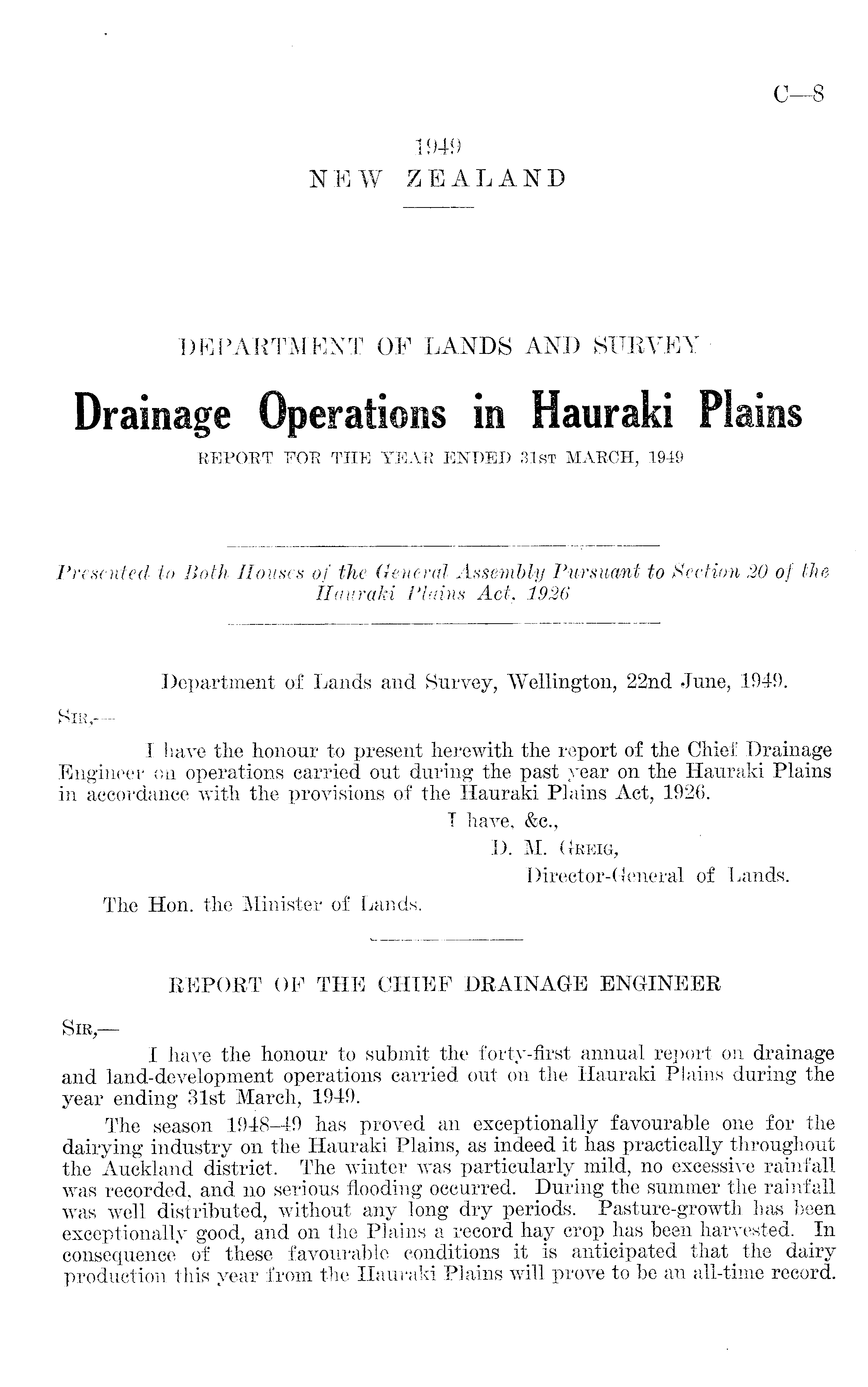 Department of Lands and Survey, Wellington, 22nd June, 1949. Sir I have the honour to present herewith the report of the Chief Drainage Engineer on operations carried out during the past year on the Hauraki Plains in accordance with the provisions of the Hauraki Plains Act, 1926. I have, &c., D. M. Greig, Director-General of Lands. The Hon. the Minister of Lands. REPORT OP THE CHIEF DRAINAGE ENGINEER Sir, — I have the honour to submit the forty-first annual report on drainage and land-development operations carried out on the Hauraki Plains during the year ending 31st March, 1949. The season 1948-49 has proved an exceptionally favourable one for the dairying industry on the Hauraki Plains, as indeed it has practically throughout the Auckland district. The winter was particularly mild, no excessive rainfall was recorded, and no serious flooding occurred. During the summer the rainfall was well distributed, without any long dry periods. Pasture-growth has been exceptionally good, and on the Plains a record hay crop has been harvested. In consequence of these favourable conditions it is anticipated that the dairy production this year from the Hauraki Plains will prove to be an all-time record.