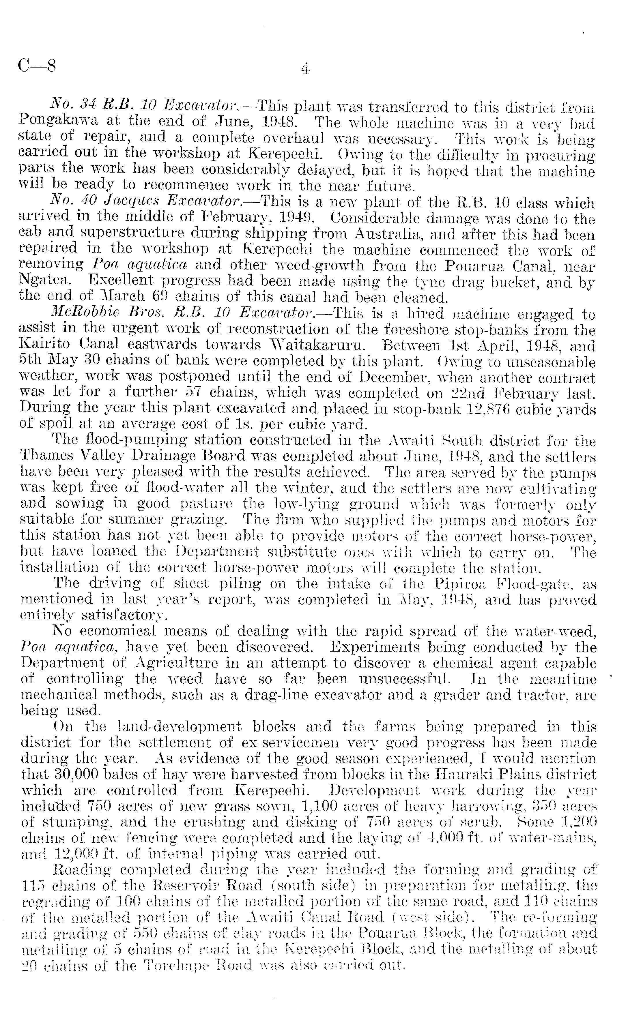 No. 34 R.B. 10 Excavator.—This plant was transferred to this district from Pongakawa at the end of June, 1948. The whole machine was in a very bad state of repair, and a complete overhaul was necessary. This work is being carried out in the workshop at Kerepeehi. Owing to the difficulty in procuring parts the work- has been considerably delayed, but it is hoped that the machine will be ready to recommence work in the near future. _ No. 40 Jacques Excavator.—This is a new plant of the R.B. 10 class which arrived in the middle of February, 1949. Considerable damage was done to the cab and superstructure during shipping from Australia, and after this had been repaired in the workshop at Kerepeehi the machine commenced the work of removing Poa aquatica and other weed-growth from the Pouarua Canal, near Ngatea. Excellent progress had been made using the tyne drag bucket, and by the end of March 69 chains of this canal had been cleaned. Mcßobbie Bros. R.B. 10 Excavator.—This is a hired machine engaged to assist in the urgent work of reconstruction of the foreshore stop-banks from the Kairito Canal eastwards towards "Waitakaruru. Between Ist April, 1948, and sth May'3o chains of bank were completed by this plant. Owing to unseasonable weather, work was postponed until the end of December, when another contract was let for a further 57 chains, which was completed on 22nd February last. During the year this plant excavated and placed in stop-bank 12,876 cubic yards of spoil at an average cost of Is. per cubic yard. The flood-pumping station constructed in the Awaiti South district for the Thames Valley Drainage Board was completed about June, 1948, and the settlers have been very pleased with the results achieved. The area served by the pumps was kept free of flood-water all the winter, and the settlers are now cultivating and sowing in good pasture the low-lying ground which was formerly only suitable for summer grazing. The firm who supplied the pumps and motors for this station has not yet been able to provide motors of the correct horse-power, but have loaned the Department substitute ones with which to carry on. The installation of the correct horse-power motors will complete the station. The driving of sheet piling on the intake of the Pipiroa Flood-gate, as mentioned in last year's report, was completed in May, 1948, and has proved entirely satisfactory. No economical means of dealing with the rapid spread of the water-weed, Poa aquatica, have yet been discovered. Experiments being conducted by the Department of Agriculture in an attempt to discover a chemical agent capable of controlling the weed have so far been unsuccessful. In the meantime mechanical methods, such as a drag-line excavator and a grader and tractor, are being used. On the land-development blocks and the farms being prepared in this district for the settlement of ex-servicemen very good progress has been made during .the year. As evidence of the good season experienced, I would mention that 30,000 bales of hay were harvested from blocks in the Hauraki Plains district which are controlled from Kerepeehi. Development work during the year included 750 acres of new grass sown, 1,100 acres of heavy harrowing, 350 acres of stumping, and the crushing and disking of 750 acres of scrub. Some 1,200= chains of new fencing were completed and the laying of 4,000 ft. of water-mains, and 12,000 ft. of internal piping was carried out. Roading completed during the year included the forming and grading of 115 chains of the Reservoir Road (south side) in preparation for metalling, the regrading of 100 chains of the metalled portion of the same road, and 110 chains of the metalled portion of the Awaiti Canal Road (west side). The re-forming and grading of 550 chains of clay roads in the Pouarua Block, the formation and metalling of 5 chains of road in the Kerepeehi Block, and the metalling of about 20 chains of the Torehape Road was also carried out.