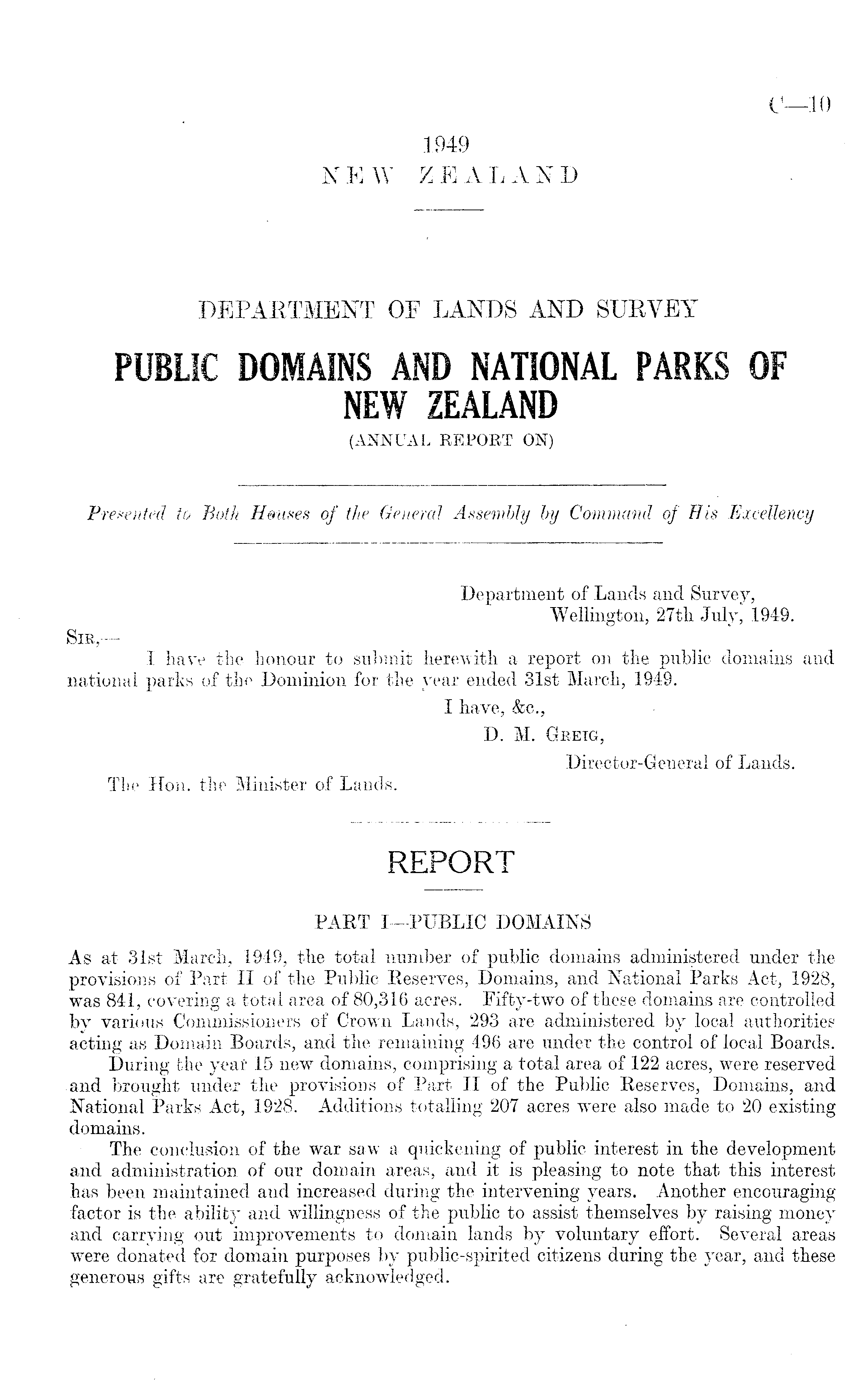 Department of Lands and Survey, Wellington, 27th July, .1949. Sir, — I have % the honour to submit herewith a report on the public domains and national parks of the Dominion for the year ended 31st March, 1949. I have, &c., D. M. Greig, Director-General of Lands. The Hon. the Minister of Lands.