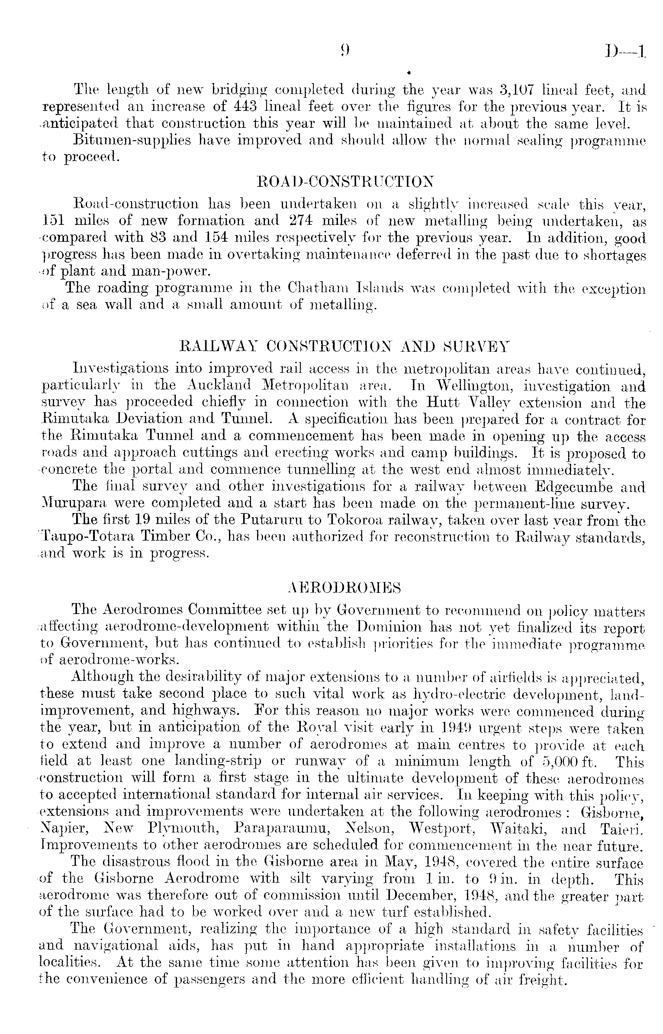 The length of new bridging completed during the year was 3,107 lineal feet, and represented an increase of 443 lineal feet over the figures for the previous year. It is .anticipated that construction this year will be maintained at about the same level. Bitumen-supplies have improved and should allow the normal sealing programme to proceed. ROAD-CONSTRUCTION Road-construction has been undertaken on a slightly increased scale this year, 151 miles of new formation and 274 miles of new metalling being undertaken, as •compared with 83 and 154 miles respectively for the previous year. In addition, good progress has been made in overtaking maintenance deferred in the past due to shortages of plant and man-power. The roading programme in the Chatham Islands was completed with the exception -of a sea wall and a small amount of metalling. RAILWAY CONSTRUCTION AND SURVEY Investigations into improved rail access in the metropolitan areas have continued, particularly in the Auckland Metropolitan area. In Wellington, investigation and survey has proceeded chiefly in connection with the Hutt Valley extension and the Rimutaka Deviation and Tunnel. A specification has been prepared for a contract for the Rimutaka Tunnel and a commencement has been made in opening up the access roads and approach cuttings and erecting works and camp buildings. It is proposed to •concrete the portal and commence tunnelling at the west end almost immediately. The final survey and other investigations for a railway between Edgecumbe and Murupara were completed and a start has been made on the permanent-line survey. The first 19 miles of the Putaruru to Tokoroa railway, taken over last year from the Taupo-Totara Timber Co., has been authorized for reconstruction to Railway standards, .and work is in progress. AERODROMES The Aerodromes Committee set up by Government to recommend on policy matters •affecting aerodrome-development within the Dominion has not yet finalized its report to Government, but has continued to establish priorities for the immediate programme of aerodrome-works. Although the desirability of major extensions to a number of airfields is appreciated, these must take second place to such vital work as hydro-electric development, landimprovement, and highways. For this reason.no major works were commenced during the year, but in anticipation of the Royal visit early in 1949 urgent steps were taken to extend and improve a number of aerodromes at main centres to provide at each field at least one landing-strip or runway of a minimum length of 5,000 ft. This •construction will form a first stage in the ultimate development of these aerodromes to accepted international standard for internal air services. In keeping with this policy, •extensions and improvements were undertaken at the following aerodromes : Gisborne, Napier, New Plymouth, Paraparaumu, Nelson, Westport, Waitaki, and Taieri. Improvements to other aerodromes are scheduled for commencement in the near future. The disastrous flood in the Gisborne area in May, 1948, covered the entire surface •of the Gisborne Aerodrome with silt varying from 1 in. to 9 in. in depth. This .aerodrome was therefore out of commission until December, 1948, and the greater part of the surface had to be worked over and a new turf established. The Government, realizing the importance of a high standard in safety facilities and navigational aids, has put in hand appropriate installations in a number of localities. At the same time some attention has been given to improving facilities for the convenience of passengers and the more efficient handling of air freight.