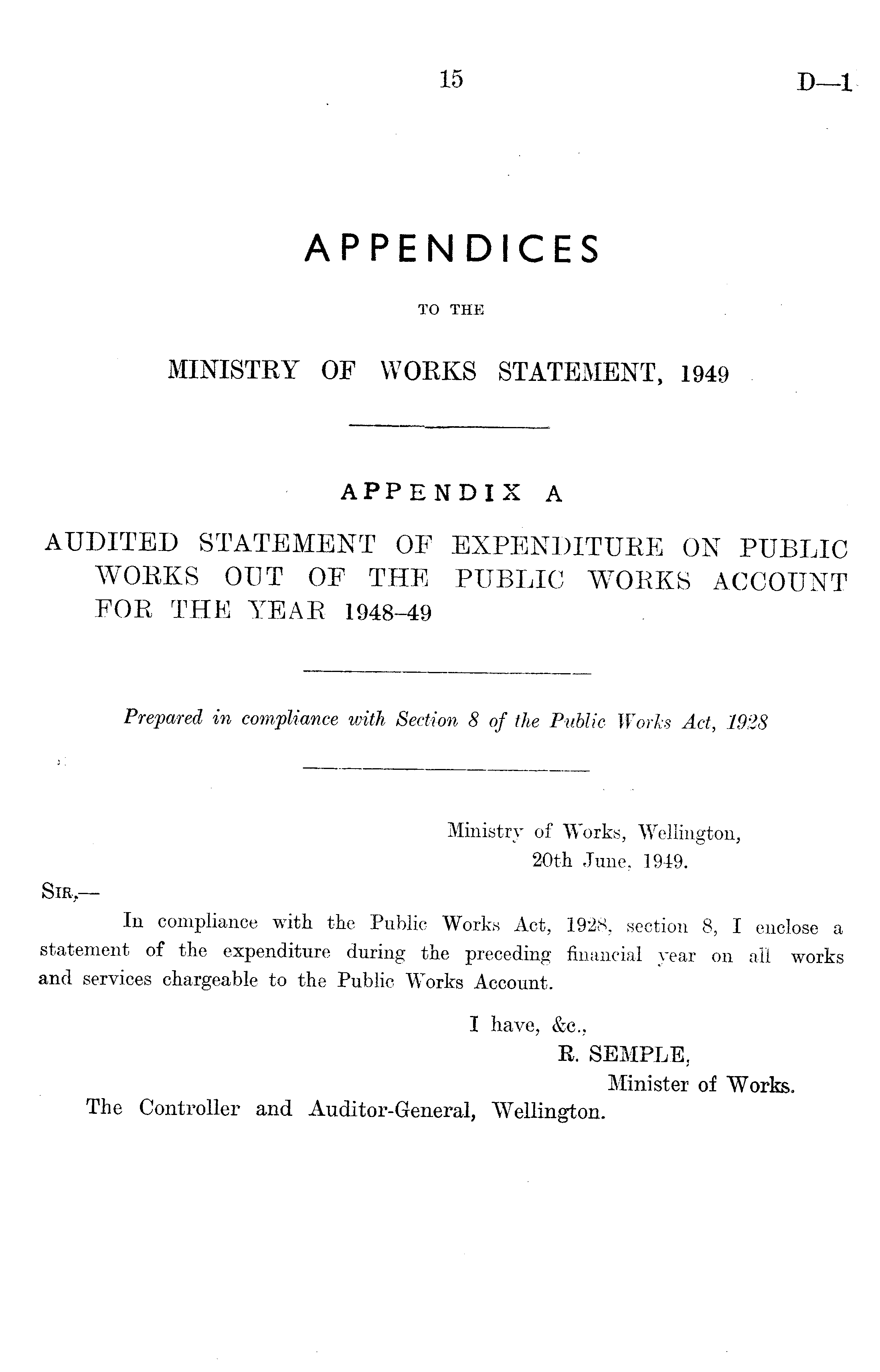 Ministry of Works, Wellington, 20th June, 1949. Sir, — In compliance with the Public Works Act, 1928, section 8, I enclose a statement of the expenditure during the preceding financial year on all works and services chargeable to the Public Works Account. I have, &c., U. SEMPLE. Minister of Works. The Controller and Auditor-General, Wellington.