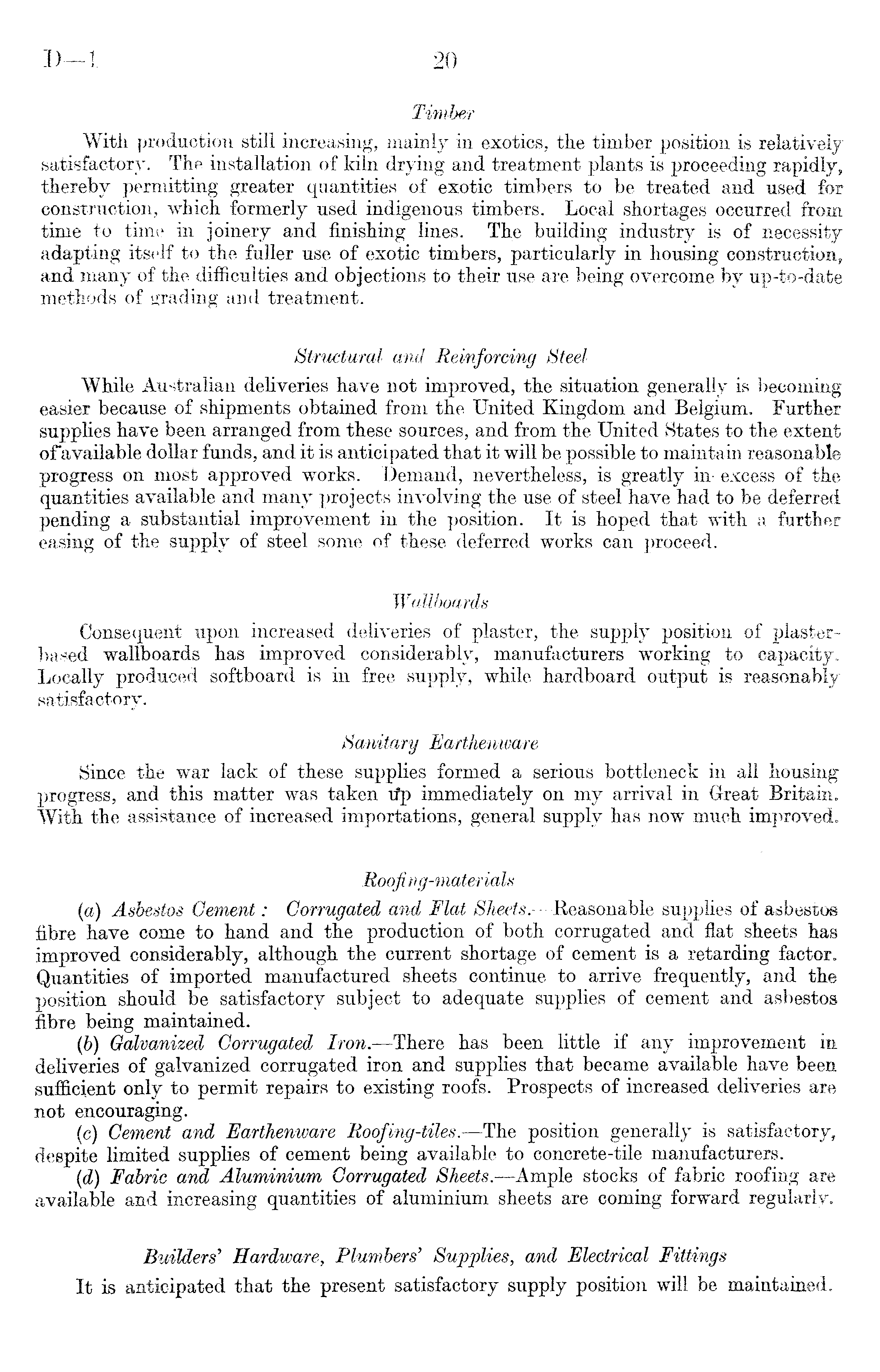 Timber Witli production still increasing, mainly in exotics, the timber position is relatively satisfactory. The installation of kiln drying and treatment plants is proceeding rapidly, thereby permitting greater quantities of exotic timbers to be treated and used for construction, which formerly used indigenous timbers. Local shortages occurred from time to time in joinery and finishing lines. The building industry is of necessity adapting itself to the fuller use of exotic timbers, particularly in housing construction, and many of the difficulties and objections to their use are being overcome by up-to-date methods of grading and treatment. Structural and Reinforcing Steel While Australian deliveries have not improved, the situation generally is becoming easier because of shipments obtained from the United Kingdom and Belgium. Further supplies have been arranged from these sources, and from the United States to the extent of available dollar funds, and it is anticipated that it will be possible to maintain reasonable progress on most approved works. Demand, nevertheless, is greatly in excess of the quantities available and many projects involving the use of steel have had to be deferred pending a substantial improvement in the position. It is hoped that with a further easing of the supply of steel some of these deferred works can proceed. Wallboards Consequent upon increased deliveries of plaster, the supply position of plasterbased wallboards has improved considerably, manufacturers working to capacity. Locally produced softboard is in free supply, while hardboard output is reasonably satisfactory. Sanitary Earthenware Since the war lack of these supplies formed a serious bottleneck in all housing progress, and this matter was taken tfp immediately on my arrival in Great Britain. With the assistance of increased importations, general supply has now much improved. Roofing-materials (a) Asbestos Cement: Corrugated and Flat Sheets. —Reasonable supplies of asbestos fibre have come to hand and the production of both corrugated and flat sheets has improved considerably, although the current shortage of cement is a retarding factor. Quantities of imported manufactured sheets continue to arrive frequently, and the position should be satisfactory subject to adequate supplies of cement and asbestos fibre being maintained. (b) Galvanized Corrugated Iron.—There has been little if any improvement in deliveries of galvanized corrugated iron and supplies that became available have been sufficient only to permit repairs to existing roofs. Prospects of increased deliveries are not encouraging. (c) Cement and Earthenware Roofing-tiles. —The position generally is satisfactory, despite limited supplies of cement being available to concrete-tile manufacturers. (d) Fabric and Aluminium Corrugated Sheets. —Ample stocks of fabric roofing are available and increasing quantities of aluminium sheets are coming forward regularly. Builders'' Hardware, Plumbers' Supplies, and Electrical Fittings It is anticipated that the present satisfactory supply position will be maintained.