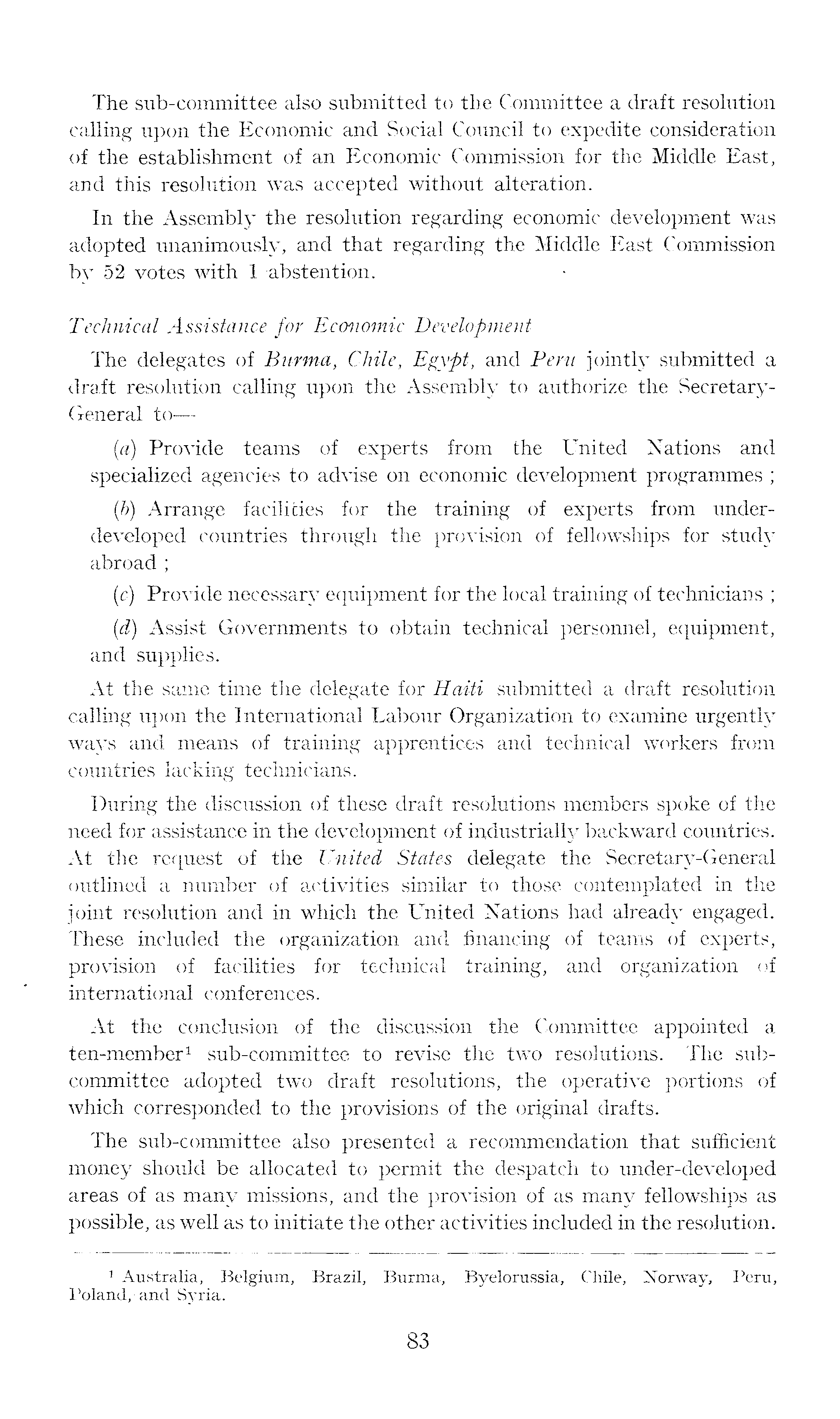 The sub-committee also submitted to the Committee a draft resolution calling upon the Economic and Social Council to expedite consideration of the establishment of an Economic Commission for the Middle East, and this resolution was accepted without alteration. In the Assembly the resolution regarding economic development was adopted unanimously, and that regarding the Middle East Commission by 52 votes with 1 abstention. Technical Assistance for Economic Development The delegates of Burma, Chile, Egypt, and Peru jointly submitted a draft resolution calling upon the Assembly to authorize the SecretaryGeneral to — (a) Provide teams of experts from the United Nations and specialized agencies to advise on economic development programmes ; (b) Arrange facilities for the training of experts from underdeveloped countries through the provision of fellowships for study abroad ; (c) Provide necessary equipment for the local training of technicians ; (d) Assist Governments to obtain technical personnel, equipment, and supplies. At the same time the delegate for Haiti submitted a draft resolution calling upon the International Labour Organization to examine urgently wavs and means of training apprentices and technical workers from countries lacking technicians. During the discussion of these draft resolutions members spoke of the need for assistance in the development of industrially backward countries. At the request of the United States delegate the Secretary-General outlined a number of activities similar to those contemplated in the joint resolution and in which the United Nations had already engaged. These included the organization and financing of teams of experts, provision of facilities for technical training, and organization of international conferences. At the conclusion of the discussion the Committee appointed a ten-member 1 sub-committee to revise the two resolutions. The subcommittee adopted two draft resolutions, the operative portions of which corresponded to the provisions of the original drafts. The sub-committee also presented a recommendation that sufficient money should be allocated to permit the despatch to under-developed areas of as many missions, and the provision of as many fellowships as possible, as well as to initiate the other activities included in the resolution.