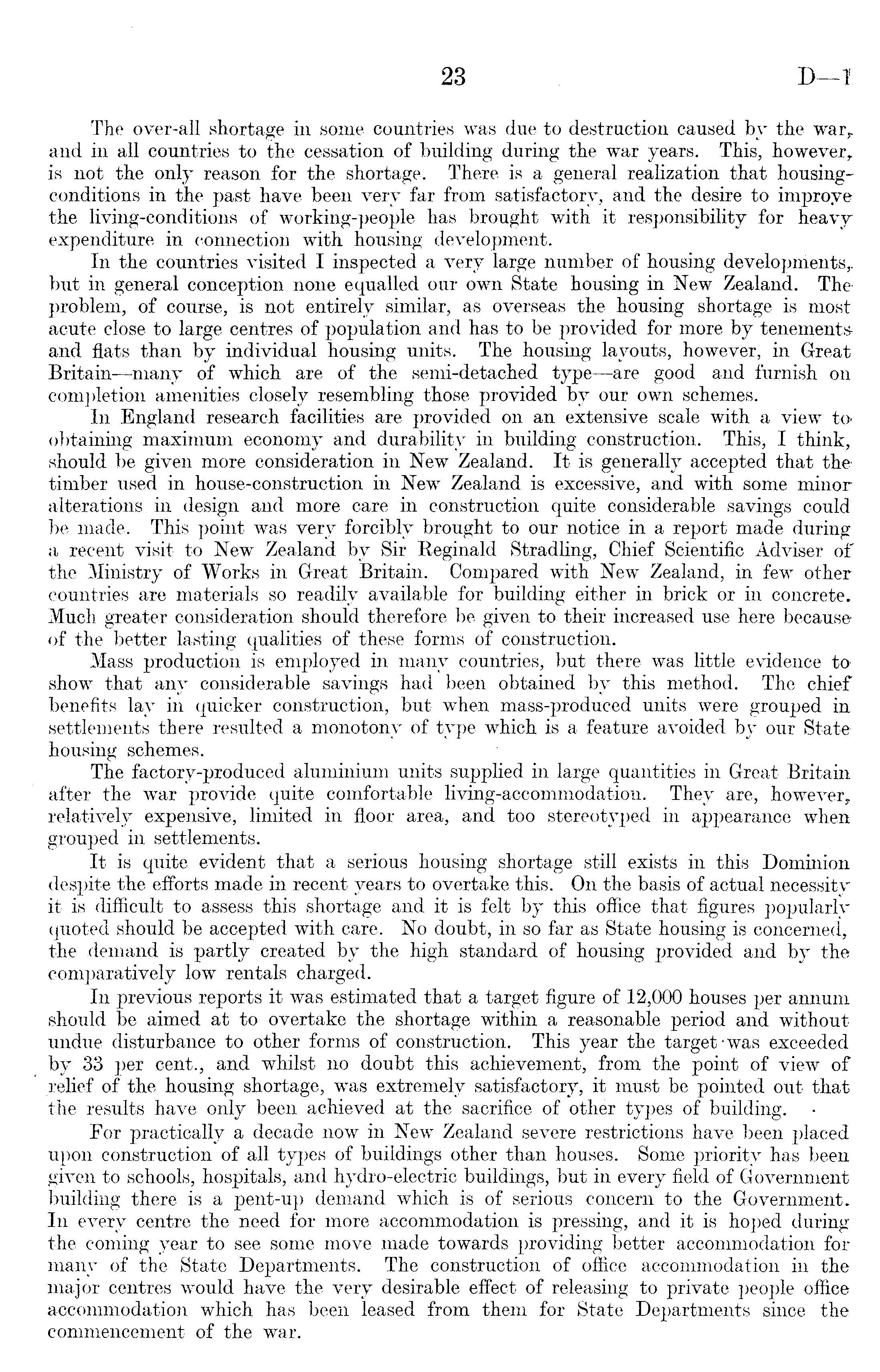 The over-all shortage in some countries was due to destruction caused by the war, and in all countries to the cessation of building during the war years. This, however, is not the only reason for the shortage. There is a general realization that housingconditions in the past have been very far from satisfactory, and the desire to impro.ve the living-conditions of working-people has brought with it responsibility for heavy expenditure in connection with housing development. In the countries visited I inspected a very large number of housing developments, but in general conception none equalled our own State housing in New Zealand. The problem, of course, is not entirely similar, as overseas the housing shortage is most acute close to large centres of population and has to be provided for more by tenements, and flats than by individual housing units. The housing layouts, however, in Great Britain—many of which are of the semi-detached type —are good and furnish on completion amenities closely resembling those provided by our own schemes. In England research facilities are provided on an extensive scale with a view toobtaining maximum economy and durability in building construction. This, I think, should be given more consideration in New Zealand. It is generally accepted that the timber used in house-construction in New Zealand is excessive, and with some minor alterations in design and more care in construction quite considerable savings could be made. This point was very forcibly brought to our notice in a report made during a recent visit to New Zealand by Sir Reginald Stradling, Chief Scientific Adviser of the Ministry of Works in Great Britain. Compared with New Zealand, in few other countries are materials so readily available for building either in brick or in concrete. Much greater consideration should therefore be given to their increased use here because of the better lasting qualities of these forms of construction. Mass production is employed in many countries, but there was little evidence to show that any considerable savings had been obtained by this method. The chief benefits lay in quicker construction, but when mass-produced units were grouped in settlements there resulted a monotony of type which is a feature avoided by our State housing schemes. The factory-produced aluminium units supplied in large quantities in Great Britain after the war provide quite comfortable living-accommodation. They are, however, relatively expensive, limited in floor area, and too stereotyped in appearance when grouped in settlements. It is quite evident that a serious housing shortage still exists in this Dominion despite the efforts made in recent years to overtake this. On the basis of actual necessity it is difficult to assess this shortage and it is felt by this office that figures popularly quoted should be accepted with care. No doubt, in so far as State housing is concerned, the demand is partly created by the high standard of housing provided and by the comparatively low rentals charged. In previous reports it was estimated that a target figure of 12,000 houses per annum should be aimed at to overtake the shortage within a reasonable period and without undue disturbance to other forms of construction. This year the target-was exceeded by 33 per cent., and whilst no doubt this achievement, from the point of view of relief of the housing shortage, was extremely satisfactory, it must be pointed out that the results have only been achieved at the sacrifice of other types of building. For practically a decade now in New Zealand severe restrictions have been placed upon construction of all types of buildings other than houses. Some priority has been given to schools, hospitals, and hydro-electric buildings, but in every field of Government building there is a pent-up demand which is of serious concern to the Government. In every centre the need for more accommodation is pressing, and it is hoped during the coming year to see some move made towards providing better accommodation for many of the State Departments. The construction of office accommodation in the major centres would have the very desirable effect of releasing to private people office accommodation which has been leased from them for State Departments since the commencement of the war.