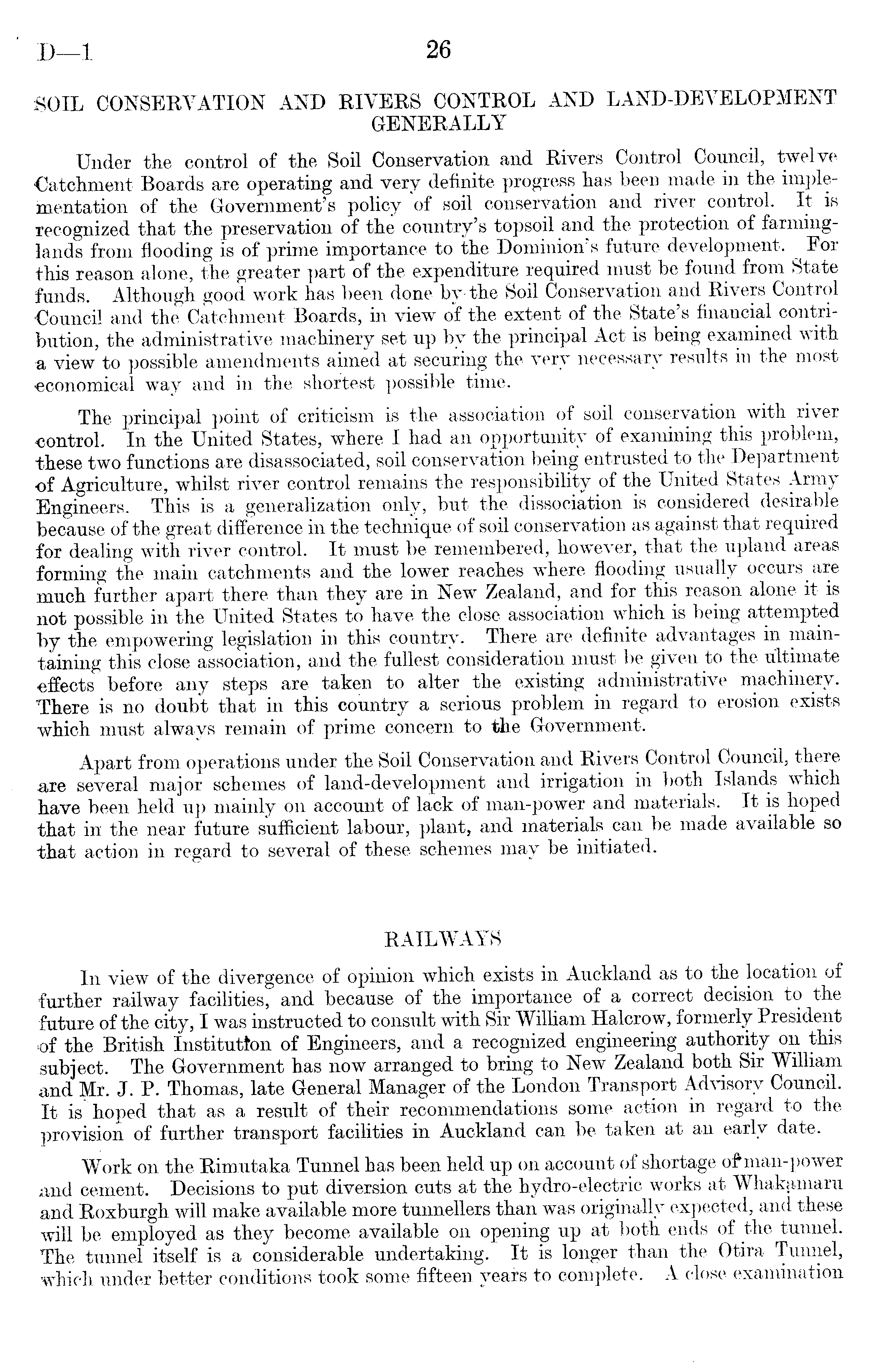 SOIL CONSERVATION AND RIVERS CONTROL AND LAND-DEVELOPMENT GENERALLY Under the control of the Soil Conservation and Rivers Control Council, twelve ■Catchment Boards are operating and very definite progress has been made in the implementation of the Government's policy of soil conservation and river control. It is recognized that the preservation of the country's topsoil and the protection of farminglands from flooding is of prime importance to the Dominion's future development. For this reason alone, the greater part of the expenditure required must be found from State funds. Although good work has been done by-the Soil Conservation and Rivers Control Council and the Catchment Boards, in view of the extent of the State s financial contribution, the administrative machinery set up by the principal Act is being examined with a, view to possible amendments aimed at securing the very necessary results in the most •economical way and in the shortest possible time. The principal point of criticism is the association of soil conservation with river control. In the United States, where I had an opportunity of examining this problem, these two functions are disassociated, soil conservation being entrusted to the Department of Agriculture, whilst river control remains the responsibility of the United States Army Engineers. This is a generalization only, but the dissociation is considered desirable because of the great difference in the technique of soil conservation as against that required for dealing with river control. It must be remembered, however, that the upland areas forming the main catchments and the lower reaches where flooding usually occurs are much further apart there than they are in New Zealand, and for this reason alone it is not possible in the United States to have the close association which is being attempted by the empowering legislation in this country. There are definite advantages in maintaining this close association, and the fullest consideration must be given to the ultimate effects before any steps are taken to alter the existing administrative machinery. There is no doubt that in this country a serious problem in regard to erosion exists which must always remain of prime concern to the Government. Apart from operations under the Soil Conservation and Rivers Control Council, there are several major schemes of land-development and irrigation in both Islands which have been held up mainly on account of lack of man-power and materials. It is hoped that in the near future sufficient labour, plant, and materials can be made available so that action in regard to several of these schemes may be initiated. RAILWAYS In view of the divergence of opinion which exists in Auckland as to the location of further railway facilities, and because of the importance of a correct decision to the future of the city, I was instructed to consult with Sir William Halcrow, formerly President of the British Institution of Engineers, and a recognized engineering authority on this subject. The Government has now arranged to bring to New Zealand both Sir William and Mr. J. P. Thomas, late General Manager of the London Transport Advisory Council. It is hoped that as a result of their recommendations some action in regard to the provision of further transport facilities in Auckland can be taken at an early date. Work on the Rimutaka Tunnel has been held up on account of shortage of man-power and cement. Decisions to put diversion cuts at the hydro-electric works at Whakamaru and Roxburgh will make available more tunnellers than was originally expected, and these will be employed as they become available on opening up at both ends of the tunnel. The tunnel itself is a considerable undertaking. It is longer than the Otira Tunnel, which under better conditions took some fifteen years to complete. A close examination