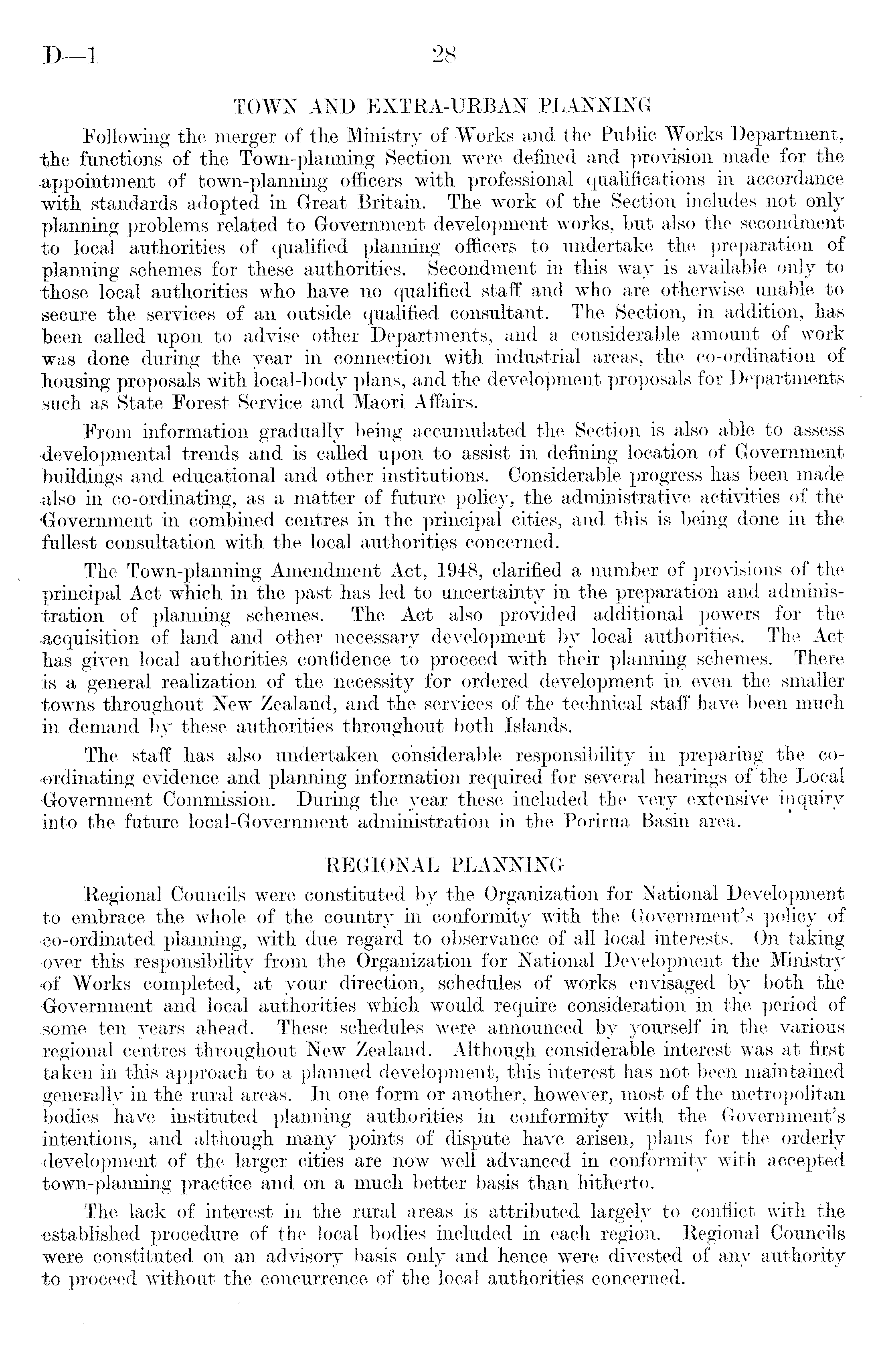 TOWN AND EXTRA-URBAN PLANNING Following the merger of the Ministry of Works and the Public Works Department, the functions of the Town-planning Section were defined and provision made for the appointment of town-planning officers with professional qualifications in accordance with standards adopted in Great Britain. The work of the Section includes not only planning problems related to Government development works, but also the secondment to local authorities of qualified planning officers to undertake the preparation of planning schemes for these authorities. Secondment in this way is available only to those local authorities who have no qualified staff and who are otherwise unable to secure the services of an outside qualified consultant. The Section, in addition, has been called upon to advise other Departments, and a considerable amount of work was done during the year in connection with industrial areas, the co-ordination of housing proposals with local-body plans, and the development proposals for Departments such as State Forest Service and Maori Affairs. From information gradually being accumulated the Section is also able to assess •developmental trends and is called upon to assist in defining location of Government buildings and educational and other institutions. Considerable progress has been made also in co-ordinating, as a matter of future policy, the administrative activities of the •Government in combined centres in the principal cities, and this is being done in the fullest consultation with the local authorities concerned. The Town-planning Amendment Act, 1948, clarified a number of provisions of the principal Act which in the past has led to uncertainty in the preparation and administration of planning schemes. The Act also provided additional powers for the acquisition of land and other necessary development by local authorities. The Act has given local authorities confidence to proceed with their planning schemes. There is a general realization of the necessity for ordered development in even the smaller towns throughout New Zealand, and the services of the technical staff have been much in demand by these authorities throughout both Islands. The staff has also undertaken considerable responsibility in preparing the coordinating evidence and planning information required for several hearings of the Local ■Government Commission. During the year these included the very extensive inquiry into the future local-Government administration in the Porirua Basin area. REGIONAL PLANNING Regional Councils were constituted by the Organization for National Development to embrace the whole of the country in conformity with the Government's policy of <;o-ordinated planning, with due regard to observance of all local interests. On taking •over this responsibility from the Organization for National Development the Ministry •of Works completed, at your direction, schedules of works envisaged by both the Government and local authorities which would require consideration in the period of :some ten years ahead. These schedules were announced by yourself in the various regional centres throughout New Zealand. Although considerable interest was at first taken in this approach to a planned development, this interest has not been maintained generally in the rural areas. In one form or another, however, most of the metropolitan bodies have instituted planning authorities in conformity with the Government's intentions, and although many points of dispute have arisen, plans for the orderly •development of the larger cities are now well advanced in conformity with accepted town-planning practice and on a much better basis than hitherto. The lack of interest in the rural areas is attributed largely to conflict with the •established procedure of the local bodies included in each region. Regional Councils were constituted on an advisory basis only and hence were divested of any authority to proceed without the concurrence of the local authorities concerned.