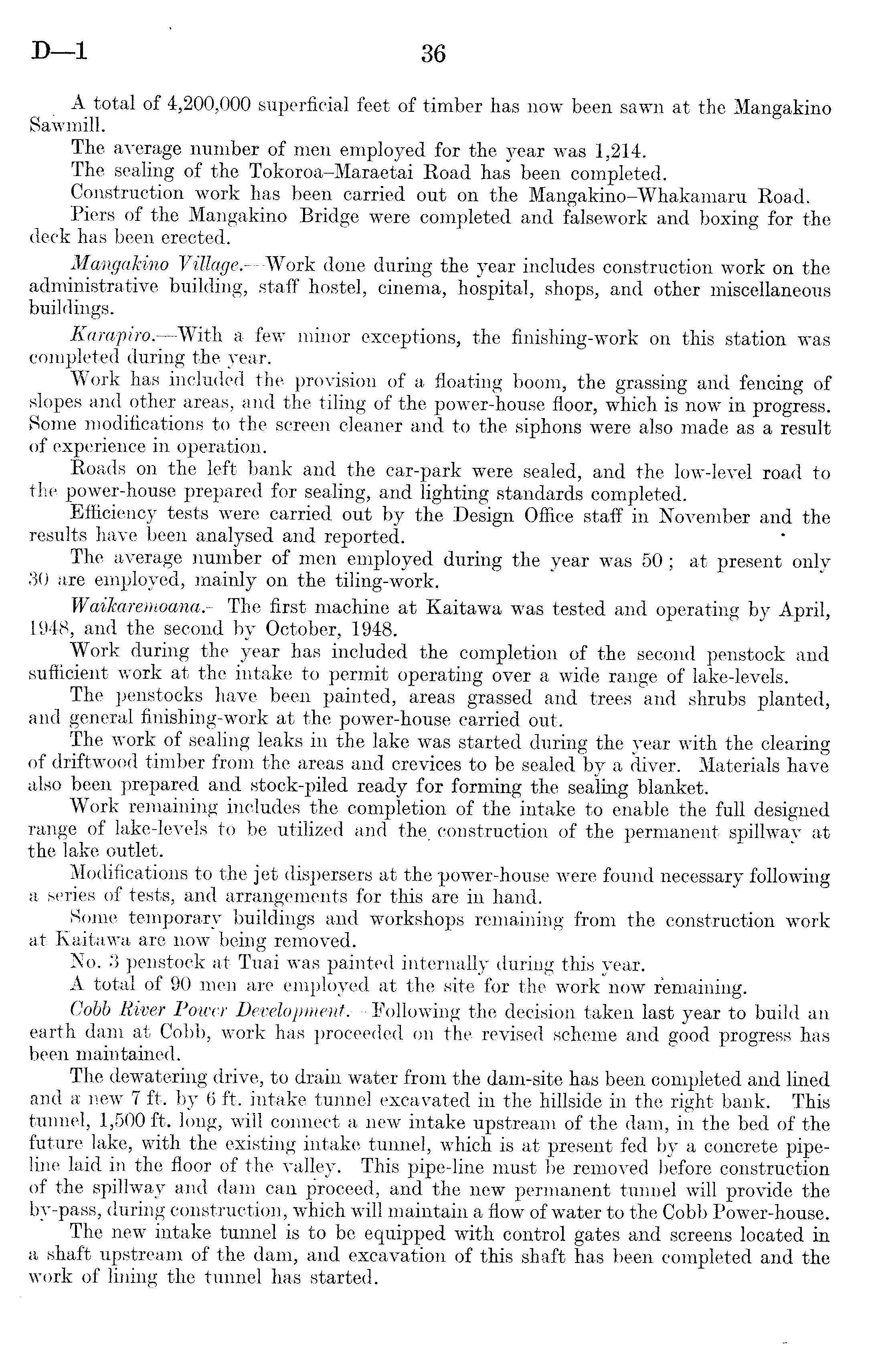 A total of 4,200,000 superficial feet of timber has now been sawn at the Mangakino Sawmill. The average number of men employed for the year was 1,214. The sealing of the Tokoroa-Maraetai Road has been completed. Construction work has been carried out on the Mangakino-Whakamaru Road. Piers of the Mangakino Bridge were completed and falsework and boxing for the deck has been erected. Mangakino Village. —Work done during the year includes construction work on the administrative building, staff hostel, cinema, hospital, shops, and other miscellaneous buildings. Karapiro.—With a few minor exceptions, the finishing-work on this station was completed during the year. Work has included the provision of a floating boom, the grassing and fencing of slopes and other areas, and the tiling of the power-house floor, which is now in progress. Some modifications to the screen cleaner and to the siphons were also made as a result of experience in operation. Roads on the left bank and the car-park were sealed, and the low-level road to the power-house prepared for sealing, and lighting standards completed. Efficiency tests were carried out by the Design Office staff in November and the results have been analysed and reported. The average number of men employed during the year was 50; at present only 30 are employed, mainly on the tiling-work. Waikaremoana. —The first machine at Kaitawa was tested and operating by April, 1948, and the second by October, 1948. Work during the year has included the completion of the second penstock and sufficient work at the intake to permit operating over a wide range of lake-levels. The penstocks have been painted, areas grassed and trees and shrubs planted, and general finishing-work at the power-house carried out. The work of sealing leaks in the lake was started during the year with the clearing of driftwood timber from the areas and crevices to be sealed by a diver. Materials* have also been prepared and stock-piled ready for forming the sealing blanket. Work remaining includes the completion of the intake to enable the full designed range of lake-levels to be utilized and the construction of the permanent spillway at the lake outlet. Modifications to the jet dispersers at the power-house were found necessary following a series of tests, and arrangements for this are in hand. Some temporary buildings and workshops remaining from the construction work at Kaitawa are now being removed. No. 3 penstock at Tuai was painted internally during this year. A total of 90 men are employed at the site for the work now remaining. Cobb River Power Development.—Following the decision taken last year to build an earth dam at Cobb, work has proceeded on the revised scheme and good progress has been maintained. The dewatering drive, to drain water from the dam-site has been completed and lined and a* new 7 ft. by 6 ft. intake tunnel excavated in the hillside in the right bank. This tunnel, 1,500 ft. long, will connect a new intake upstream of the dam, in the bed of the future lake, with the existing intake tunnel, which is at present fed by a concrete pipeline laid in the floor of the valley. This pipe-line must be removed before construction of the spillway and dam can proceed, and the new permanent tunnel will provide the by-pass, during construction, which will maintain a flow of water to the Cobb Power-house. The new intake tunnel is to be equipped with control gates and screens located in a shaft upstream of the dam, and excavation of this shaft has been completed and the work of lining the tunnel has started.