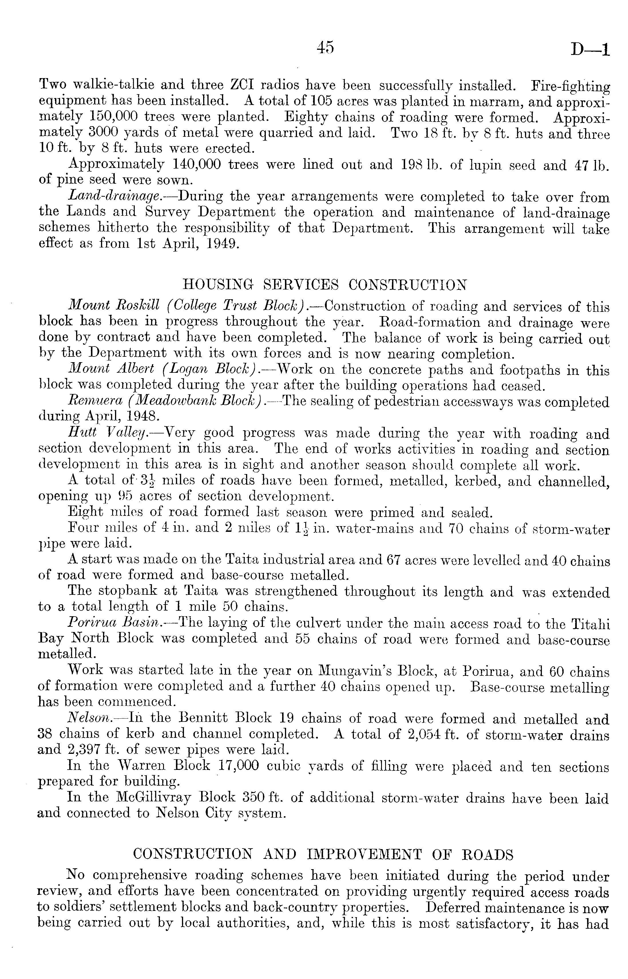Two walkie-talkie and three ZCI radios have been successfully installed. Fire-fighting equipment has been installed. A total of 105 acres was planted in marram, and approximately 150,000 trees were planted. Eighty chains of roading were formed. Approximately 3000 yards of metal were quarried and laid. Two 18 ft. by 8 ft. huts and three 10 ft. by 8 ft. huts were erected. Approximately 140,000 trees were lined out and 198 lb. of lupin seed and 47 lb. of pine seed were sown. Land-drainage.—During the year arrangements were completed to take over from the Lands and Survey Department the operation and maintenance of land-drainage schemes hitherto the responsibility of that Department. This arrangement will take effect as from Ist April, 1949. HOUSING SERVICES CONSTRUCTION Mount Roskill (College Trust Block). —Construction of roading and services of this block has been in progress throughout the year. Road-formation and drainage were done by contract and have been completed. The balance of work is being carried out by the Department with its own forces and is now nearing completion. Mount Albert (Logan Block).—Work on the concrete paths and footpaths in this block was completed during the year after the building operations had ceased. Remuera (Meadowbank Block). —The sealing of pedestrian accessways was completed during April, 1948. Hutt Valley.—Very good progress was made during the year with roading and section development in this area. The end of works activities in roading and section development in this area is in sight and another season should complete all work. A total of- 3% miles of roads have been formed, metalled, kerbed, and channelled, opening up 95 acres of section development. Eight miles of road formed last season were primed and sealed. Four miles of 4 in. and 2 miles of 1| in. water-mains and 70 chains of storm-water pipe were laid. A start was made on the Taita industrial area and 67 acres were levelled and 40 chains of road were formed and base-course metalled. The stopbank at Taita was strengthened throughout its length and was extended to a total length of 1 mile 50 chains.. Torirua Basin.—The laying of the culvert under the main access road to the Titahi Bay North Block was completed and 55 chains of road were formed and base-course metalled. Work was started late in the year on Mungavin's Block, at Porirua, and 60 chains of formation were completed and a further 40 chains opened up. Base-course metalling has been commenced. Nelson. —In the Bennitt Block 19 chains of road were formed and metalled and 38 chains of kerb and channel completed. A total of 2,054 ft. of storm-water drainsand 2,397 ft. of sewer pipes were laid. In the Warren Block 17,000 cubic yards of filling were placed and ten sections prepared for building. In the McGrillivray Block 350 ft. of additional storm-water drains have been laid and connected to Nelson City system. CONSTRUCTION AND IMPROVEMENT OF ROADS No comprehensive roading schemes have been initiated during the period under review, and efforts have been concentrated on providing urgently required access roads to soldiers' settlement blocks and back-country properties. Deferred maintenance is now being carried out by local authorities, and, while this is most satisfactory, it has had