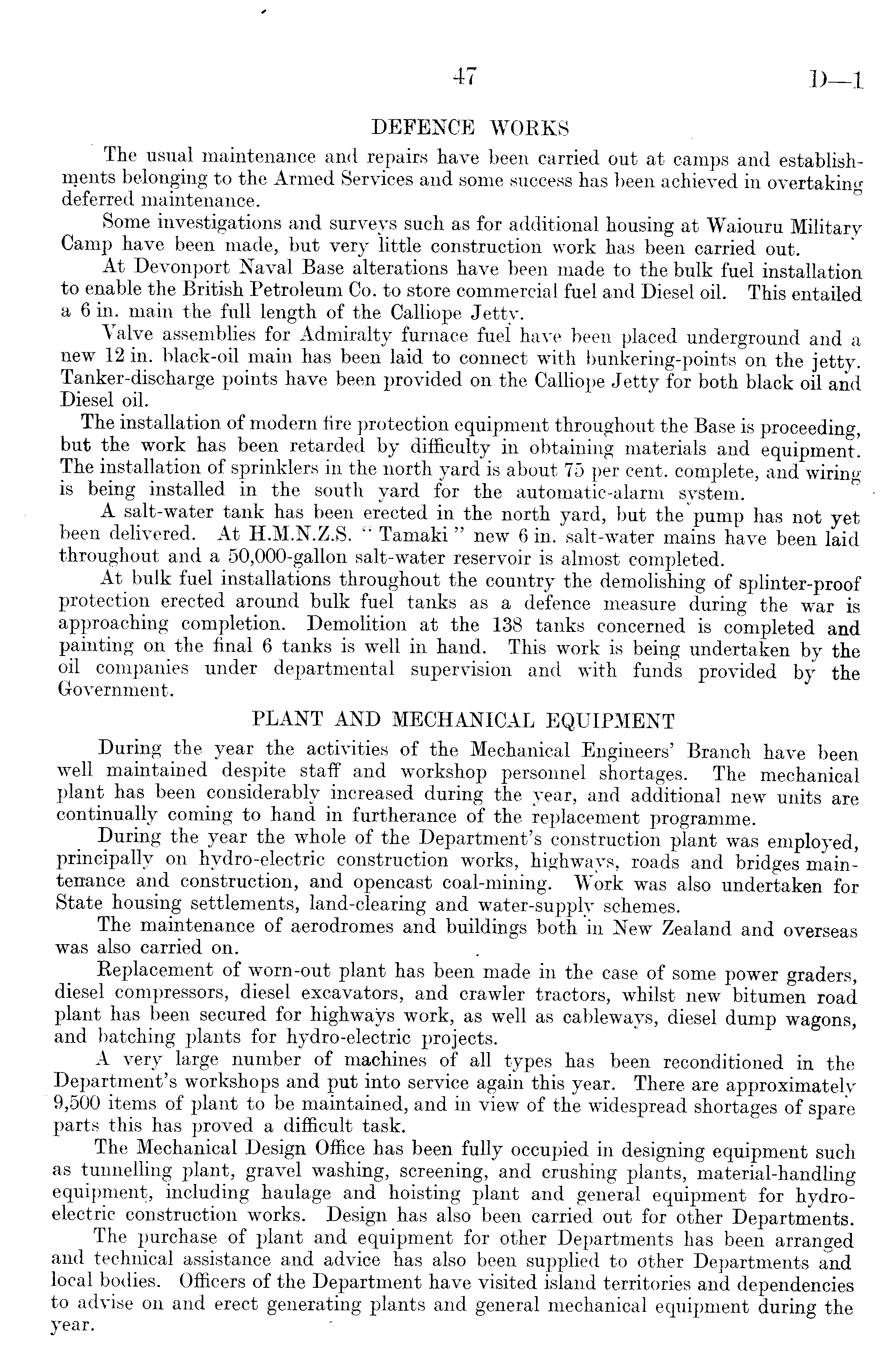 DEFENCE WORKS The usual maintenance and repairs have been carried out at camps and establishments belonging to the Armed Services and some success has been achieved in overtaking deferred maintenance. Some investigations and surveys such as for additional housing at Waiouru Military Camp have been made, but very little construction work has been carried out. At Devonport Naval Base alterations have been made to the bulk fuel installation to enable the British Petroleum Co. to store commercial fuel and Diesel oil. This entailed a 6 in. main the full length of the Calliope Jetty. Valve assemblies for Admiralty furnace fuel have been placed underground and a new 12 in. black-oil main has been laid to connect with bunkering-points on the jetty. Tanker-discharge points have been provided on the Calliope Jetty for both black oil and Diesel oil. The installation of modern fire protection equipment throughout the Base is proceeding, but the work has been retarded by difficulty in obtaining materials and equipment. The installation of sprinklers in the north yard is about 75 per cent, complete, and wiring is being installed in the south yard for the automatic-alarm system. A salt-water tank has been erected in the north yard, but the "pump has not yet been delivered. At H.M.N.Z.S. " Tamaki" new 6 in. salt-water mains have been laid throughout and a 50,000-gallon salt-water reservoir is almost completed. At bulk fuel installations throughout the country the demolishing of splinter-proof protection erected around bulk fuel tanks as a defence measure during the war is approaching completion. Demolition at the 138 tanks concerned is completed and painting on the final 6 tanks is well in hand. This work is being undertaken by the oil companies under departmental supervision and with funds provided by the Government. PLANT AND MECHANICAL EQUIPMENT During the year the activities of the Mechanical Engineers' Branch have been well maintained despite staff and workshop personnel shortages. The mechanical plant has been considerably increased during the year, and additional new units are continually coming to hand in furtherance of the replacement programme. During the year the whole of the Department's construction plant was employed, principally on hydro-electric construction works, highways, roads and bridges maintenance and construction, and opencast coal-mining. Work was also undertaken for State housing settlements, land-clearing and water-supply schemes. The maintenance of aerodromes and buildings both in New Zealand and overseas was also carried on. Replacement of worn-out plant has been made in the case of some power graders, diesel compressors, diesel excavators, and crawler tractors, whilst new bitumen road plant has been secured for highways work, as well as cableways, diesel dump wagons, and batching plants for hydro-electric projects. A very large number of machines of all types has been reconditioned in the Department's workshops and put into service again this year. There are approximately 1 9,500 items of plant to be maintained, and in view of the widespread shortages of spare parts this has proved a difficult task. The Mechanical Design Office has been fully occupied in designing equipment such as tunnelling plant, gravel washing, screening, and crushing plants, material-handling equipment, including haulage and hoisting plant and general equipment for hydroelectric construction works. Design has also been carried out for other Departments. The purchase of plant and equipment for other Departments has been arranged and technical assistance and advice has also been supplied to other Departments and local bodies. Officers of the Department have visited island territories and dependencies to advise on and erect generating plants and general mechanical equipment during the year.