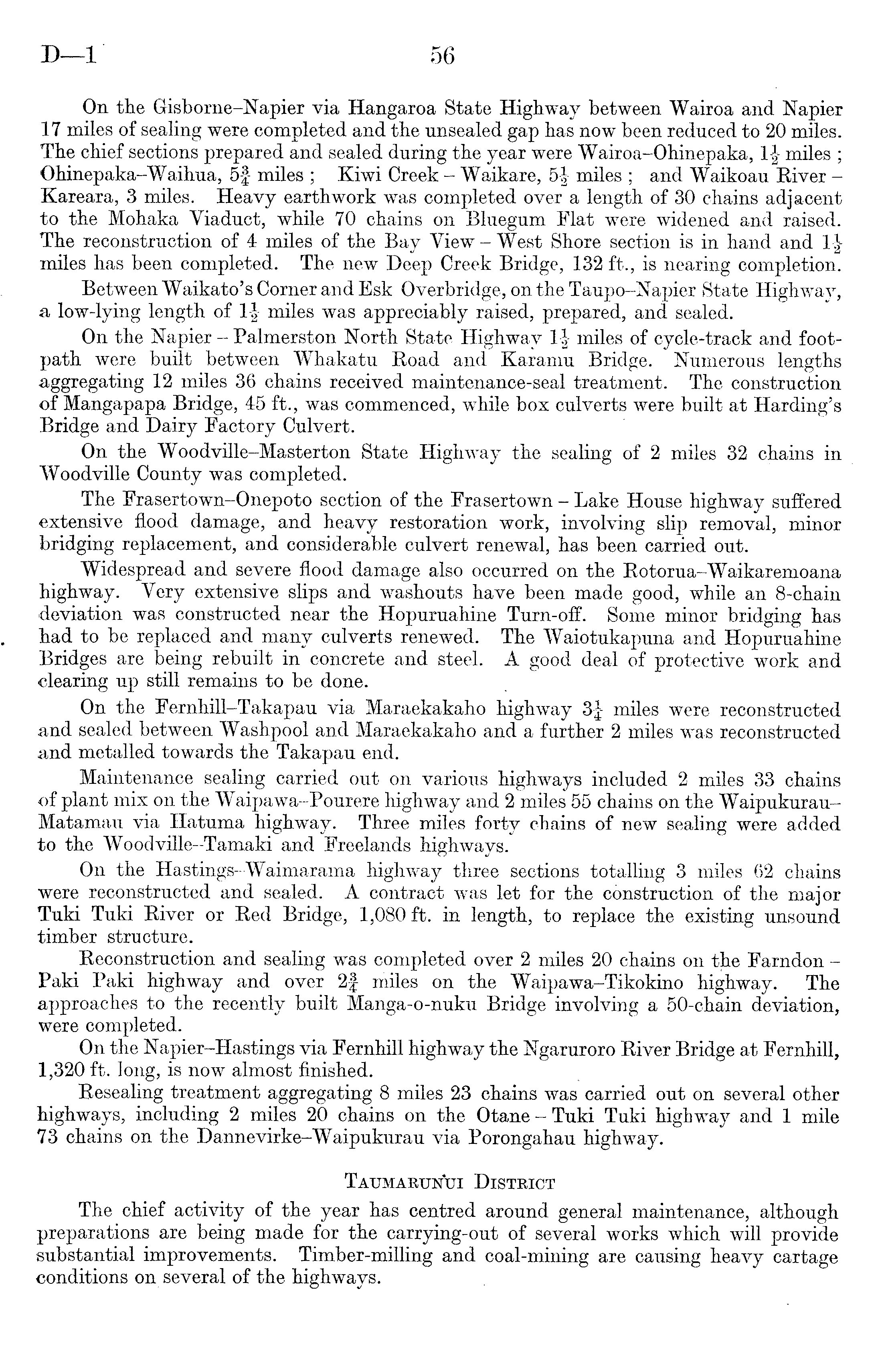 On the Gisborne-Napier via Hangaroa State Highway between Wairoa and Napier 17 miles of sealing were completed and the unsealed gap has now been reduced to 20 miles. The chief sections prepared and sealed during the year were Wairoa-Ohinepaka, 1| miles ; Ohinepaka-Waihua, 5f miles ; Kiwi Creek - Waikare, 5| miles ; and Waikoau River - Kareara, 3 miles. Heavy earthwork was completed over a length of 30 chains adjacent to the Mohaka Viaduct, while 70 chains on Bluegum Flat were widened and raised. The reconstruction of 4 miles of the Bay View - West Shore section is in hand and I|miles has been completed. The new Deep Creek Bridge, 132 ft., is nearing completion. Between Waikato's Corner and Esk Overbridge, on the Taupo-Napier State Highway, a low-lying length of miles was appreciably raised, prepared, and sealed. On the Napier - Palmerston North State Highway 1| miles of cycle-track and footpath were built between Whakatu Road and Karamu Bridge. Numerous lengths aggregating 12 miles 36 chains received maintenance-seal treatment. The construction of Mangapapa Bridge, 45 ft., was commenced, while box culverts were built at Harding's Bridge and Dairy Factory Culvert. On the Woodville-Masterton State Highway the sealing of 2 miles 32 chains in Woodville County was completed. The Frasertown-Onepoto section of the Frasertown - Lake House highway suffered extensive flood damage, and heavy restoration work, involving slip removal, minor bridging replacement, and considerable culvert renewal, has been carried out. Widespread and severe flood damage also occurred on the Rotorua-Waikaremoana highway. Very extensive slips and washouts have been made good, while an 8-chain deviation was constructed near the Hopuruahine Turn-off. Some minor bridging has had to be replaced and many culverts renewed. The Waiotukapuna and Hopuruahine Bridges are being rebuilt in concrete and steel. A good deal of protective work and clearing up still remains to be done. On the Fernhill-Takapau via Maraekakaho highway 3f miles were reconstructed and sealed between Washpool and Maraekakaho and a further 2 miles was reconstructed and metalled towards the Takapau end. Maintenance sealing carried out on various highways included 2 miles 33 chains of plant mix on the Waipawa-Pourere highway and 2 miles 55 chains on the WaipukurauMatamau via Hatuma highway. Three miles forty chains of new sealing were added to the Woodville-Tamaki and Freelands highways. On the Hastings-Waimarama highway three sections totalling 3 miles 62 chains were reconstructed and sealed. A contract was let for the construction of the major Tuki Tuki River or Red Bridge, 1,080 ft. in length, to replace the existing unsound timber structure. Reconstruction and sealing was completed over 2 miles 20 chains on the Farndon - Paki Paki highway and over 2f miles on the Waipawa-Tikokino highway. The approaches to the recently built Manga-o-nuku Bridge involving a 50-chain deviation, were completed. On the Napier-Hastings via Fernhill highway the Ngaruroro River Bridge at Fernhill, 1,320 ft. long, is now almost finished. Resealing treatment aggregating 8 miles 23 chains was carried out on several other highways, including 2 miles 20 chains on the Otane - Tuki Tuki highway and 1 mile 73 chains on the Dannevirke-Waipukurau via Porongahau highway. Taumarunui District The chief activity of the year has centred around general maintenance, although preparations are being made for the carrying-out of several works which will provide substantial improvements. Timber-milling and coal-mining are causing heavy cartage conditions on several of the highways.