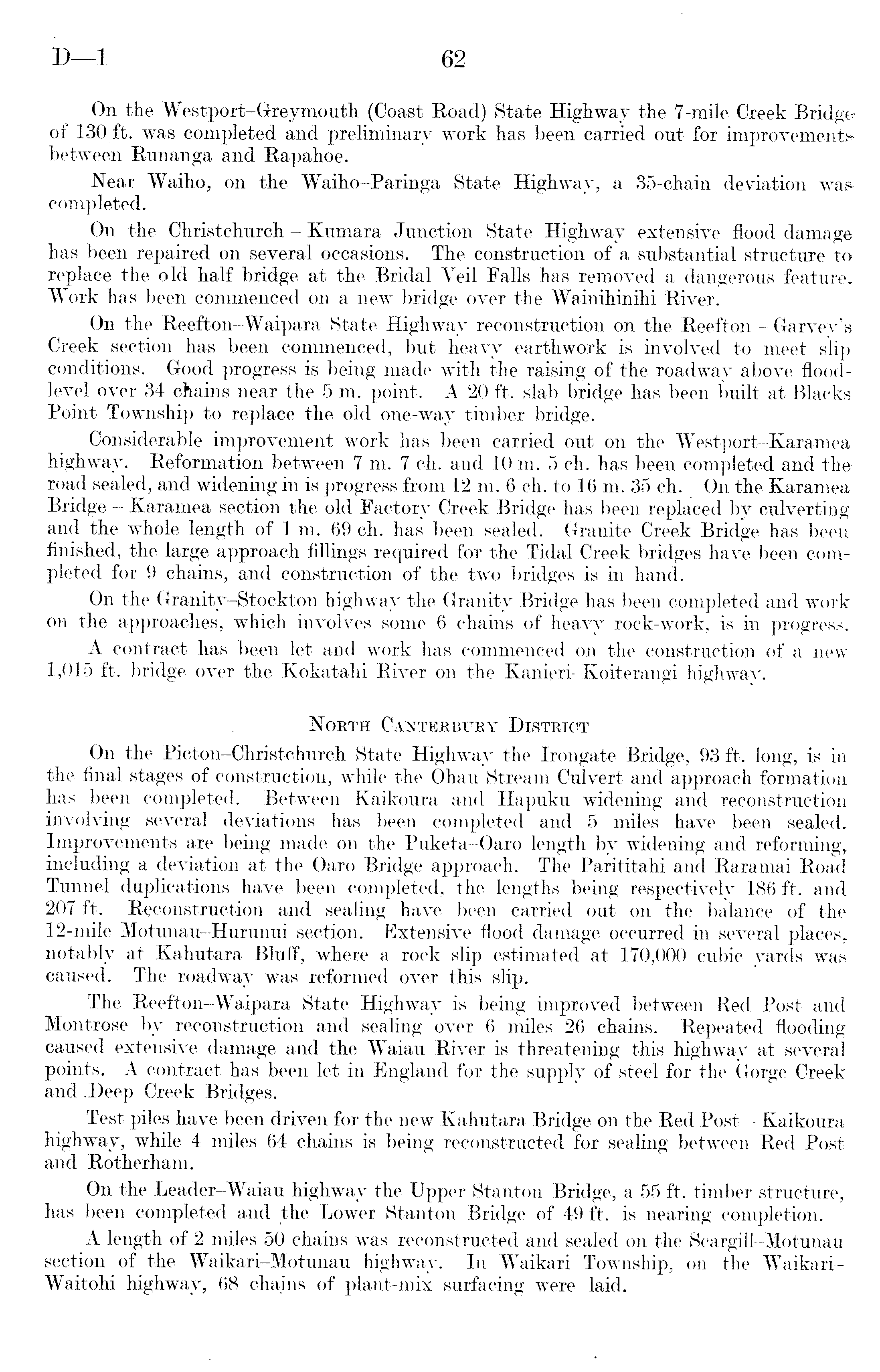 On the Westport-Greymouth (Coast Road) State Highway the 7-mile Creek Bridge of 130, ft. was completed and preliminary work has been carried out for improvements, between Runanga and Rapahoe. Near Waiho, on the Waiho-Paringa State Highway, a 35-chain deviation was • completed. On the Christchurch - Krnnara Junction State Highway extensive flood damage has bedn repaired on several occasions. The construction of a substantial structure to replace the old half bridge at the Bridal Veil Falls has removed a dangerous feature. Work has been commenced on a new bridge over the Wainihinihi River. On the Reefton-Waipara State Highway reconstruction on the Reefton - Garvev's Creek section has been commenced, but heavy earthwork is involved to meet slip conditions. Good progress is being made with the raising of the roadway above floodlevel over 34 chains near the sm. point. A2O ft. slab bridge has been built at Blacks Point Township to replace the old one-way timber bridge. Considerable improvement work has been carried out on the Westport-Karamea highway. Reformation between 7m. 7 ch. and 10 m. 5 ch. has been completed and the road sealed, and widening in is progress from 12 m. 6 ch. to 16 m. 35 ch. On the Karamea Bridge - Karamea section the old Factory Creek Bridge has been replaced by culverting and the whole length of Im. 69 ch. has been sealed. Granite Creek Bridge has been finished, the large approach fillings required for the Tidal Creek bridges have been completed for 9 chains, and construction of the two bridges is in hand. On the Granity-Stockton highway the Granity Bridge has been completed and work on the approaches, which involves some 6 chains of heavy rock-work, is in progress. A contract has been let and work has commenced on the construction of a new 1,015 ft. bridge over the Kokatahi River on the Kanieri-Koiterangi highway. North Canterbury District On the Picton-Christchurch State Highway the Irongate Bridge, 93 ft. long, is in the final stages of construction, while the Ohau Stream Culvert and approach formation has been completed. Between Kaikoura and Hapuku widening and reconstruction involving several deviations has been completed and 5 miles have been sealed. Improvements are being made on the Puketa-Oaro length by widening and reforming, including a deviation at the Oaro Bridge approach. The Parititahi and Raramai Road Tunnel duplications have been completed, the lengths being respectively 186 ft. and 207 ft. Reconstruction and sealing have been carried out on the balance of the 12-mile Motunau-Hurunui section. Extensive flood damage occurred in several places, notably at Kahutara Bluff, where a rock slip estimated at 170,000 cubic yards was caused. The roadway was reformed over this slip. The Reefton-Waipara State Highway is being improved between Red Post and Montrose by reconstruction and sealing over 6 miles 26 chains. Repeated flooding caused extensive damage and the Waiau River is threatening this highway at several points. A contract has been let in England for the supply of steel for the Gorge Creek and J)eep Creek Bridges. Test piles have been driven for the new Kahutara Bridge on the Red Post - Kaikoura highway, while 4 miles 64 chains is being reconstructed for sealing between Red Post and Rotherham. On the Leader-Waiau highway the Upper Stanton Bridge, a 55 ft. timber structure,, has been completed and the Lower Stanton Bridge of 49 ft. is nearing completion. A length of 2 miles 50 chains was reconstructed and sealed on the Scargill-Motunau section of the Waikari-Motunau highway. In Waikari Township, on the WaikariWaitohi highway, 68 chains of plant-mix surfacing were laid.