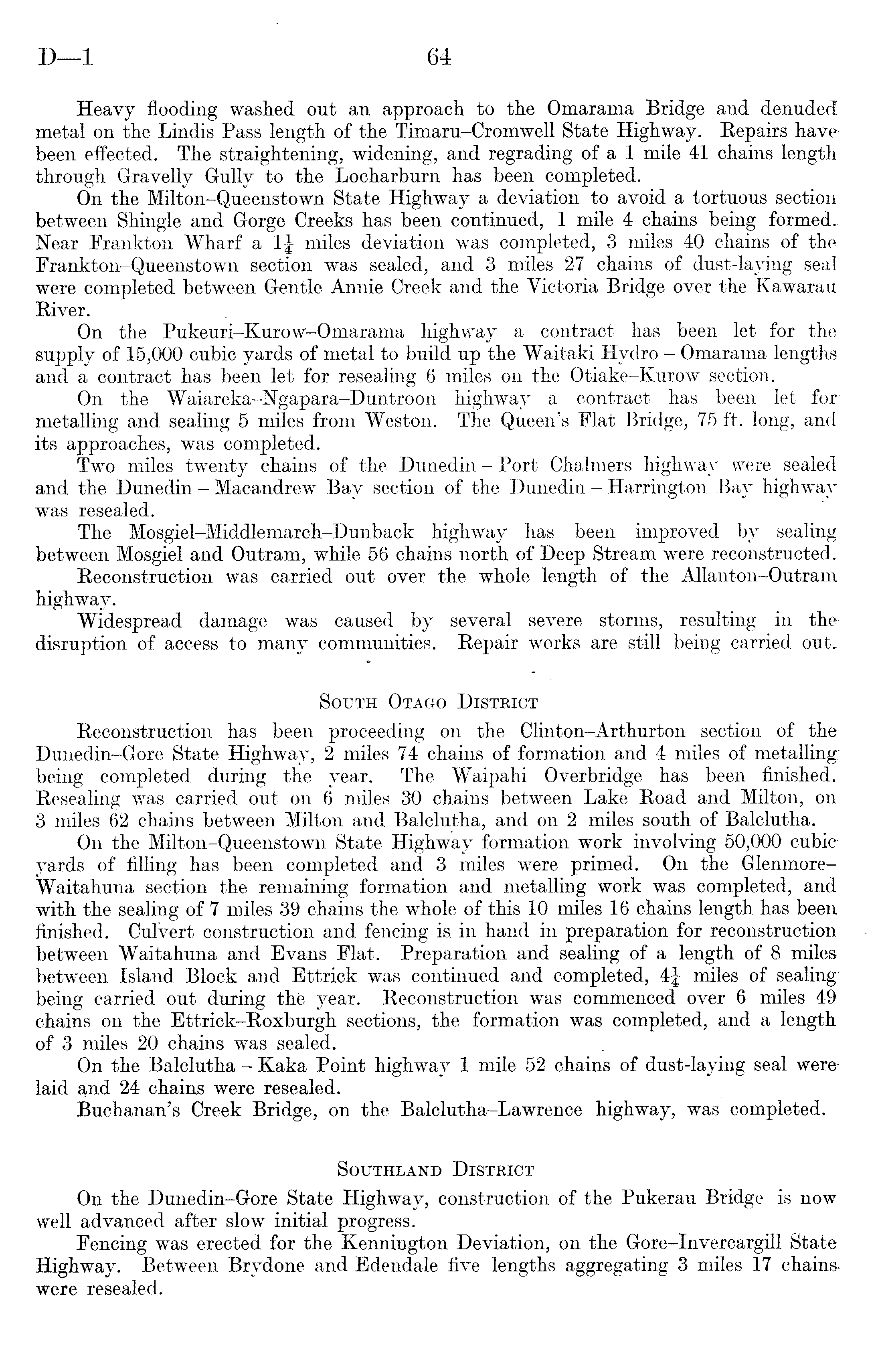 Heavy flooding washed out an approach to the Omarama Bridge and denuded metal on the Lindis Pass length of the Timaru-Cromwell State Highway. Repairs have been effected. The straightening, widening, and regrading of a 1 mile 41 chains length through Gravelly Gully to the Locharburn has been completed. On the Milton-Queenstown State Highway a deviation to avoid a tortuous section between Shingle and Gorge Creeks has been continued, 1 mile 4 chains being formed.. Near Frankton Wharf a 1J miles deviation was completed, 3 miles 40 chains of the Frankton-Queenstown section was sealed, and 3 miles 27 chains of dust-laying seal were completed between Gentle Annie Creek and the Victoria Bridge over the Kawarau Rivey. On the Pukeuri-Kurow-Omarama highway a contract has been let for the supply of 15,000 cubic yards of metal to build up the Waitaki Hydro - Omarama lengths and a contract has been let for resealing 6 miles on the Otiake-Kurow section. On the Waiareka-Ngapara-Duntroon highway a contract has been let for metalling and sealing 5 miles from Weston. The Queen's Flat Bridge, 75 ft. long, and its approaches, was completed. Two miles twenty chains of the Dunedin - Port Chalmers highway were sealed and the Dunedin - Macandrew Bay section of the Dunedin - Harrington Bay highway was resealed. The Mosgiel-Middlemarch-Dunback highway has been improved by sealing between Mosgiel and Outram, while 56 chains north of Deep Stream were reconstructed. Reconstruction was carried out over the whole length of the Allanton-Outram highway. Widespread damage was caused by several severe storms, resulting in the disruption of access to many communities. Repair works are still being carried out. South Otago District Reconstruction has been proceeding on the Clinton-Arthurton section of the Dunedin-Gore State Highway, 2 miles 74 chains of formation and 4 miles of metalling being completed during the year. The Waipahi Over bridge has been finished. Resealing was carried out on 6 miles 30 chains between Lake Road and Milton, on 3 miles 62 chains between Milton and Balclutha, and on 2 miles south of Balclutha. On the Milton-Queenstown State Highway formation work involving 50,000 cubic yards of filling has been completed and 3 miles were primed. On the GlenmoreWaitahuna section the remaining formation and metalling work was completed, and with the sealing of 7 miles 39 chains the whole of this 10 miles 16 chains length has been finished. Culvert construction and fencing is in hand in preparation for reconstruction between Waitahuna and Evans Flat. Preparation and sealing of a length of 8 miles between Island Block and Ettrick was continued and completed, 4£ miles of sealing being carried out during the year. Reconstruction was commenced over 6 miles 49 chains on the Ettrick-Roxburgh sections, the formation was completed, and a length of 3 miles 20 chains was sealed. On the Balclutha - Kaka Point highway 1 mile 52 chains of dust-laying seal were laid and 24 chains were resealed. Buchanan's Creek Bridge, on the Balclutha-Lawrence highway, was completed. Southland District On the Dunedin-Gore State Highway, construction of the Pukerau Bridge is now well advanced after slow initial progress. Fencing was erected for the Kennington Deviation, on the Gore-Invercargill State Highway. Between Brvdone and Edendale five lengths aggregating 3 miles 17 chainswere resealed.