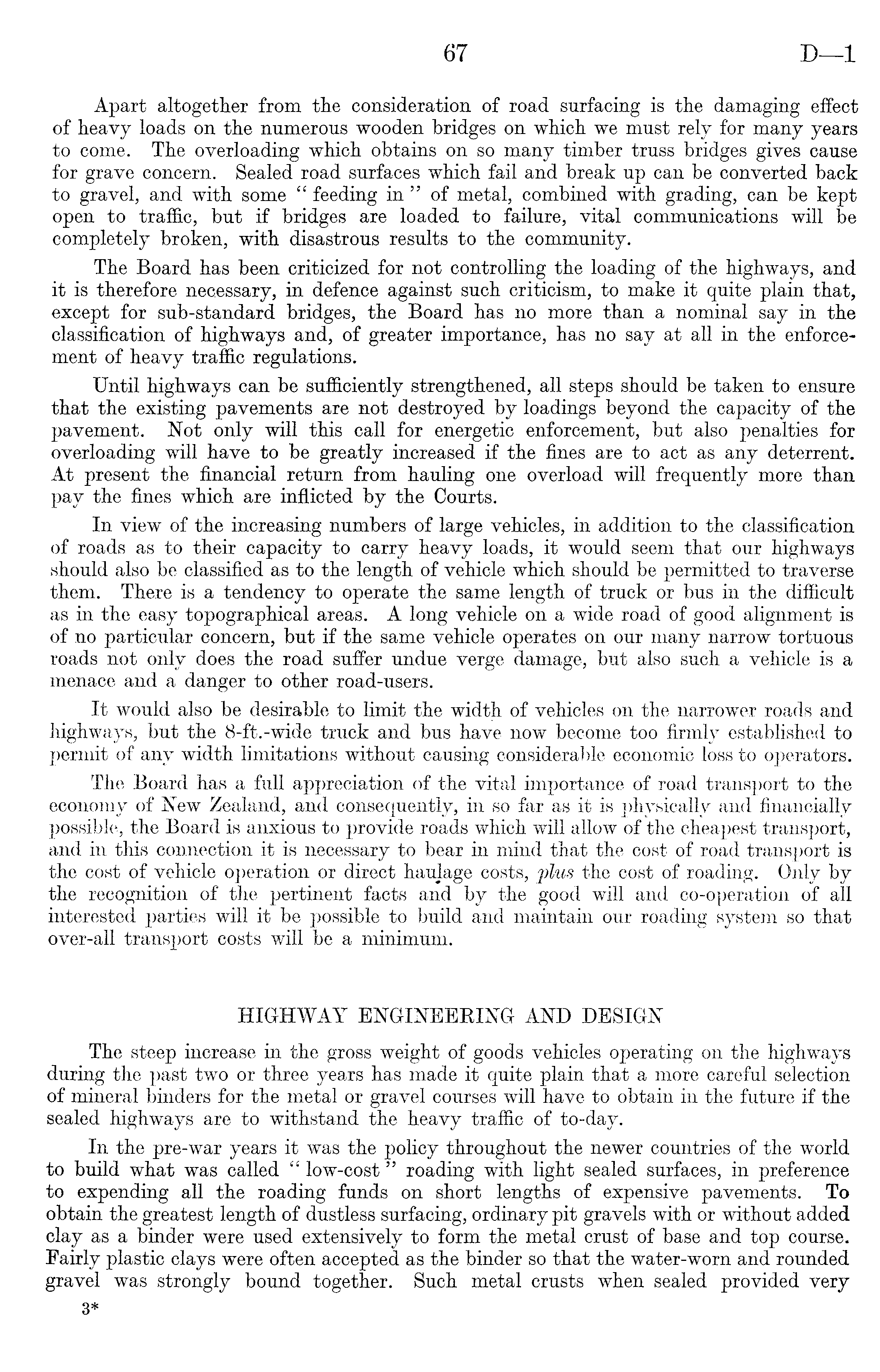Apart altogether from the consideration of road surfacing is the damaging effect of heavy loads on the numerous wooden bridges on which we must rely for many years to come. The overloading which obtains on so many timber truss bridges gives cause for grave concern. Sealed road surfaces which fail and break up can be converted back to gravel, and with some " feeding in "of metal, combined with grading, can be kept open to traffic, but if bridges are loaded to failure, vital communications will be completely broken, with disastrous results to the community. The Board has been criticized for not controlling the loading of the highways, and it is therefore necessary, in defence against such criticism, to make it quite plain that, except for sub-standard bridges, the Board has no more than a nominal say in the classification of highways and, of greater importance, has no say at all in the enforcement of heavy traffic regulations. Until highways can be sufficiently strengthened, all steps should be taken to ensure that the existing pavements are not destroyed by loadings beyond the capacity of the pavement. Not only will this call for energetic enforcement, but also penalties for overloading will have to be greatly increased if the fines are to act as any deterrent. At present the financial return from hauling one overload will frequently more than pay the fines which are inflicted by the Courts. In view of the increasing numbers of large vehicles, in addition to the classification of roads as to their capacity to carry heavy loads, it would seem that our highways should also be classified as to the length of vehicle which should be permitted to traverse them. There is a tendency to operate the same length of truck or bus in the difficult as in the easy topographical areas. A long vehicle on a wide road of good alignment is of no particular concern, but if the same vehicle operates on our many narrow tortuous roads not only does the road suffer undue verge damage, but also such a vehicle is a menace and a danger to other road-users. It would also be desirable to limit the width of vehicles on the narrower roads and highways, but the 8-ft.-wide truck and bus have now become too firmly established to permit of any width limitations without causing considerable economic loss to operators. The Board has a full appreciation of the vital importance of road transport to the economy of New Zealand, and consequently, in so far as it is physically and financially possible, the Board is anxious to provide roads which will allow of the cheapest transport, and in this connection it is necessary to bear in mind that the cost of road transport is the cost of vehicle operation or direct haulage costs, plus the cost of roading. Only by the recognition of the pertinent facts and by the good will and co-operation of all interested parties will it be possible to build and maintain our roading system so that over-all transport costs will be a minimum. HIGHWAY ENGINEERING AND DESIGN The steep increase in the gross weight of goods vehicles operating on the highways during the past two or three years has made it quite plain that a more careful selection of mineral binders for the metal or gravel courses will have to obtain in the future if the sealed highways are to withstand the heavy traffic of to-day. In the pre-war years it was the policy throughout the newer countries of the world to build what was called " low-cost" roading with light sealed surfaces, in preference to expending all the roading funds on short lengths of expensive pavements. To obtain the greatest length of dustless surfacing, ordinary pit gravels with or without added clay as a binder were used extensively to form the metal crust of base and top course. Fairly plastic clays were often accepted as the binder so that the water-worn and rounded gravel was strongly bound together. Such metal crusts when sealed provided very