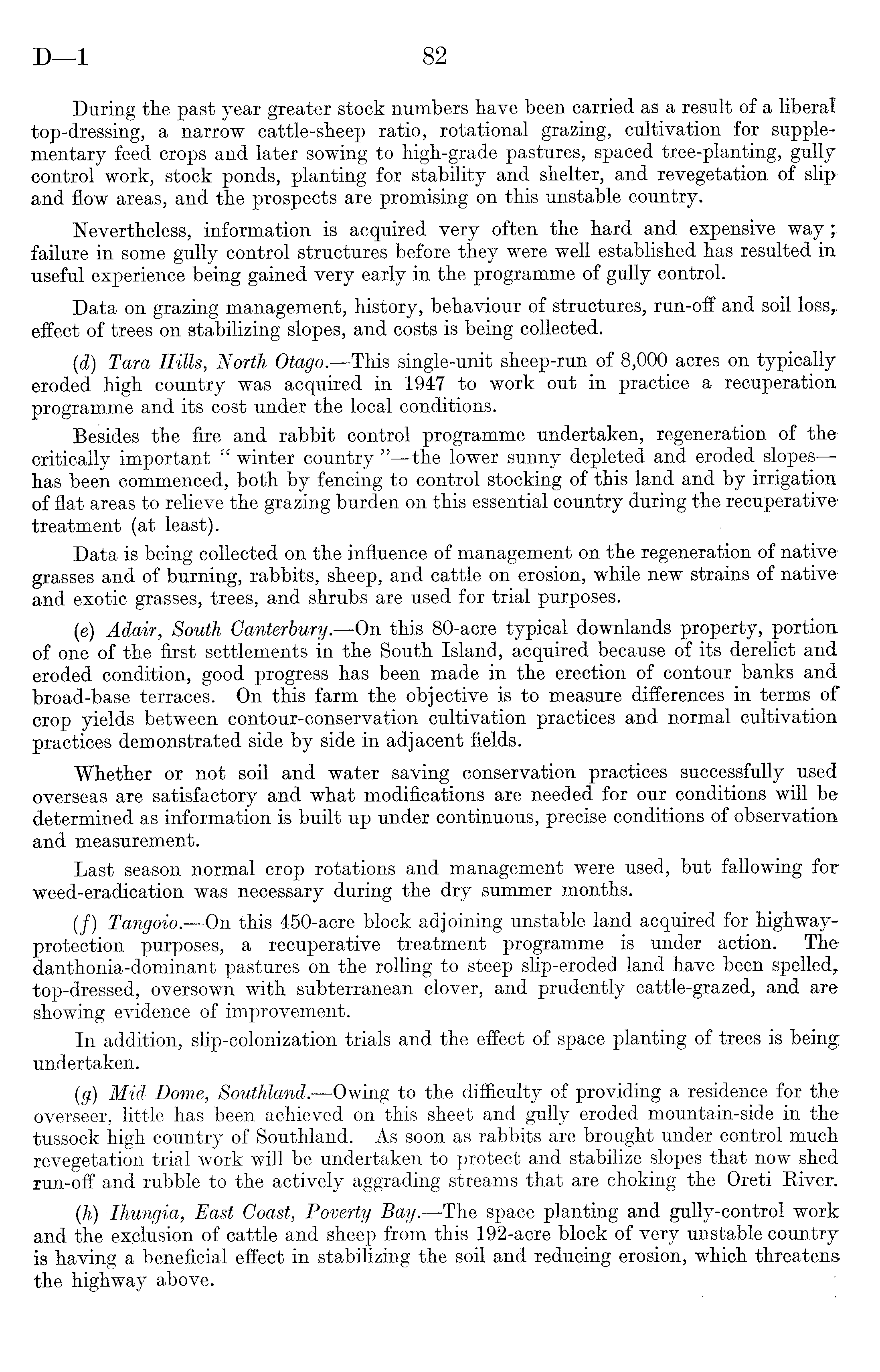 During the past year greater stock numbers have been carried as a result of a liberal top-dressing, a narrow cattle-sheep ratio, rotational grazing, cultivation for supplementary feed crops and later sowing to high-grade pastures, spaced tree-planting, gully control work, stock ponds, planting for stability and shelter, and revegetation of slip and flow areas, and the prospects are promising on this unstable country. Nevertheless, information is acquired very often the hard and expensive way ' r failure in some gully control structures before they were well established has resulted in useful experience being gained very early in the programme of gully control. Data on grazing management, history, behaviour of structures, run-off and soil loss r effect of trees on stabilizing slopes, and costs is being collected. (d) Tara Hills, North Otago.—This single-unit sheep-run of 8,000 acres on typically eroded high country was acquired in 1947 to work out in practice a recuperation programme and its cost under the local conditions. Besides the fire and rabbit control programme undertaken, regeneration of the critically important " winter country " —the lower sunny depleted and eroded slopes—has been commenced, both by fencing to control stocking of this land and by irrigation of flat areas to relieve the grazing burden on essential country during the recuperative treatment (at least). Data is being collected on the influence of management on the regeneration of native grasses and of burning, rabbits, sheep, and cattle on erosion, while new strains of native and exotic grasses, trees, and shrubs are used for trial purposes. (e) Adair, South Canterbury.—On this 80-acre typical downlands property, portion of one of the first settlements in the South Island, acquired because of its derelict and eroded condition, good progress has been made in the erection of contour banks and broad-base terraces. On this farm the objective is to measure differences in terms of crop yields between contour-conservation cultivation practices and normal cultivation practices demonstrated side by side in adjacent fields. Whether or not soil and water saving conservation practices successfully used overseas are satisfactory and what modifications are needed for our conditions will be determined as information is built up under continuous, precise conditions of observation and measurement. Last season normal crop rotations and management were used, but fallowing for weed-eradication was necessary during the dry summer months. (/) Tangoio.—On this 450-acre block adjoining unstable land acquired for highwayprotection purposes, a recuperative treatment programme is under action. The danthonia-dominant pastures on the rolling to steep slip-eroded land have been spelled, top-dressed, oversown with subterranean clover, and prudently cattle-grazed, and are showing evidence of improvement. In addition, slip-colonization trials and the effect of space planting of trees is being undertaken. (g) Mid Dome, Southland. —Owing to the difficulty of providing a residence for the overseer, little has been achieved on this sheet and gully eroded mountain-side in the tussock high country of Southland. As soon as rabbits are brought under control much revegetation trial work will be undertaken to protect and stabilize slopes that now shed run-off and rubble to the actively aggrading streams that are choking the Oreti River. (h) ■lhungia, East Coast, Poverty Bay. —The space planting and gully-control work and the exclusion of cattle and sheep from this 192-acre block of very unstable country is having a beneficial effect in stabilizing the soil and reducing erosion, which threatens the highway above.