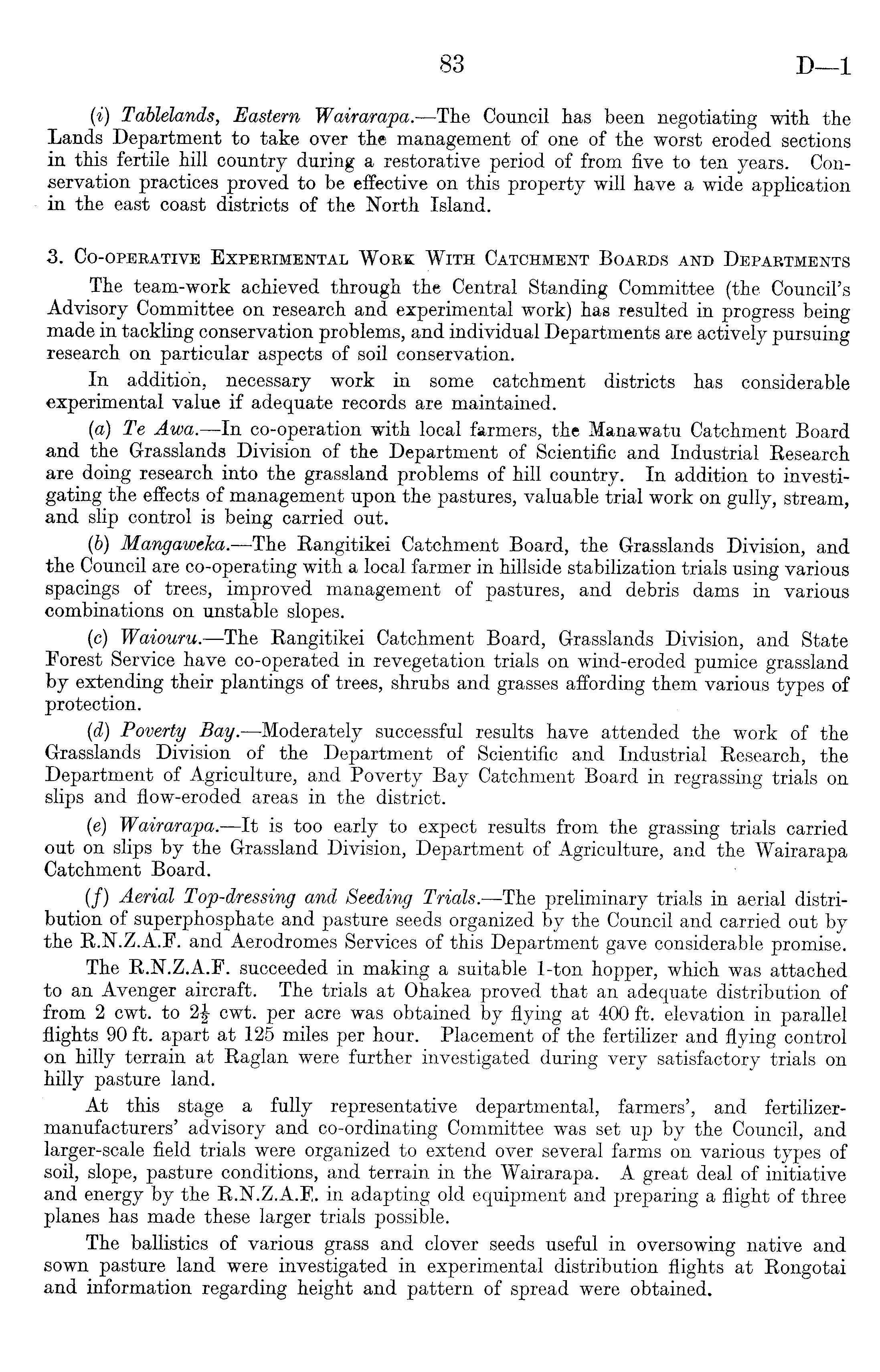 (i) Tablelands, Eastern Wairarapa. —The Council lias been negotiating with the Lands Department to take over the management of one of the worst eroded sections in this fertile hill country during a restorative period of from five to ten years. Conservation practices proved to be effective on this property will have a wide application in the east coast districts of the North Island. 3. Co-operative Experimental Work With Catchment Boards and Departments The team-work achieved through the Central Standing Committee (the Council's Advisory Committee on research and experimental work) has resulted in progress being made in tackling conservation problems, and individual Departments are actively pursuing research on particular aspects of soil conservation. In addition, necessary work in some catchment districts has considerable experimental value if adequate records are maintained. (a) Te Awa. —In co-operation with local farmers, the Manawatu Catchment Board and the Grasslands Division of the Department of Scientific and Industrial Research are doing research into the grassland problems of hill country. In addition to investigating the effects of management upon the pastures, valuable trial work on gully, stream, and slip control is being carried out. (b) MangaweJca.—The Rangitikei Catchment Board, the Grasslands Division, and the Council are co-operating with a local farmer in hillside stabilization trials using various spacings of trees, improved management of pastures, and debris dams in various combinations on unstable slopes. (c) Waiouru.—The Rangitikei Catchment Board, Grasslands Division, and State Forest Service have co-operated in re vegetation trials on wind-eroded pumice grassland by extending their plantings of trees, shrubs and grasses affording them various types of protection. (d) Poverty Bay.—Moderately successful results have attended the work of the Grasslands Division of the Department of Scientific and Industrial Research, the Department of Agriculture, and Poverty Bay Catchment Board in regrassing trials on slips and flow-eroded areas in the district. (e) Wairarapa.—lt is too early to expect results from the grassing trials carried out on slips by the Grassland Division, Department of Agriculture, and the Wairarapa Catchment Board. (/) Aerial Top-dressing and Seeding Trials. —The preliminary trials in aerial distribution of superphosphate and pasture seeds organized by the Council and carried out by the R.N.Z.A.F. and Aerodromes Services of this Department gave considerable promise. The R.N.Z.A.F. succeeded in making a suitable 1-ton hopper, which was attached to an Avenger aircraft. The trials at Ohakea proved that an adequate distribution of from 2 cwt. to 2£ cwt. per acre was obtained by flying at 400 ft. elevation in parallel flights 90 ft. apart at 125 miles per hour. Placement of the fertilizer and flying control on hilly terrain at Raglan were further investigated during very satisfactory trials on hilly pasture land. At this stage a fully representative departmental, farmers', and fertilizermanufacturers' advisory and co-ordinating Committee was set up by the Council, and larger-scale field trials were organized to extend over several farms on various types of soil, slope, pasture conditions, and terrain in the Wairarapa. A great deal of initiative and energy by the R.N.Z.A.F. in adapting old equipment and preparing a flight of three planes has made these larger trials possible. The ballistics of various grass and clover seeds useful in oversowing native and sown pasture land were investigated in experimental distribution flights at Rongotai and information regarding height and pattern of spread were obtained.