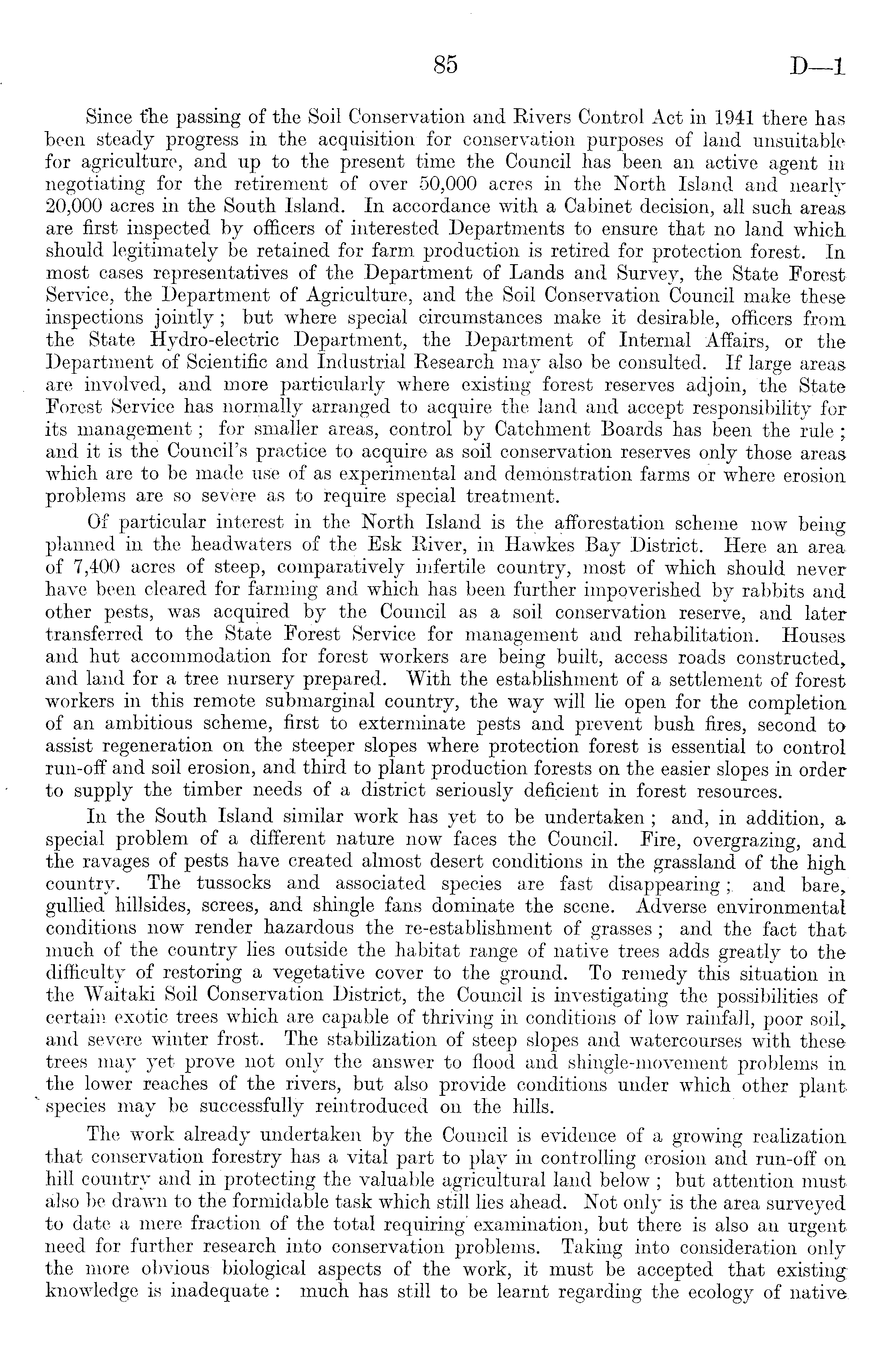 Since t'he passing of the Soil Conservation and Rivers Control Act in 1941 there has been steady progress in the acquisition for conservation purposes of land unsuitable for agriculture, and up to the present time the Council has been an active agent in negotiating for the retirement of over 50,000 acres in the North Island and nearly 20,000 acres in the South Island. In accordance with a Cabinet decision, all such areas are first inspected by officers of interested Departments to ensure that no land which should legitimately be retained for farm production is retired for protection forest. In most cases representatives of the Department of Lands and Survey, the State Forest Service, the Department of Agriculture, and the Soil Conservation Council make these inspections jointly; but where special circumstances make it desirable, officers from the State Hydro-electric Department, the Department of Internal Affairs, or the Department of Scientific and Industrial Research may also be consulted. If large areas are involved, and more - particularly where existing-forest reserves adjoin, the State Forest Service has normally arranged to acquire the land and accept responsibility for its management; for smaller areas, control by Catchment Boards has been the rule; and it is the Council's practice to acquire as soil conservation reserves only those areas which are to be made use of as experimental and demonstration farms or where erosion problems are so severe as to require special treatment. Of particular interest in the North Island is the afforestation scheme now being planned in the headwaters of the Esk River, in Hawkes Bay District. Here an area of 7,400 acres of steep, cqm/paratively infertile country, most of which should never have been cleared for farming and which has been further impoverished by rabbits and other pests, was acquired by the Council as a soil conservation reserve, and later transferred to the State Forest Service for management and rehabilitation. Houses and hut accommodation for forest workers are being built, access roads constructed, and land for a tree nursery prepared. With the establishment of a settlement of forest workers in this remote submarginal country, the way will lie open for the completion of an ambitious scheme, first to exterminate pests and prevent bush fires, second to assist regeneration on the steeper slopes where protection forest is essential to control run-off and soil erosion, and third to plant production forests on the easier slopes in order to supply the timber needs of a district seriously deficient in forest resources. In the South Island similar work has yet to be undertaken ; and, in addition, a special problem of a different nature now faces the Council. Fire, overgrazing, and the ravages of pests have created almost desert conditions in the grassland of the high country. The tussocks and associated species are fast disappearingand bare, gullied hillsides, screes, and shingle fans dominate the scene. Adverse environmental conditions now render, hazardous the re-establishment of grasses; and the fact that much of the country lies outside the habitat range of native trees adds greatly to the difficulty of restoring a vegetative cover to the ground. To remedy this situation in the Waitaki Soil Conservation District, the Council is investigating the possibilities of certain exotic trees which are capable of thriving in conditions of low rainfall, poor soil, and severe winter frost. The stabilization of steep slopes and watercourses with these trees may yet prove not only the answer to flood and shingle-movement problems in the lower reaches of the rivers, but also provide conditions under which other plant species may be successfully reintroduced on the hills. The work already undertaken by the Council is evidence of a growing realization that conservation forestry has a vital part to play in controlling erosion and run-off on hill country and in protecting the valuable agricultural land beiow; but attention must also be drawn to the formidable task which still lies ahead. Not only is the area surveyed to date a mere fraction of the total requiring' examination, but there is also an urgent need for further research into conservation problems. Taking into consideration only the more obvious biological aspects of the work, it must be accepted that existing knowledge is inadequate : much has still to be learnt regarding the ecology of native